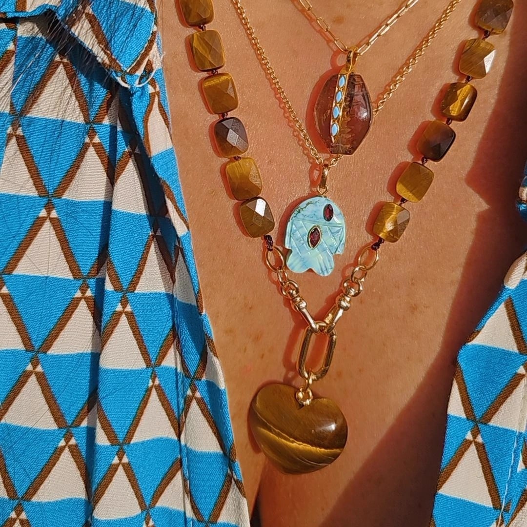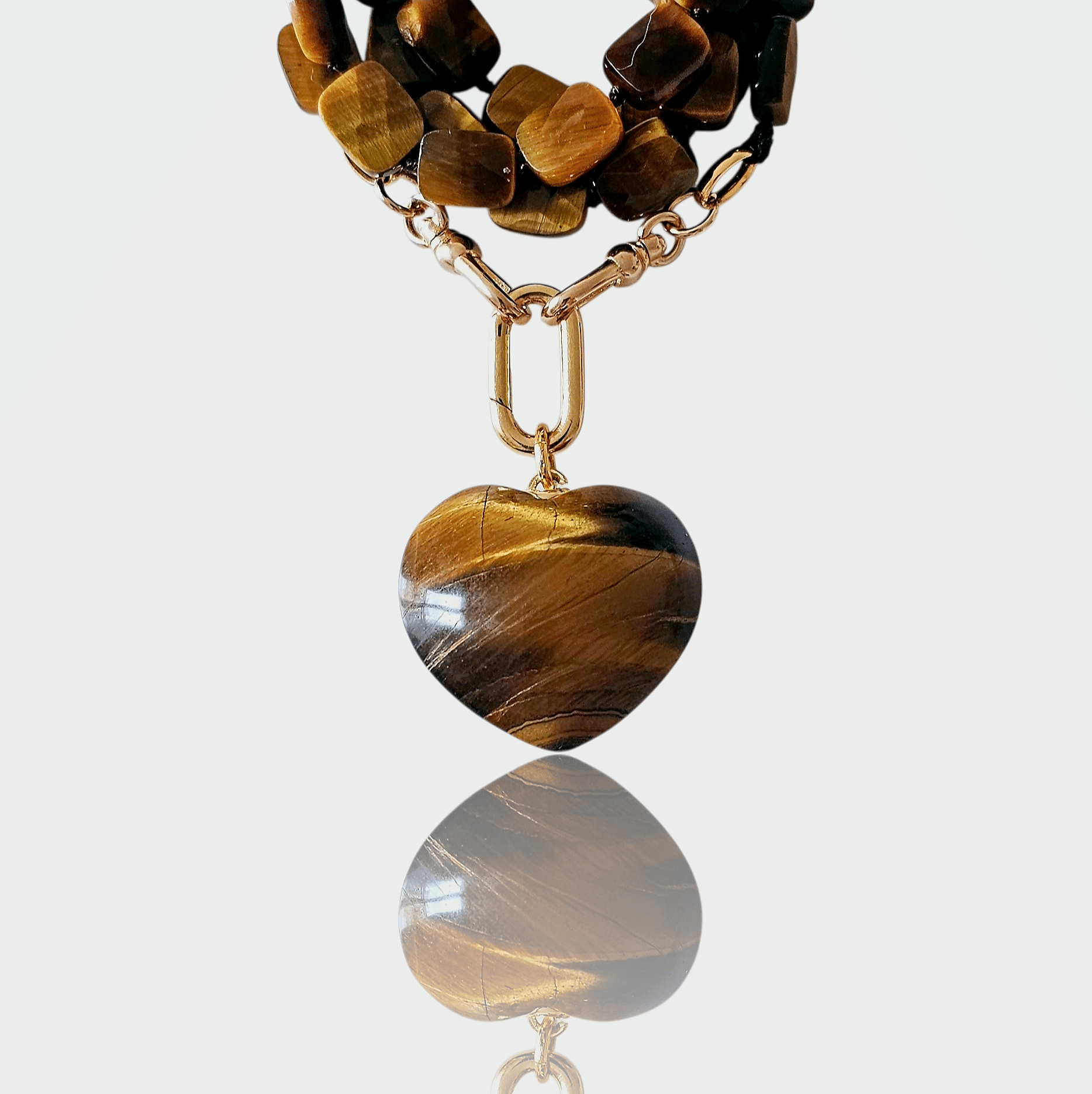 Ce sautoir est sublimé par un pendentif cœur en pierre naturelle, également en œil de tigre, suspendu à un locket mousqueton permettant ainsi la possibilité pour vous d’échanger ou pas de pendentif.
