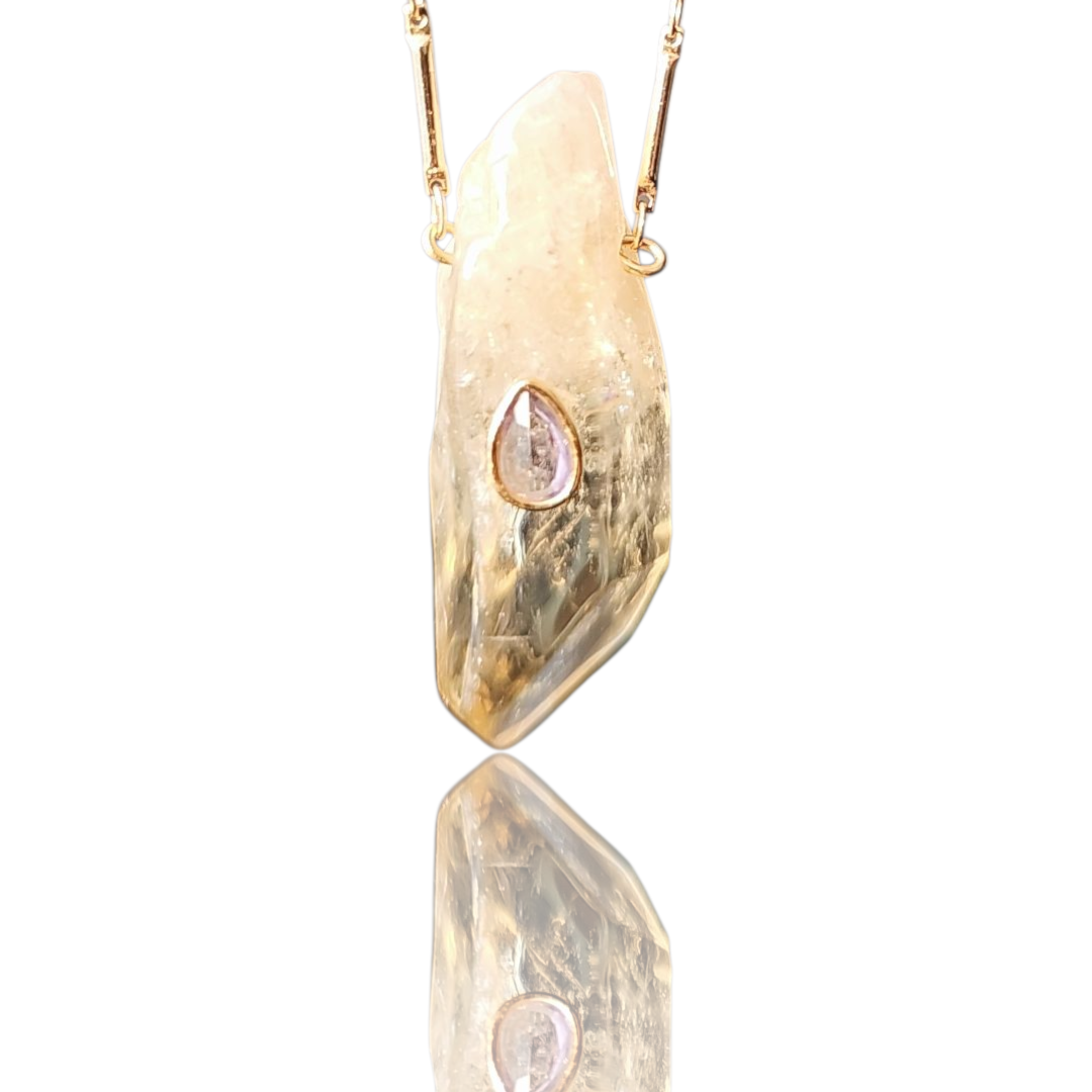 Ce collier met en lumière une citrine, pierre naturelle aux reflets dorés et translucides, soigneusement taillée et polie tout en conservant son caractère brut et organique. En son centre, une délicate goutte améthyste lavande sertie, apporte une touche subtile de lumière et de raffinement.