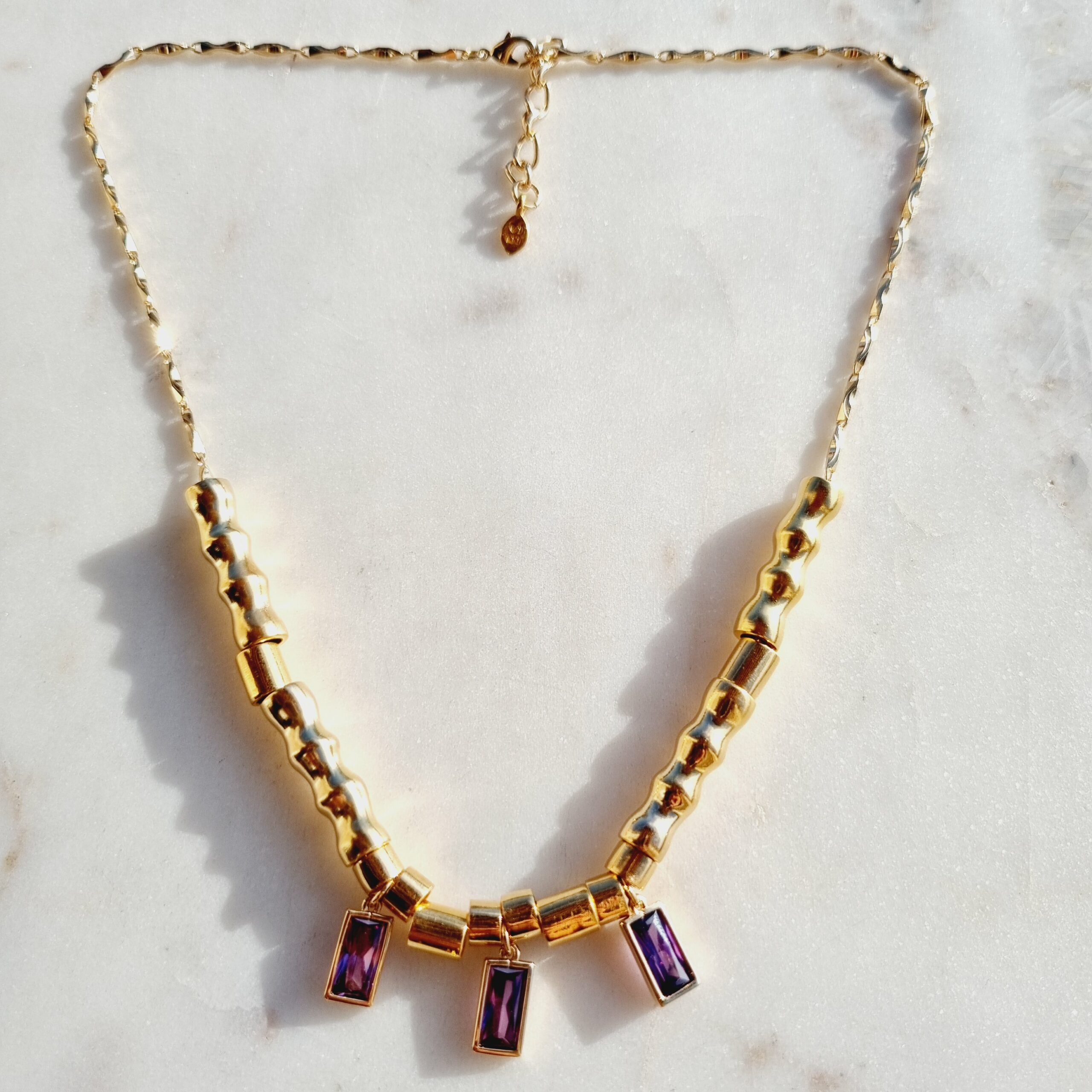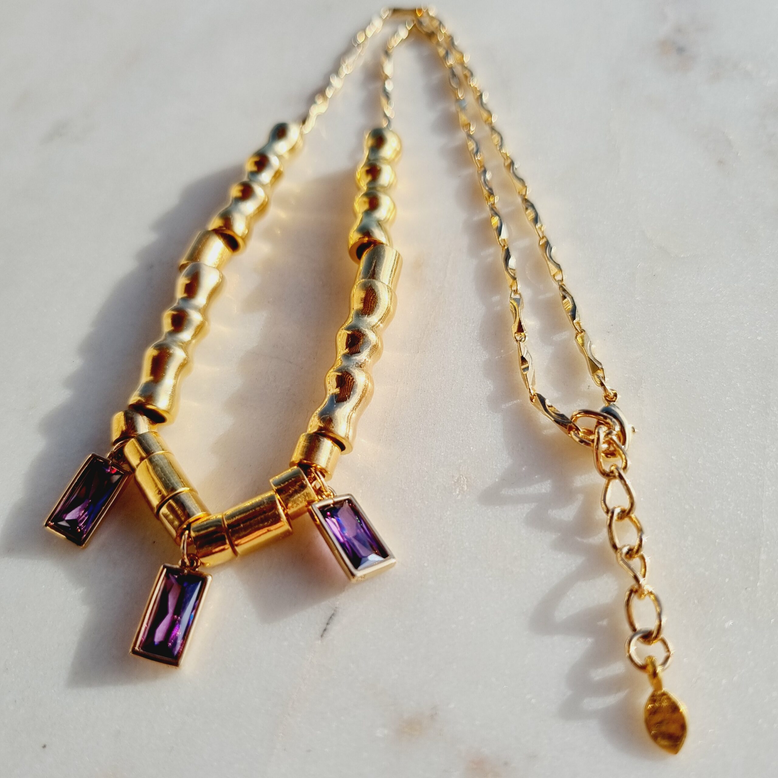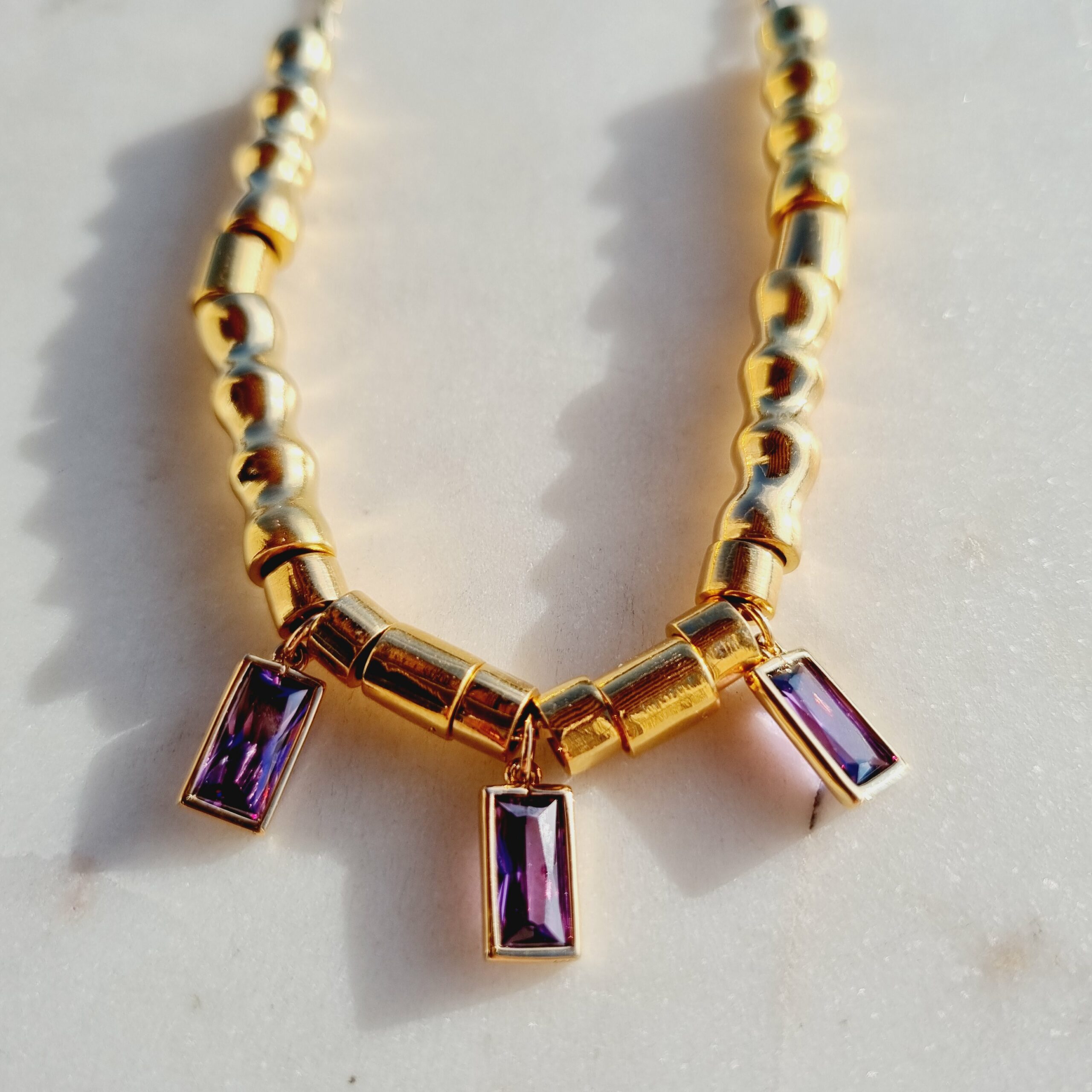 Collier sur chaine torsadée plaquée or 3 microns, avec éléments mobiles et pendentifs zircon violet.