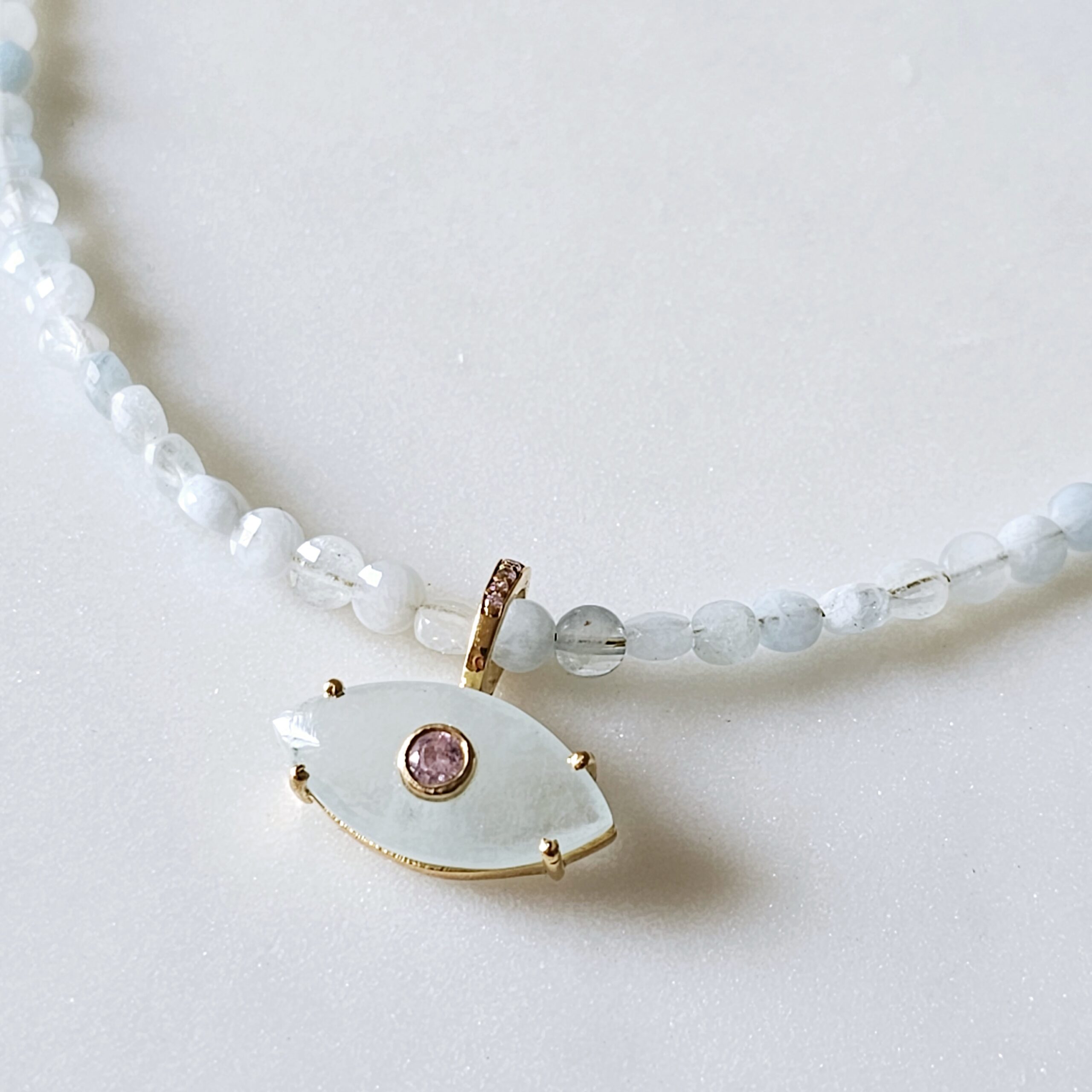 Ainara Bélière est tout en aigue-marine facettée et son œil est en milky acquamarine.