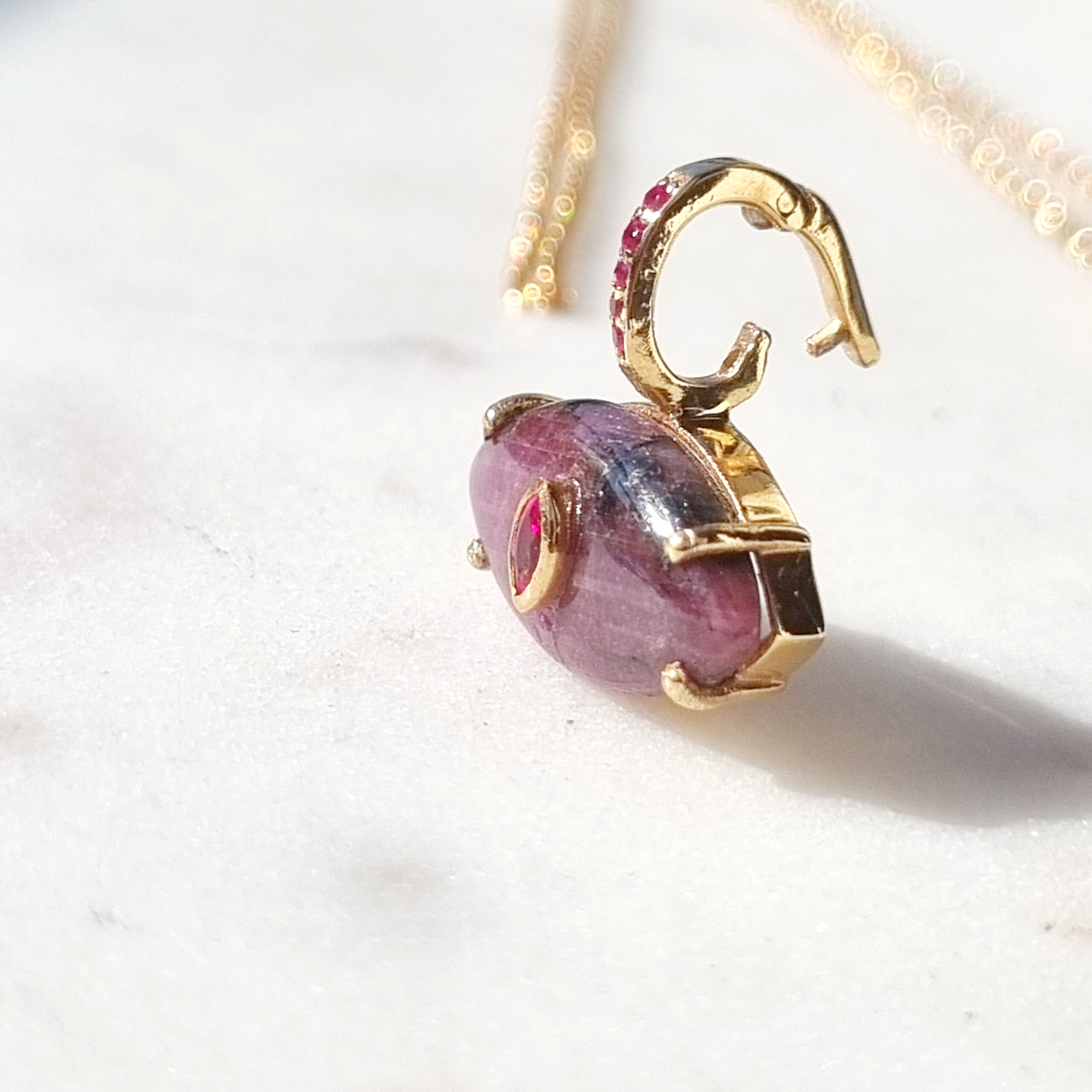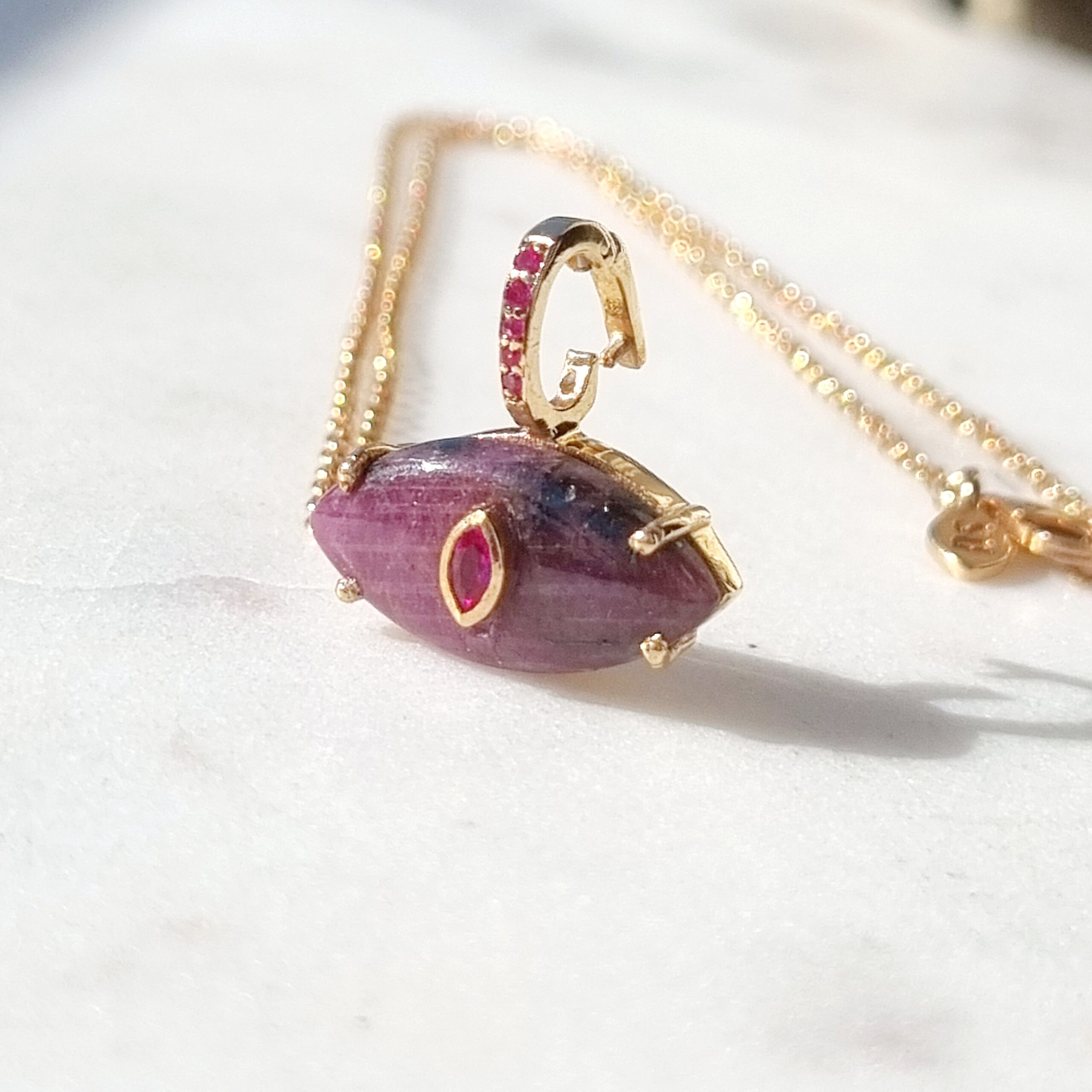 Ainara est un bijou de protection mais aussi un talisman porte bonheur intemporel et tendance, est proposé ici avec une pierre principale en Rubis et son iris marquise avec un zircon grenat. Sa bélière détachable vous permet de changer de chaine. Chaque pierre naturelle est unique et donc différente.