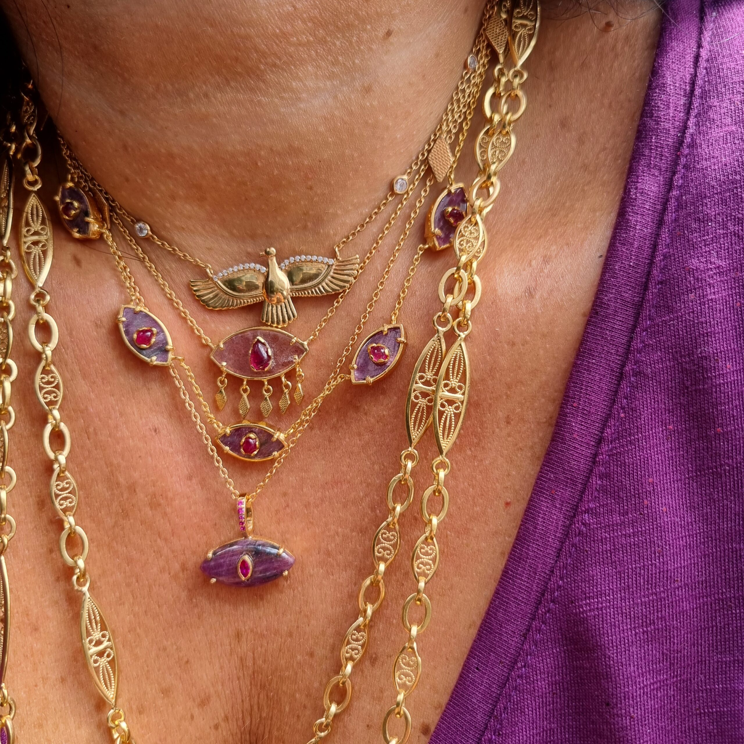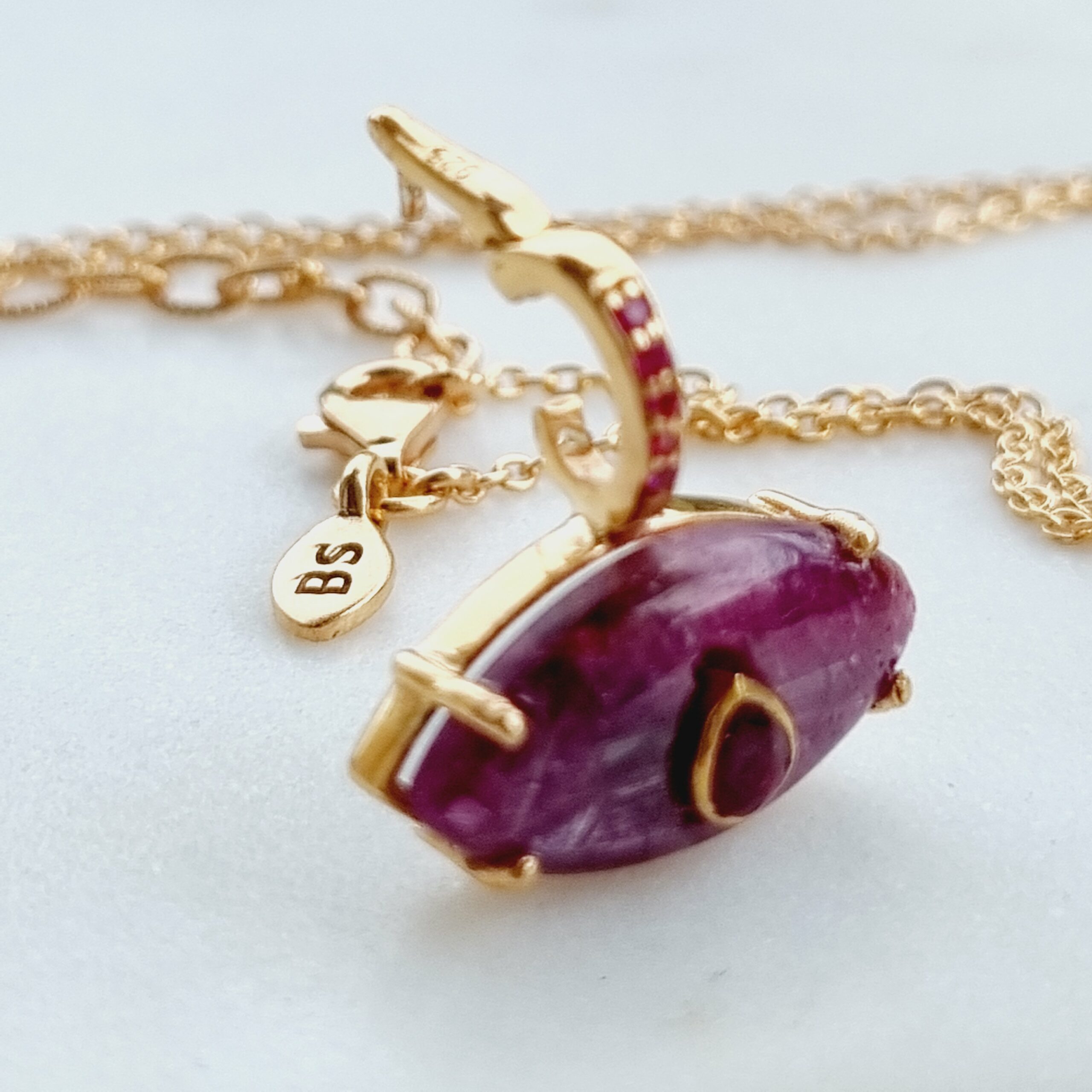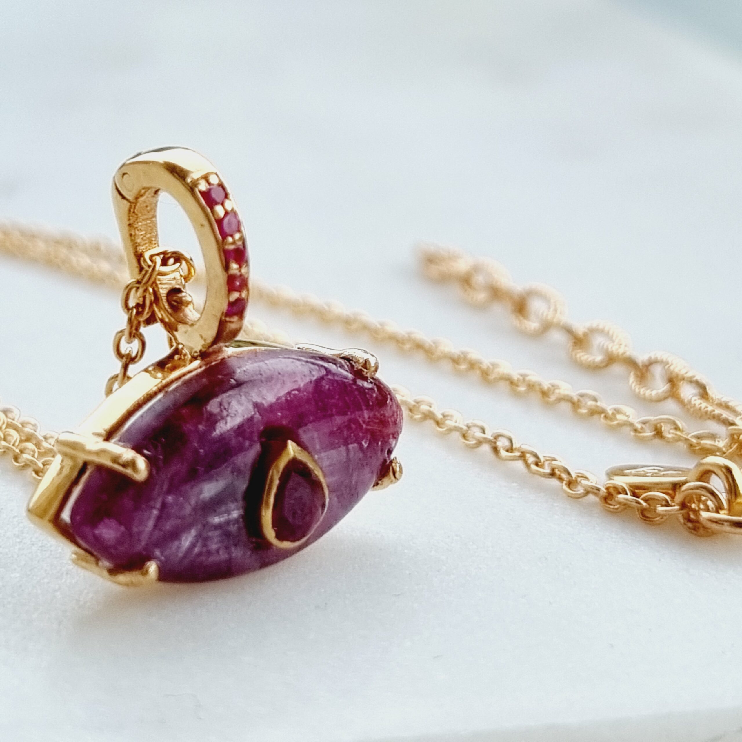 Ainara est un bijou de protection mais aussi un talisman porte bonheur intemporel et tendance, est proposé ici avec une pierre principale en Rubis et son iris goutte avec un zircon grenat. Sa bélière détachable vous permet de changer de chaine. Chaque pierre naturelle est unique et donc différente.