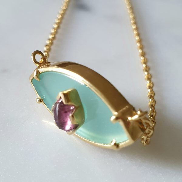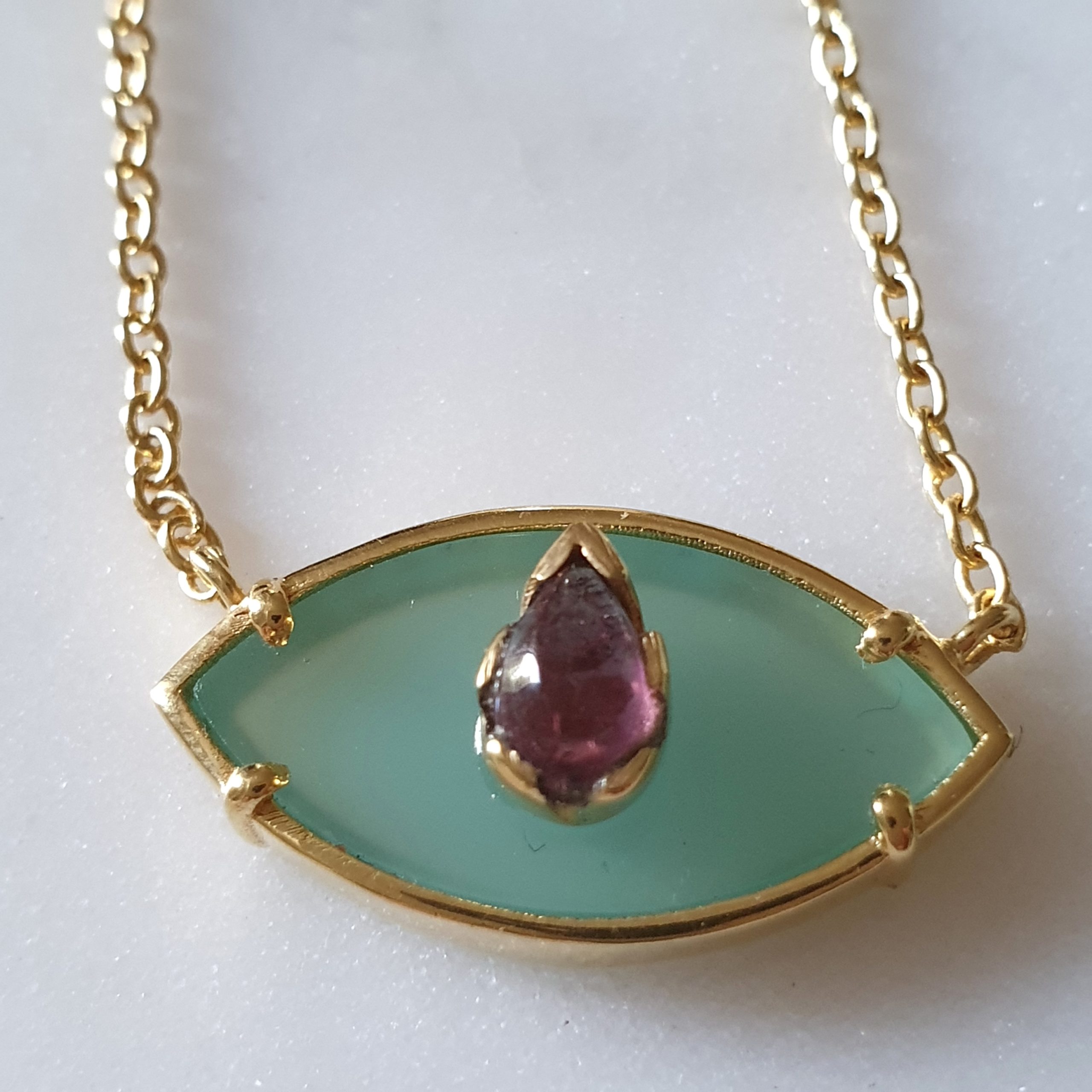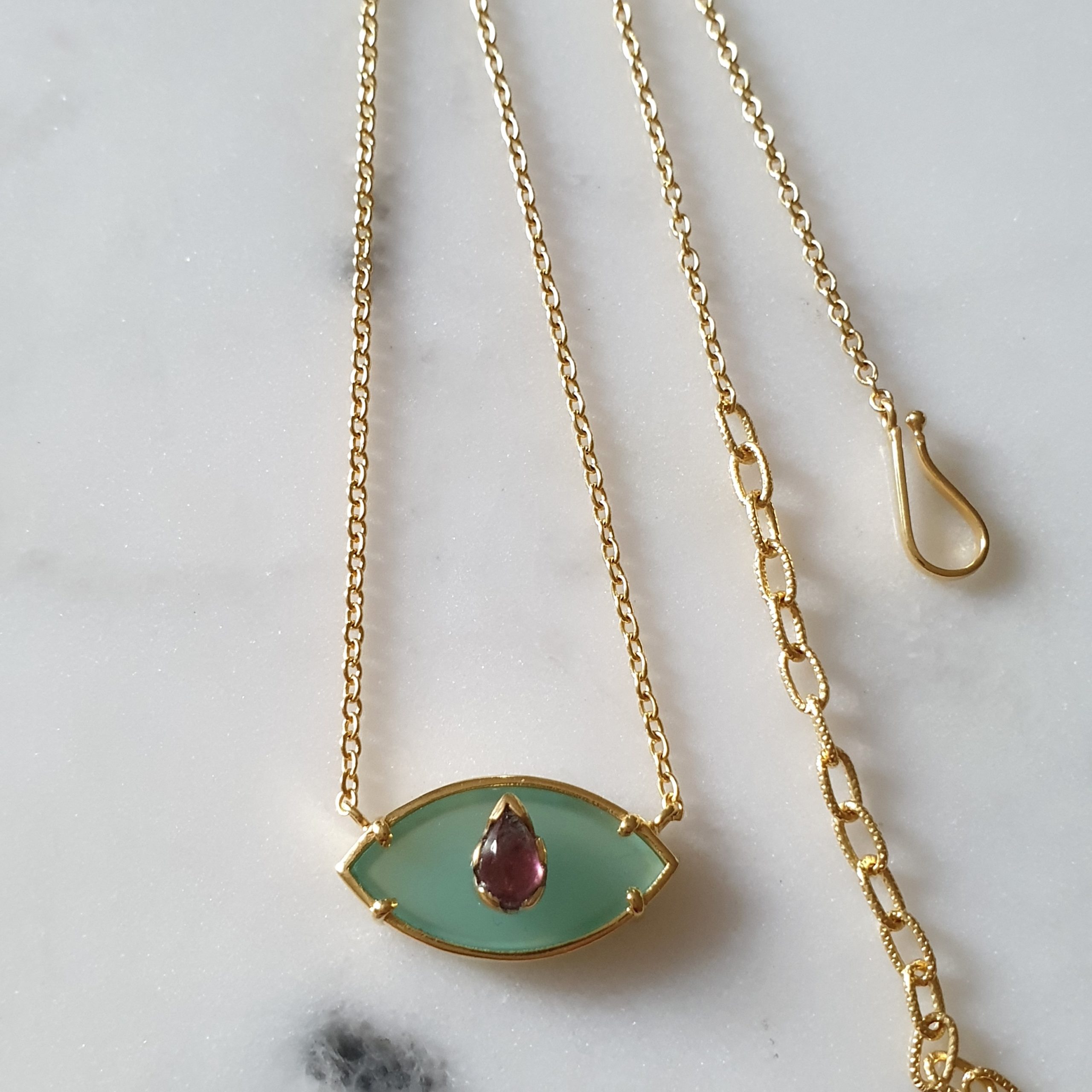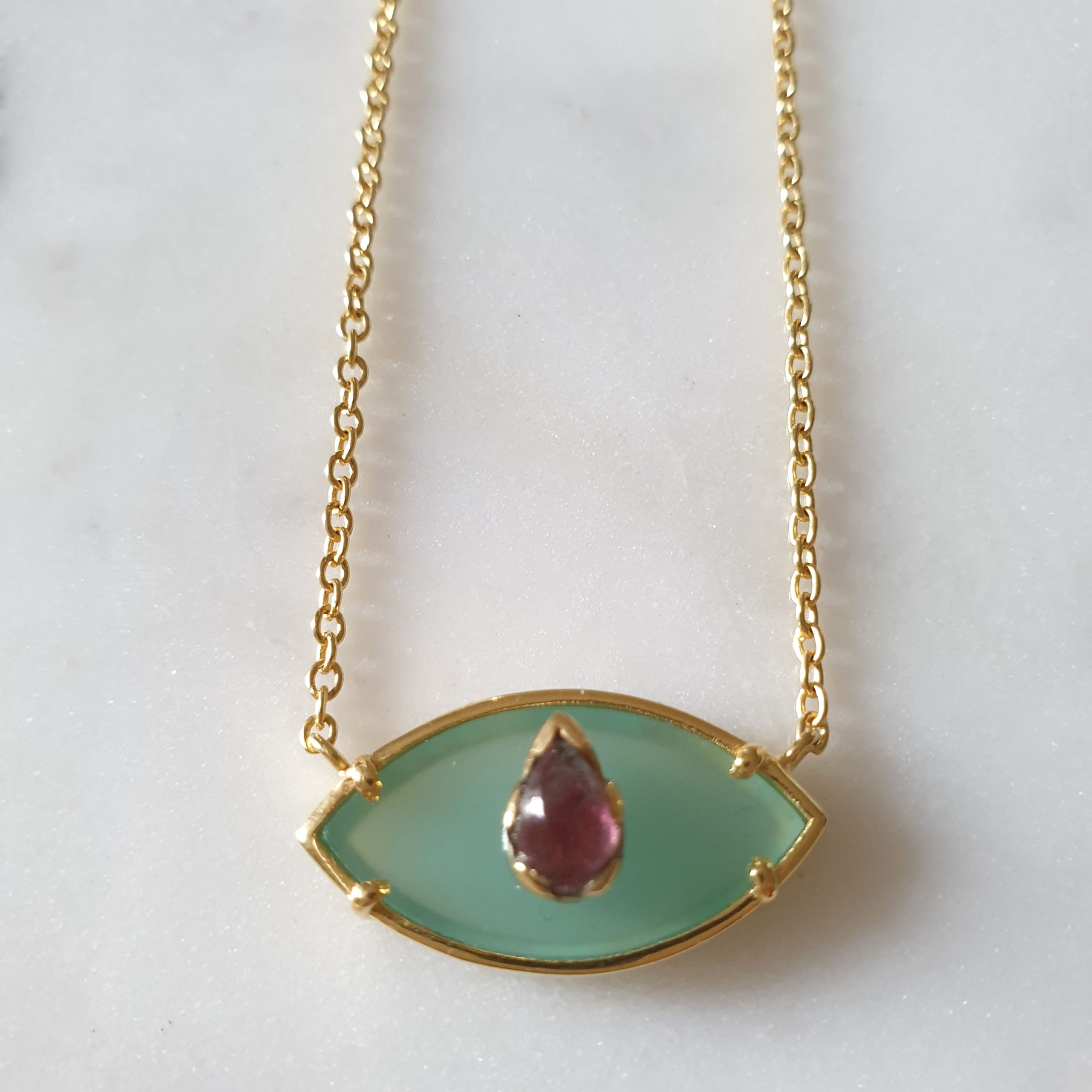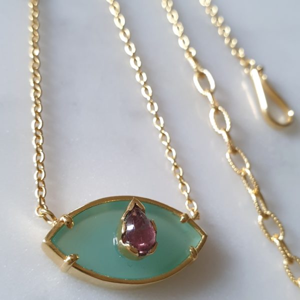 AINARA est un bijou de protection, un talisman porte bonheur intemporel et tendance. Il est proposé ici avec une pierre centrale Calcédoine verte et l’iris en tourmaline rose. La chaine et le serti sont en vermeil plaqués or.