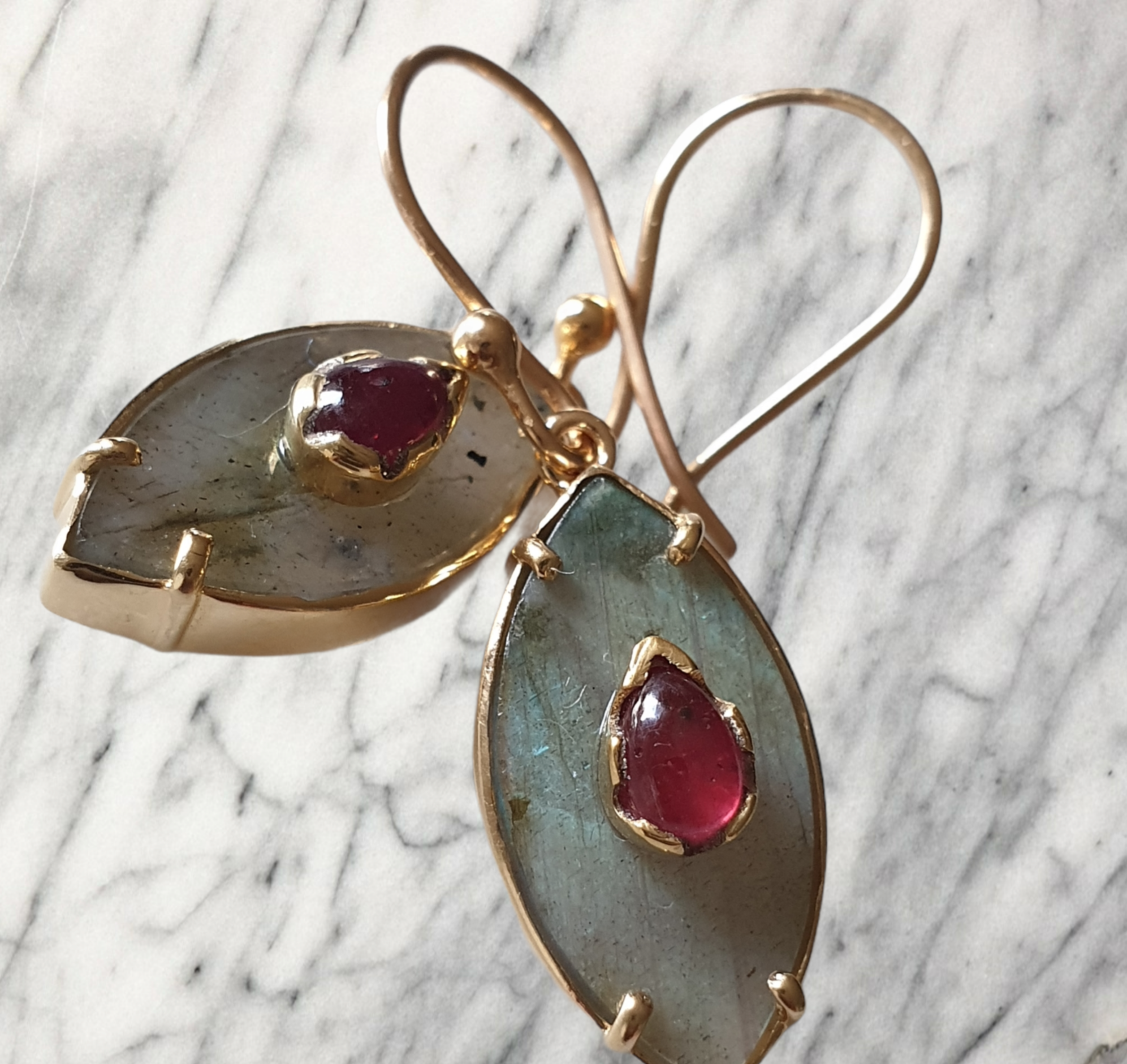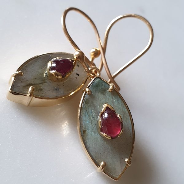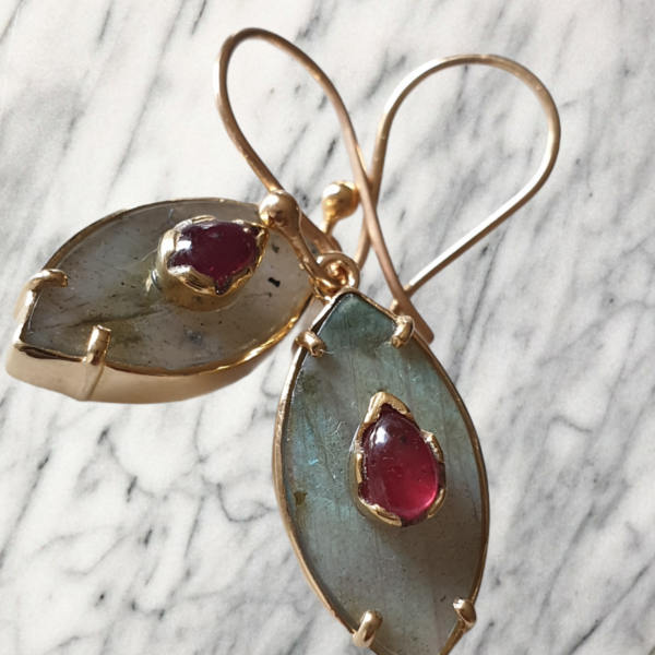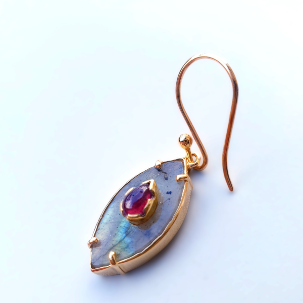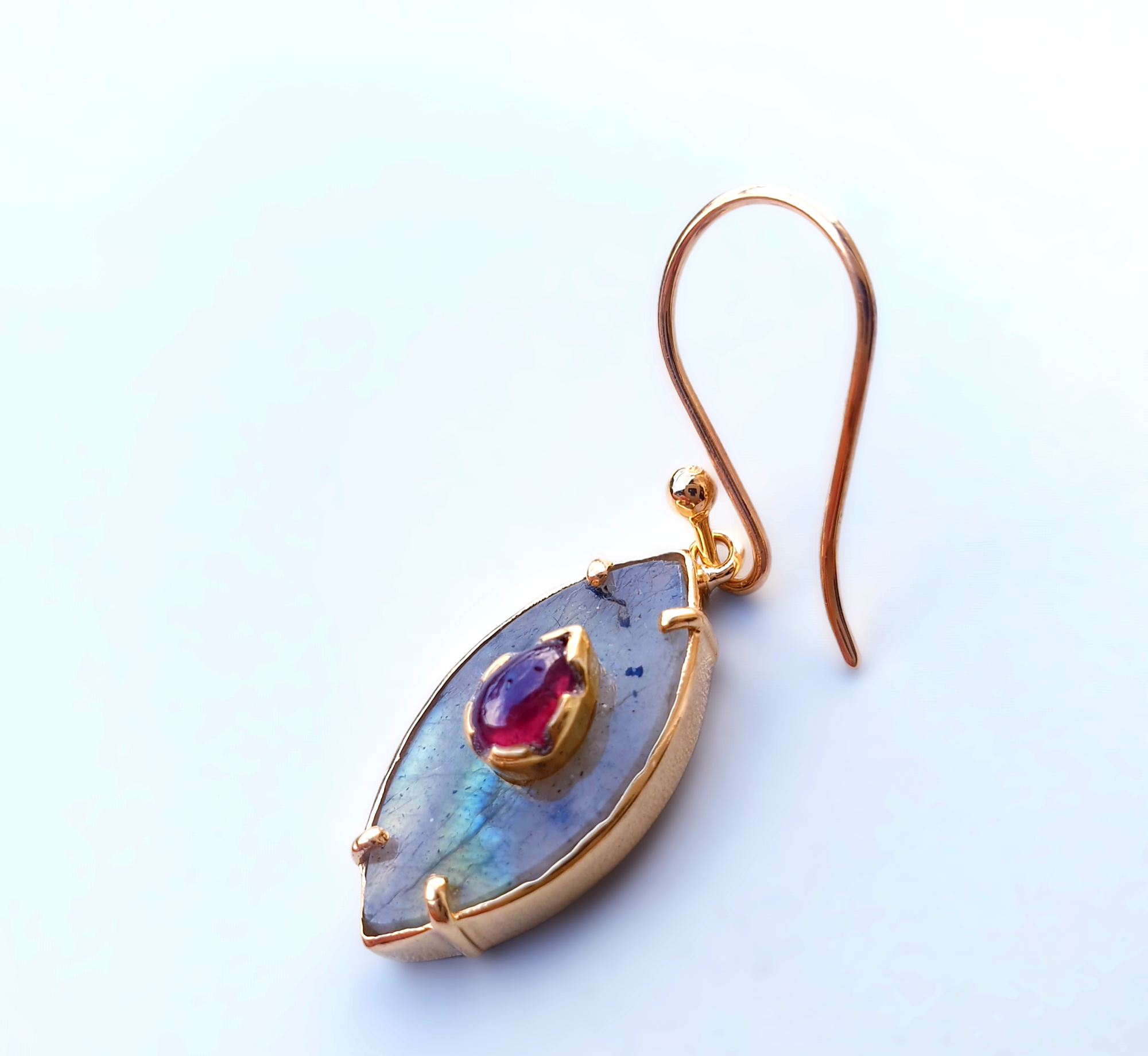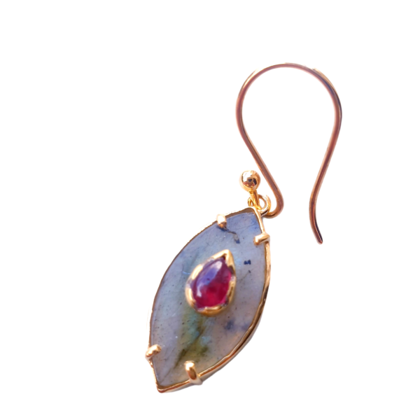 AINARA earring est la version identique du collier Ainara. Elle est proposée ici en Labradorite avec l’iris en rubis et toute en vermeil plaquée or.
