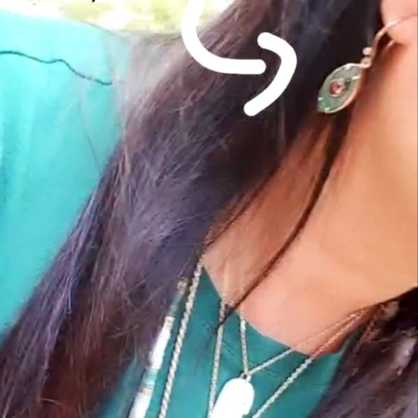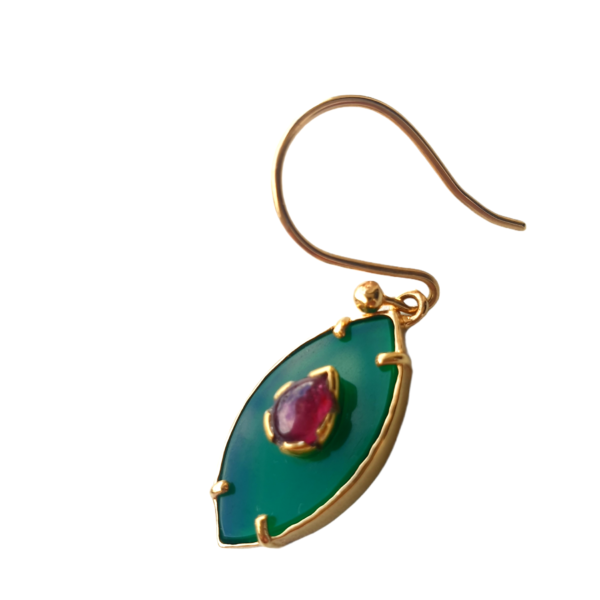 AINARA earring est la version identique du collier AINARA. Elle est proposée ici en version Onyx verte avec l’iris en rubis et toute en vermeil plaquée or.