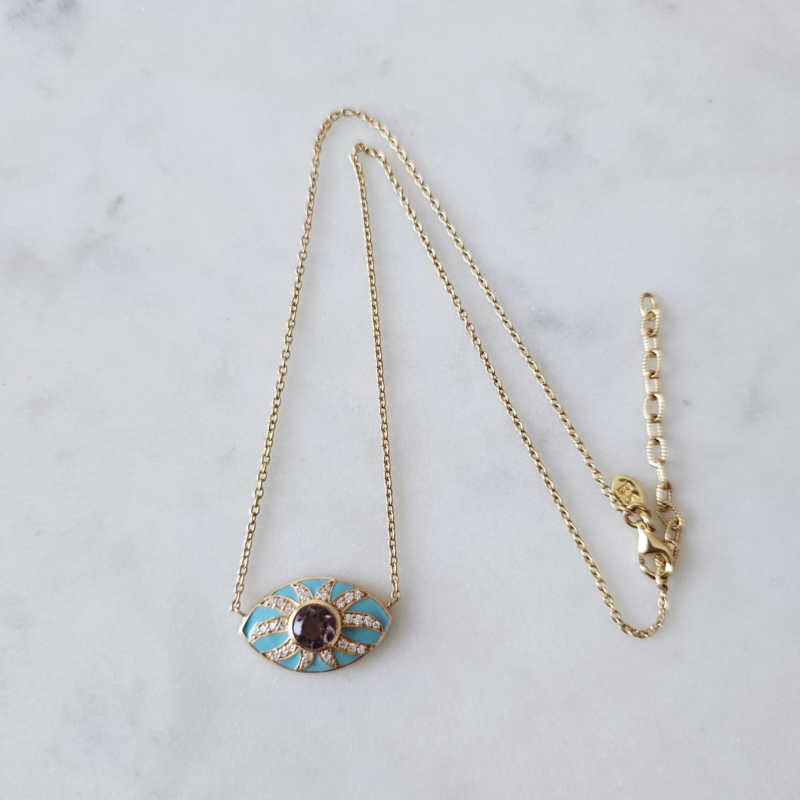 AINARA est un bijou de protection, un talisman porte bonheur intemporel et tendance. Il est proposé ici avec une pierre centrale en Turquoise Mohave et l’iris en rubis. La chaine et le serti sont en vermeil plaqué or.