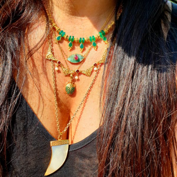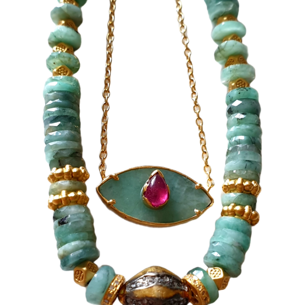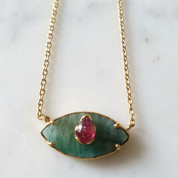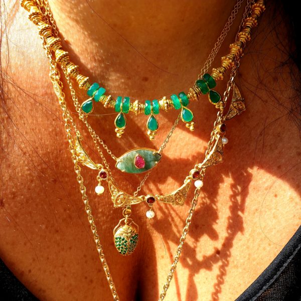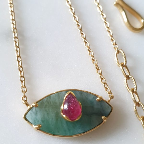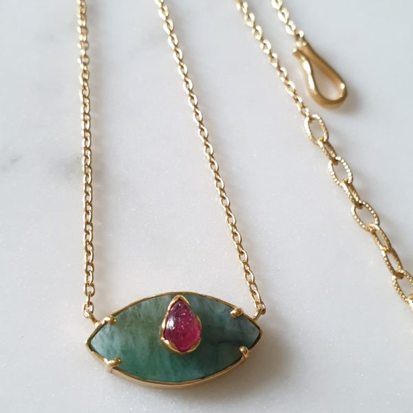 AINARA est un bijou de protection, un talisman porte bonheur intemporel et tendance. Il est proposé ici avec une pierre centrale d’émeraude et l’iris en rubis. La chaine et le serti sont en vermeil plaqués or.