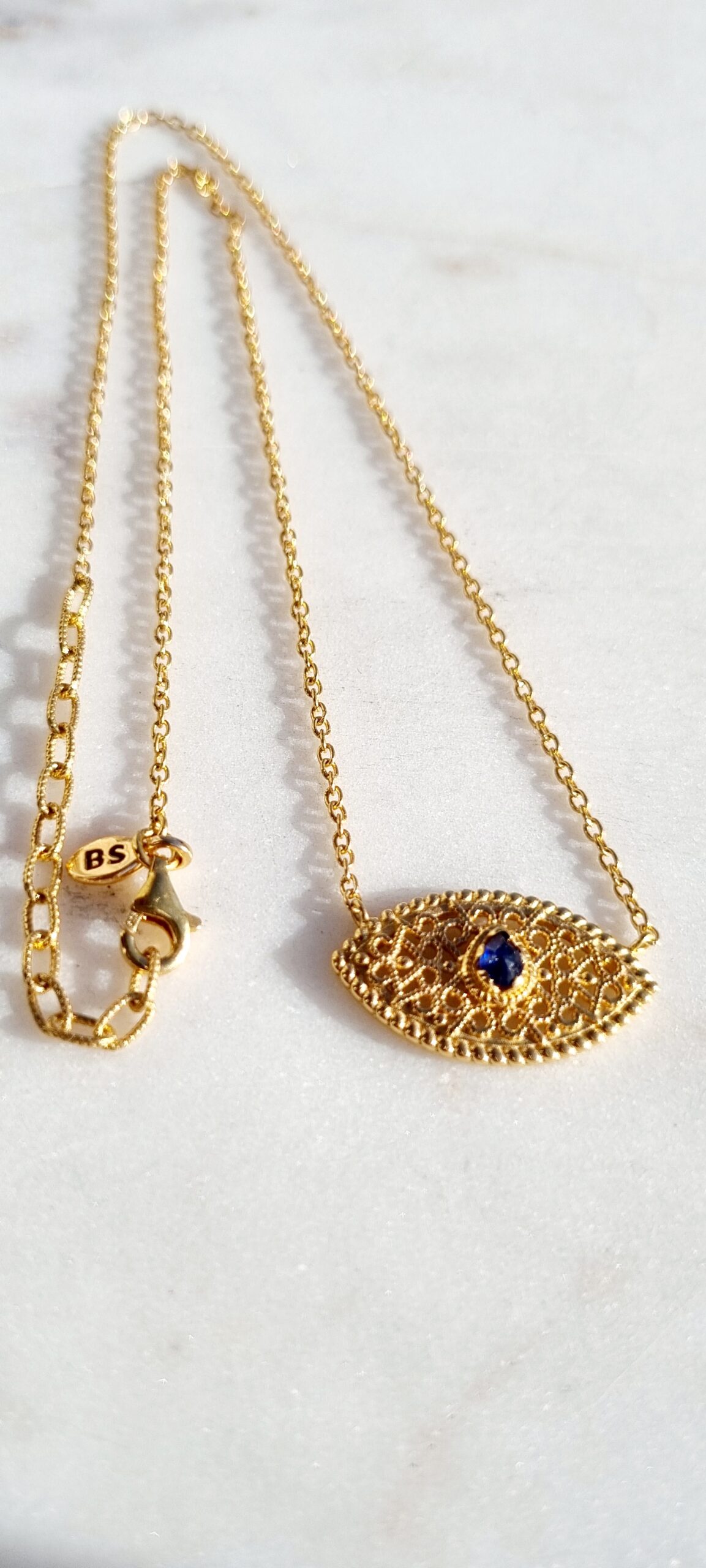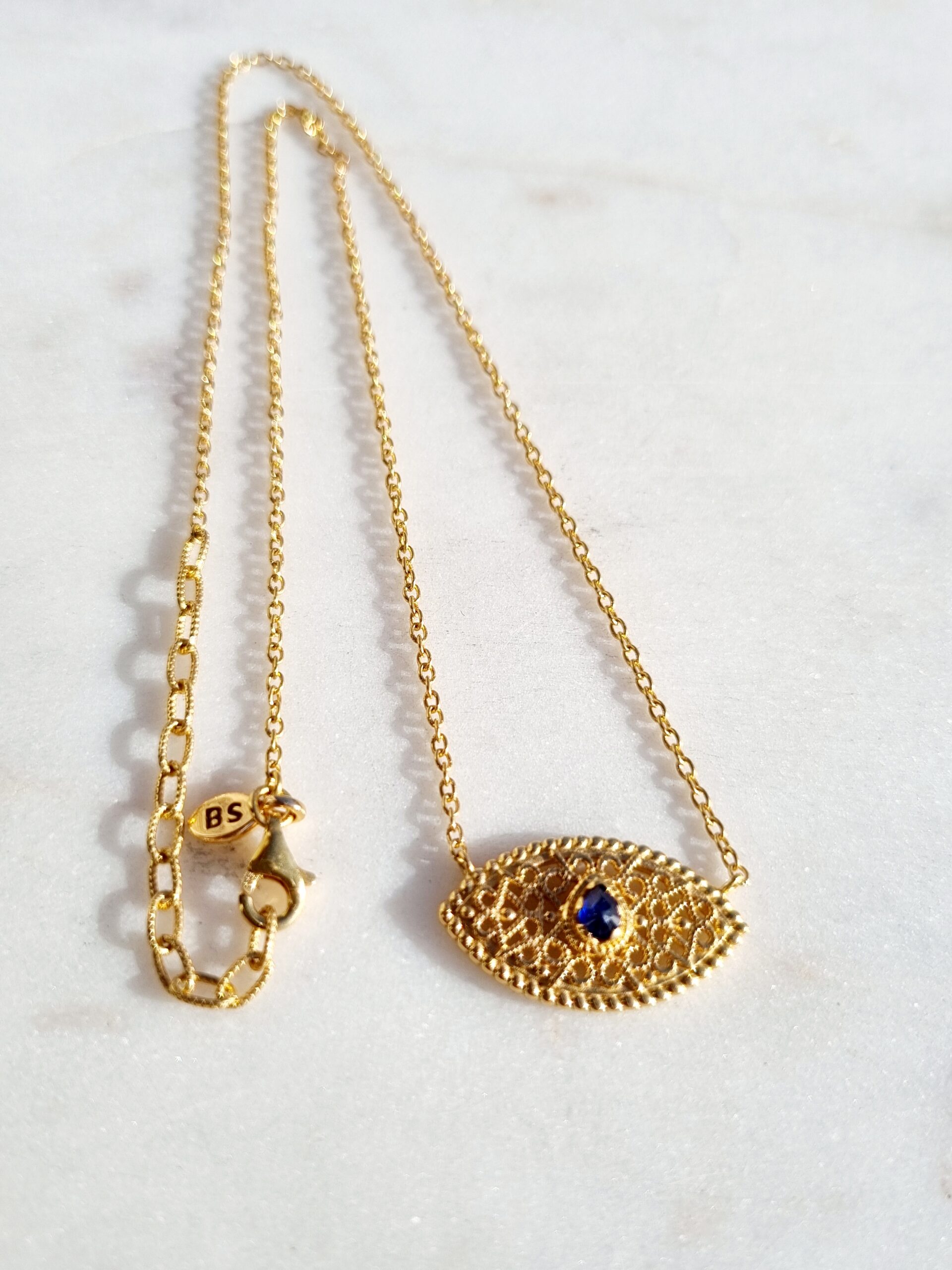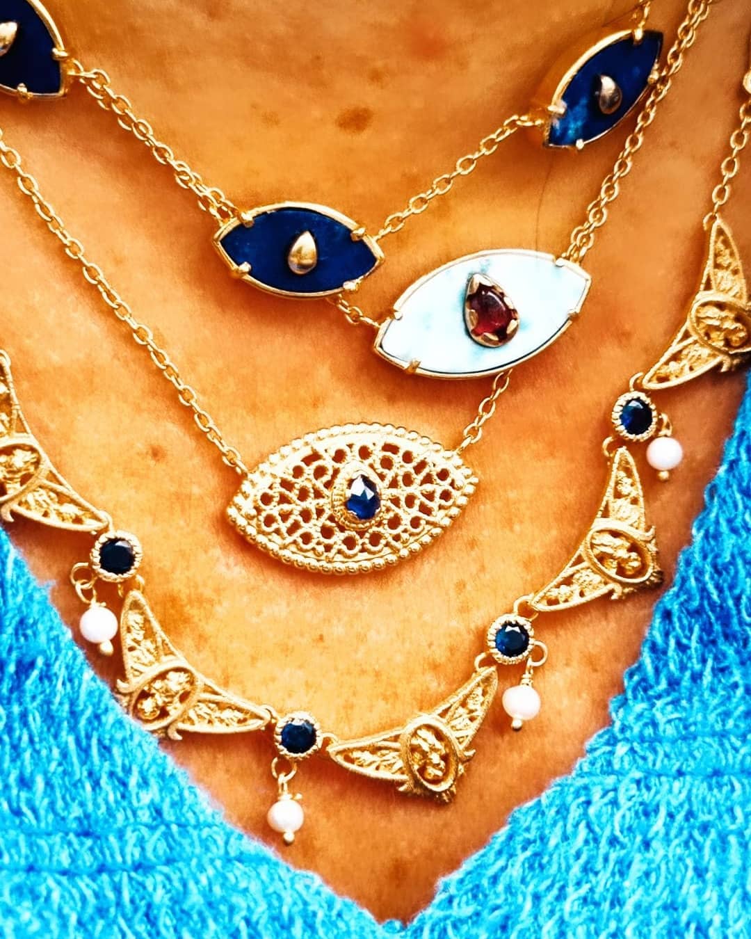 AINARA filigrane est une déclinaison du même modèle en pierre naturelle. Il a été pensé ici pour retrouver l’esprit vintage des bijoux anciens grâce à cette dentelle filigrane du pendentif oeil. Il est incrusté au centre d’un saphir bleu, qui fait office d’iris en forme de bindie. Il est en argent massif plaqué or.