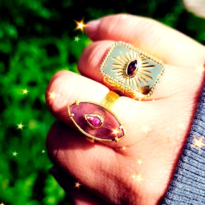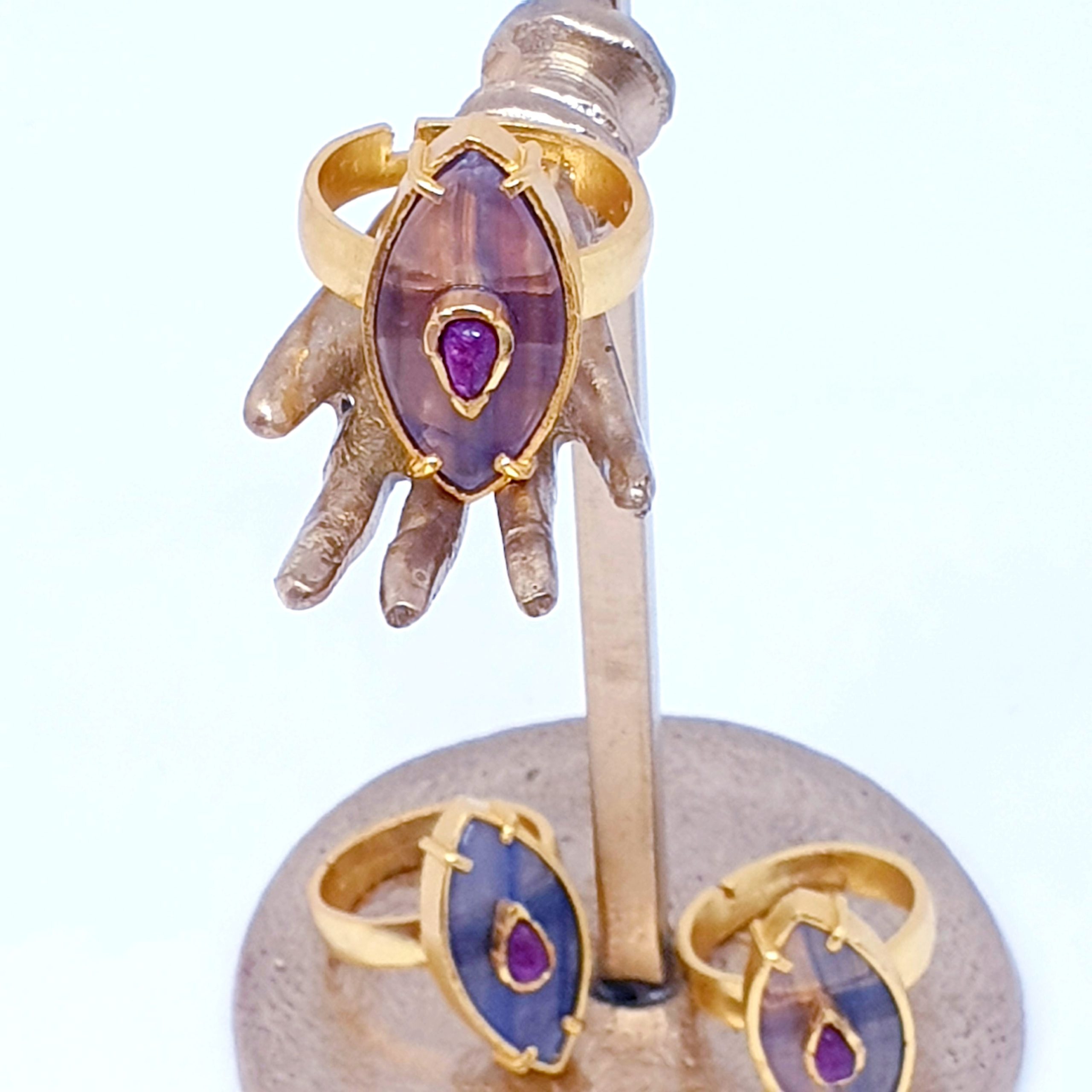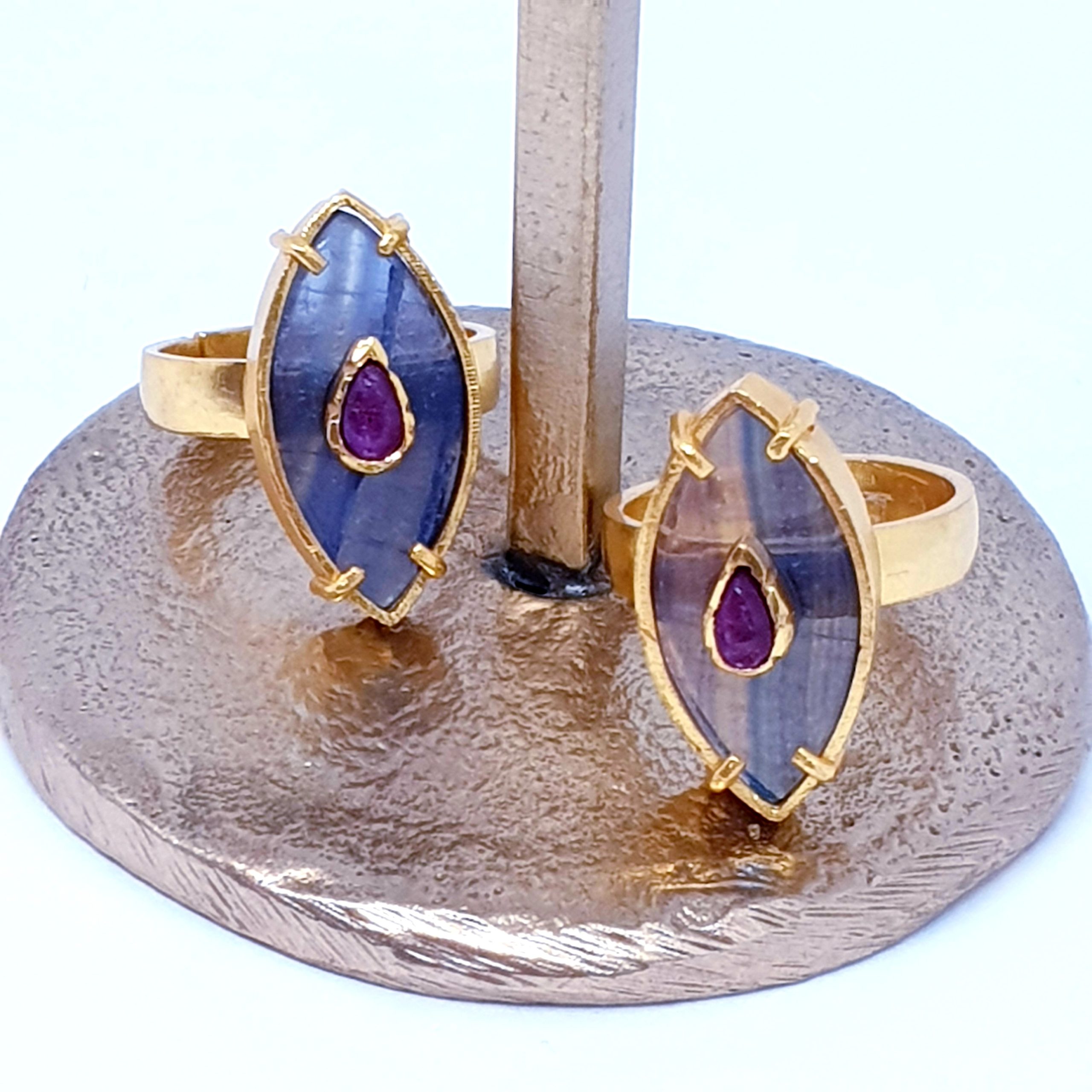 La bague marquise AINARA est le complément du collier Ainara, version FLUORITE avec au centre une pierre rubis sertie vermeil plaquée or .