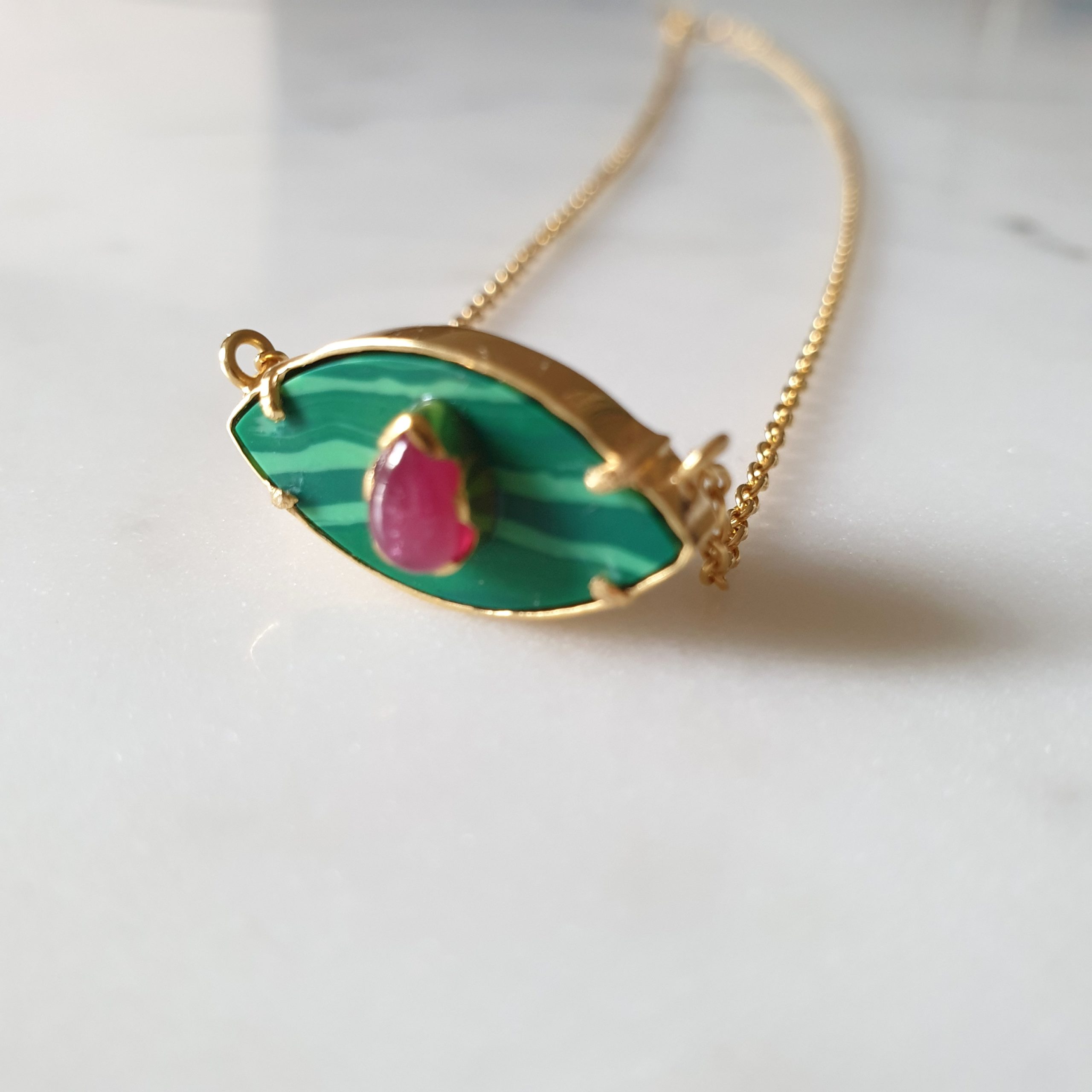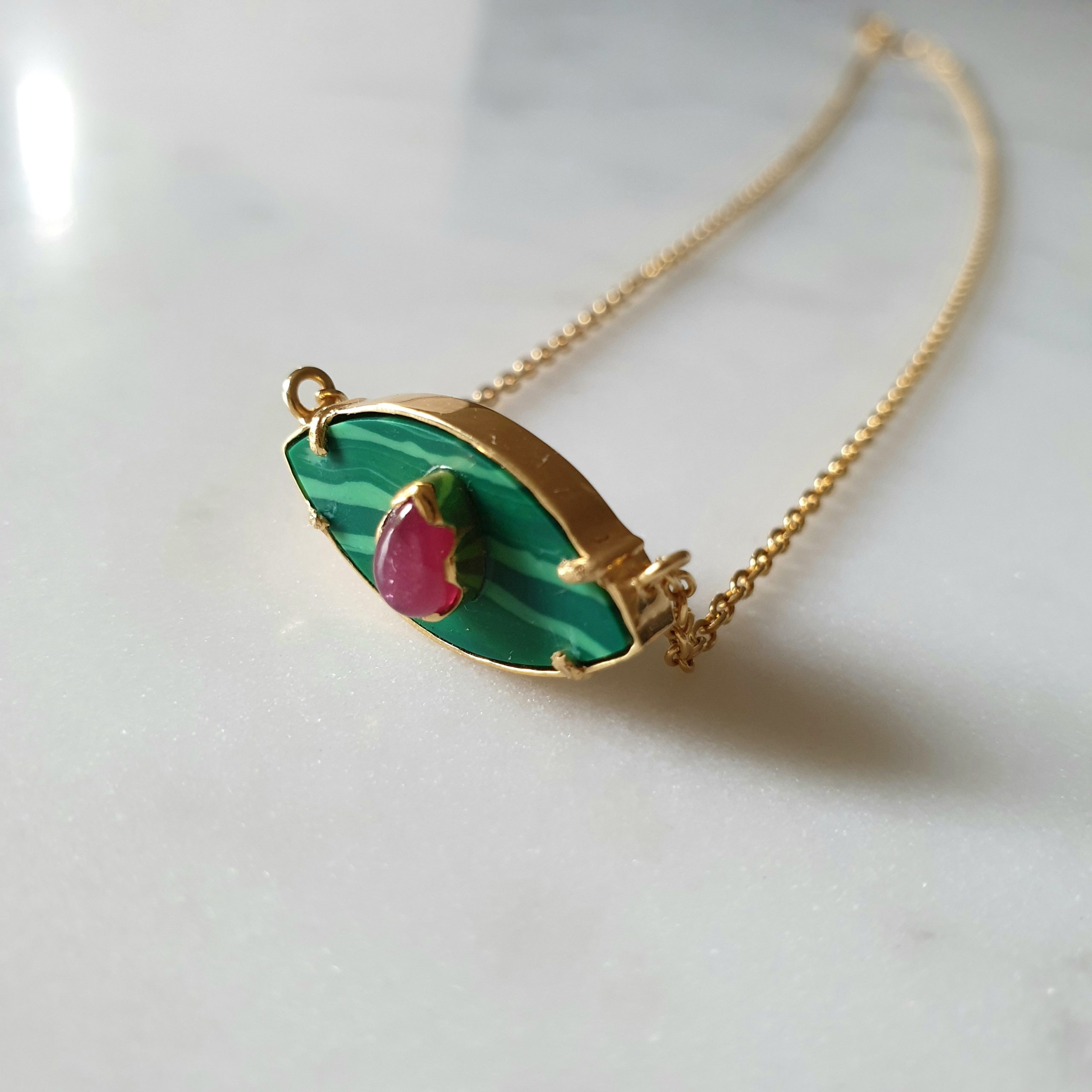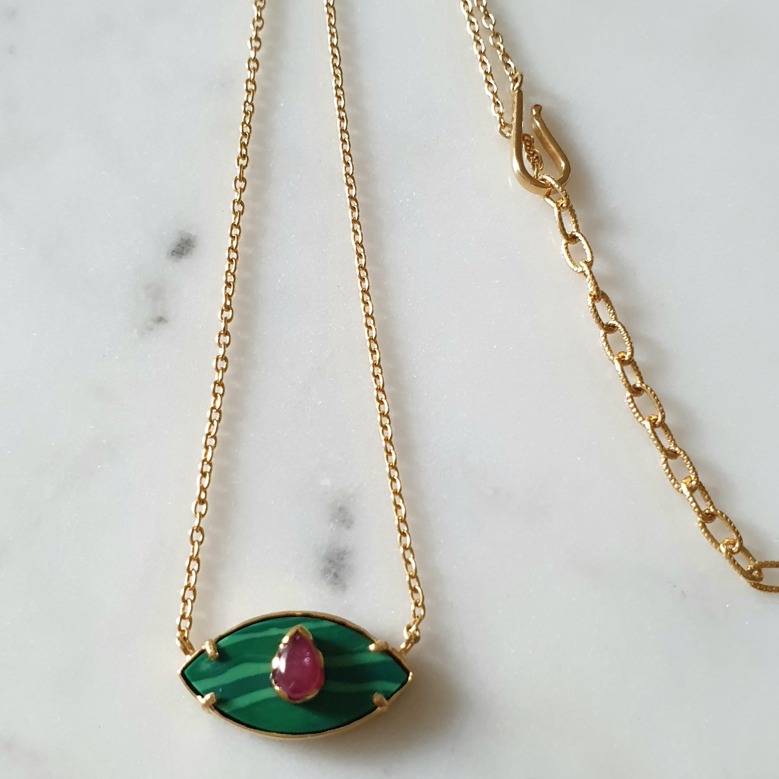AINARA est un bijou de protection, un talisman porte bonheur intemporel et tendance. Il est proposé ici avec une pierre centrale Malachite et l’iris en Rubis. La chaine et le serti sont en vermeil plaqués or.