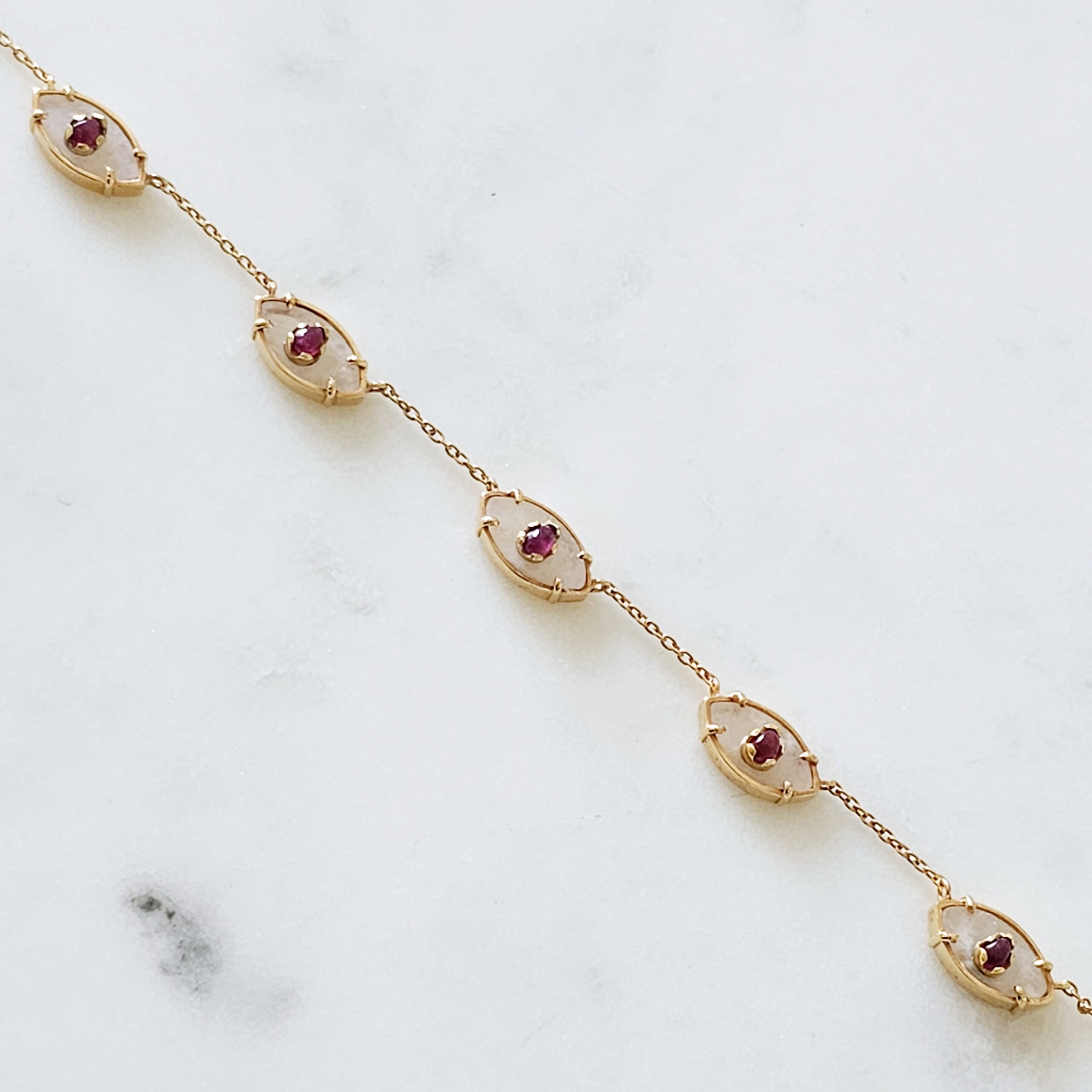 AINARA est un bijou de protection, un talisman porte bonheur intemporel et très tendance. La version multiples est composée de cinq mini yeux, ici proposée en labradorite blanche et chaque iris en rubis .