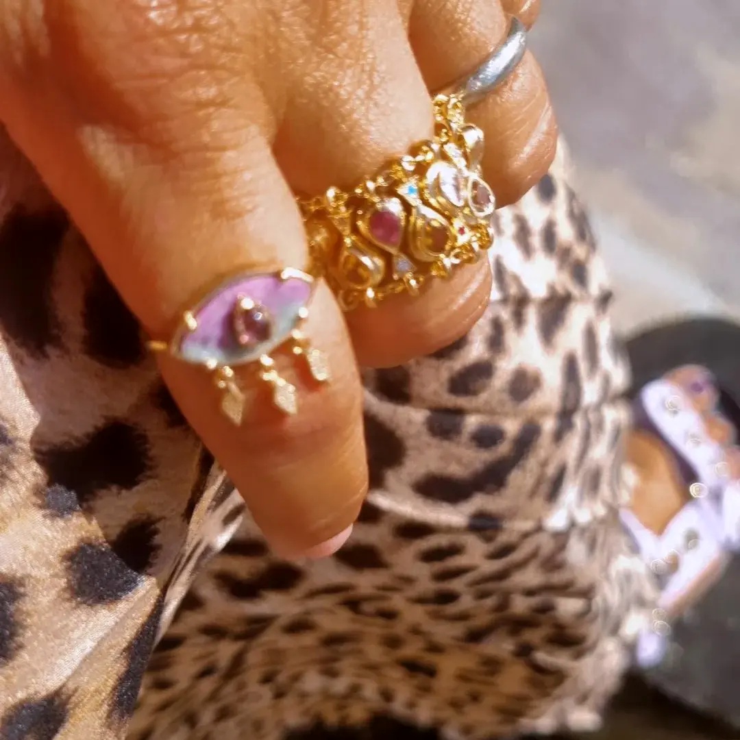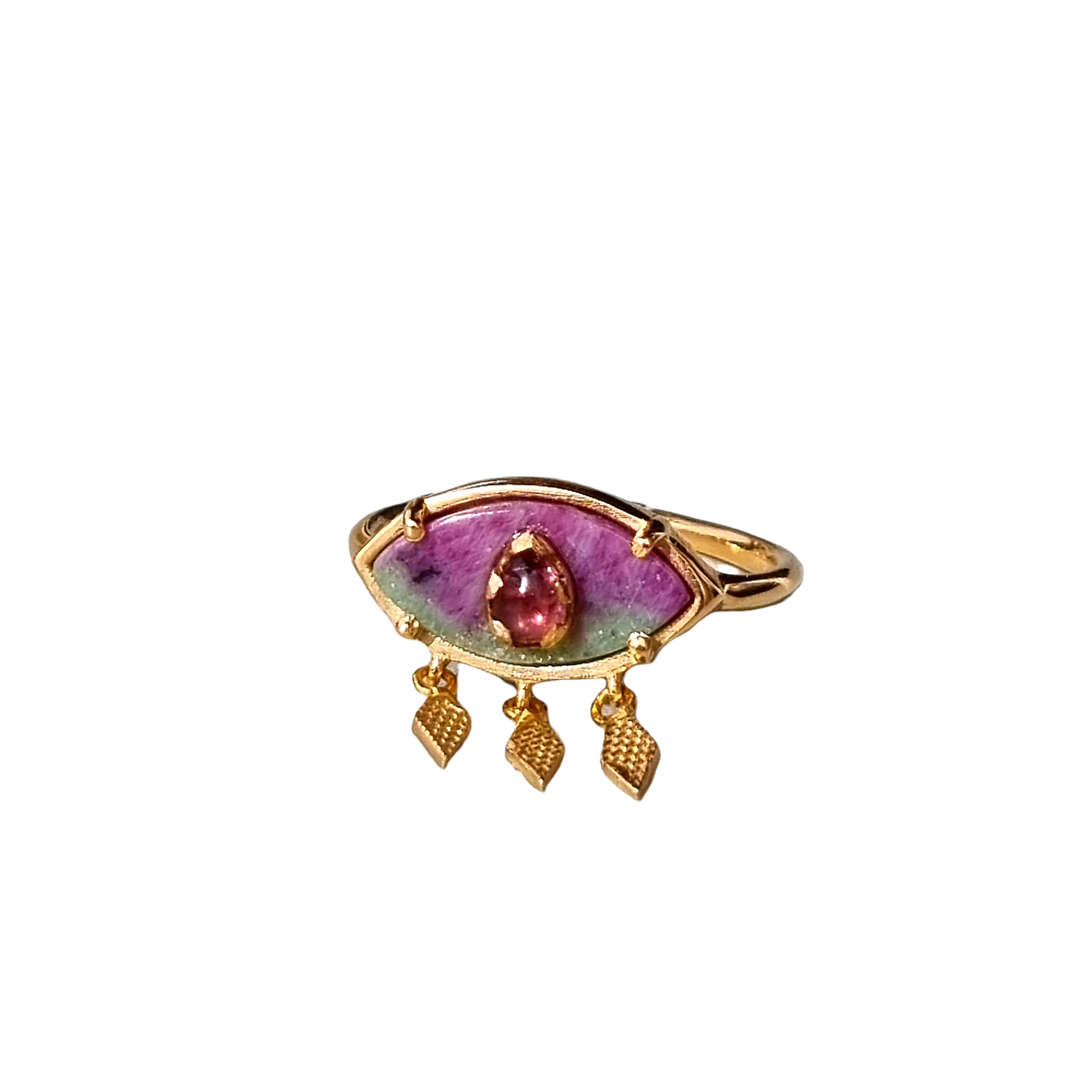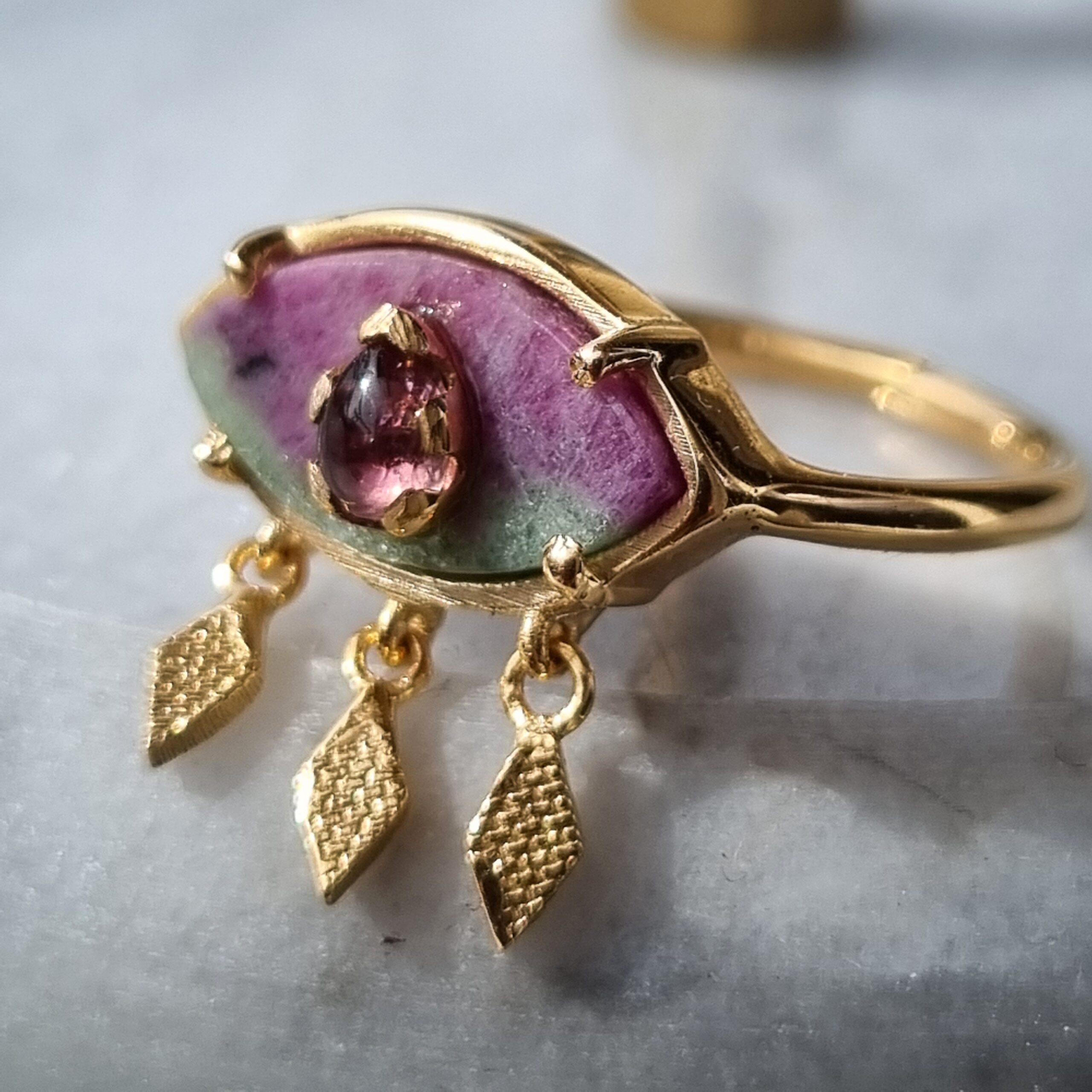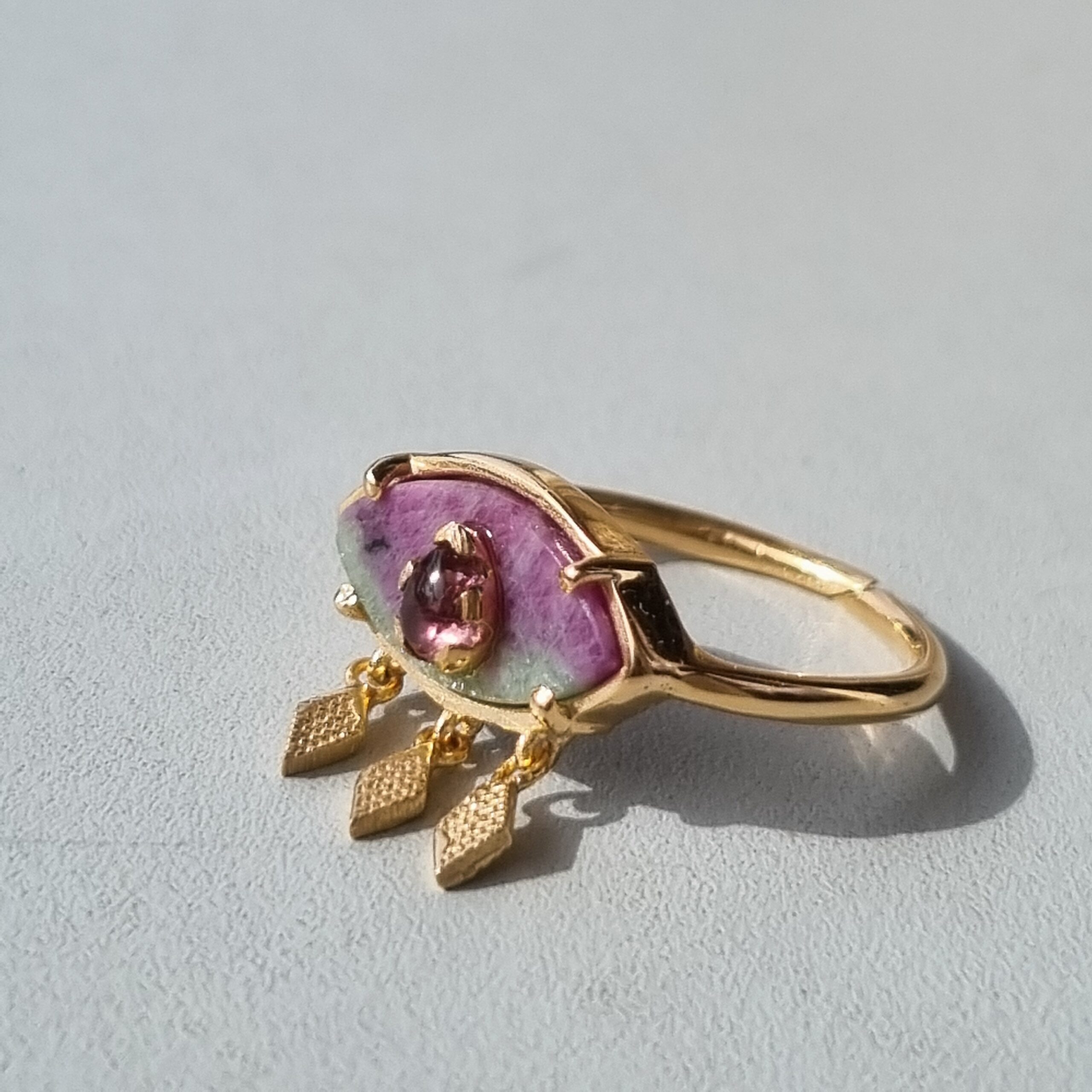 Ainara ring est tout en rubis zoisite avec son iris en tourmaline. Tout le serti est en argent plaqué or.