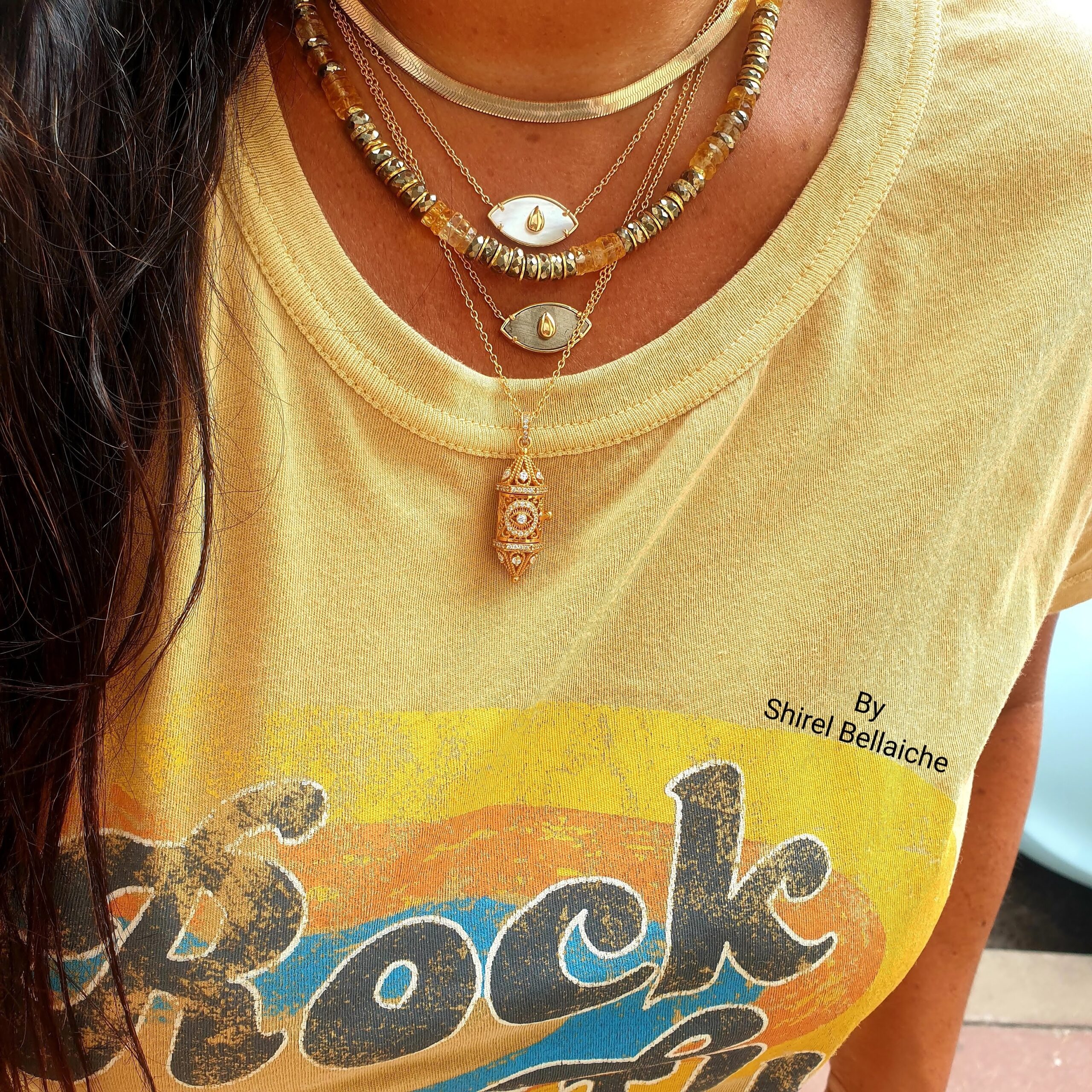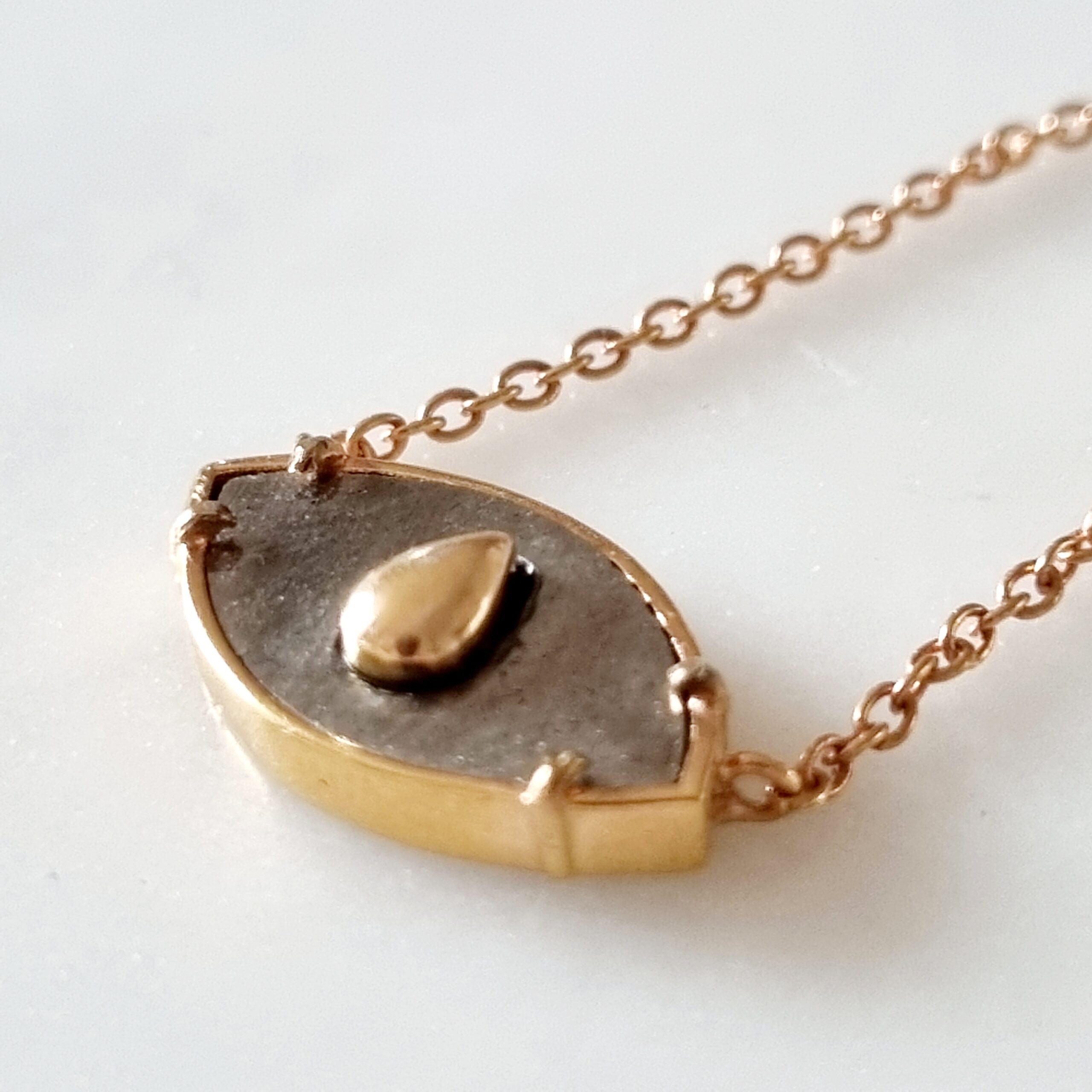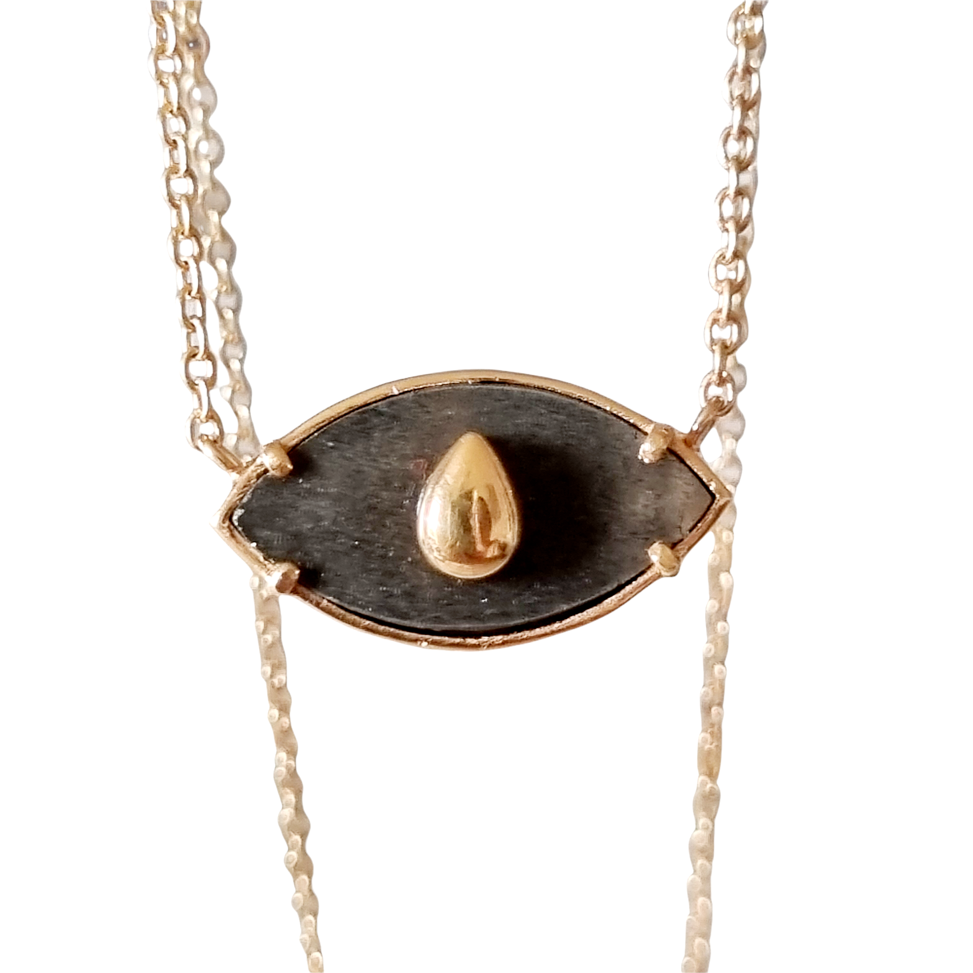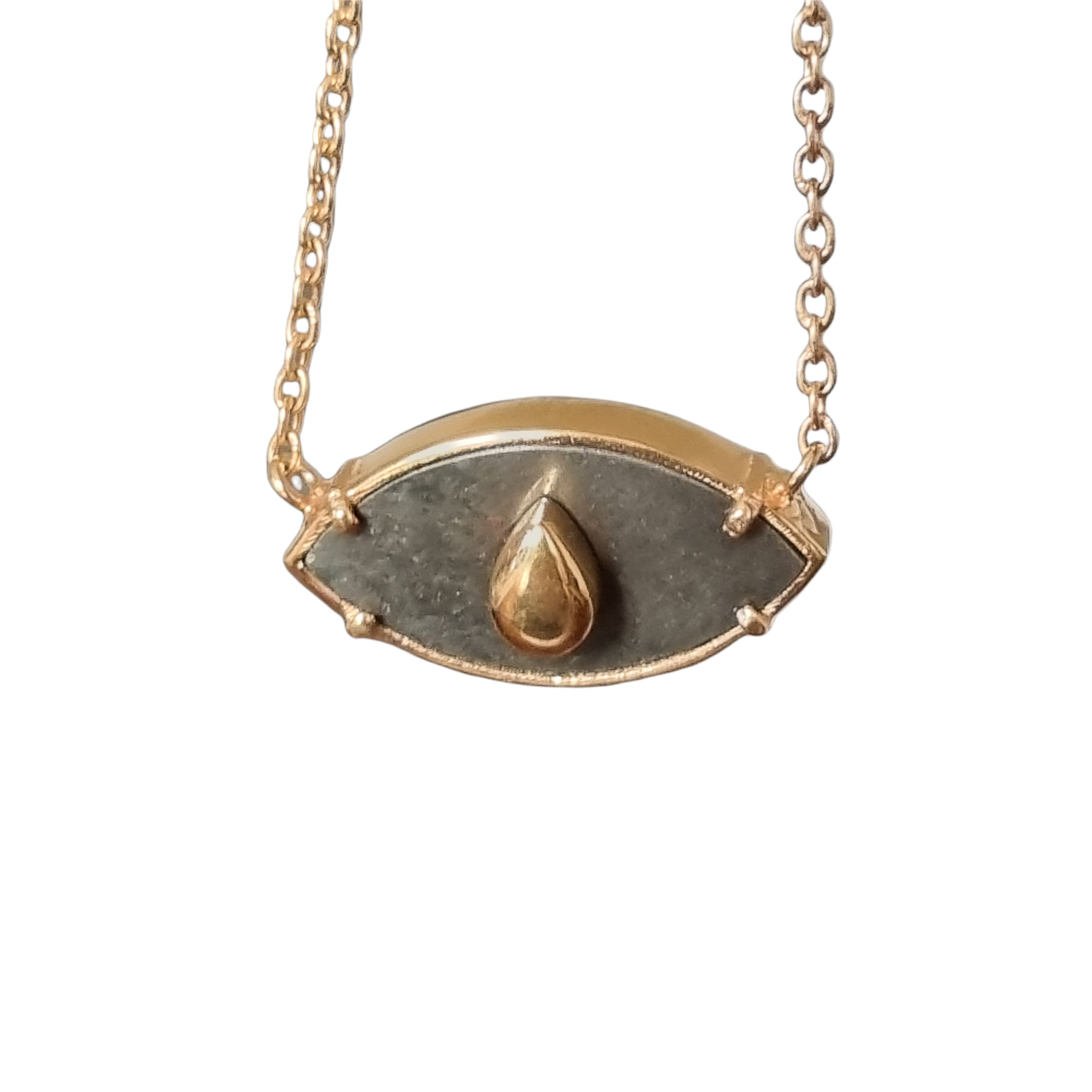 AINARA est un bijou de protection, un talisman porte bonheur intemporel et tendance. Il est proposé ici avec une pierre centrale en pyrite et l’iris enplaquée or. La chaine et le serti sont en vermeil plaqué or.