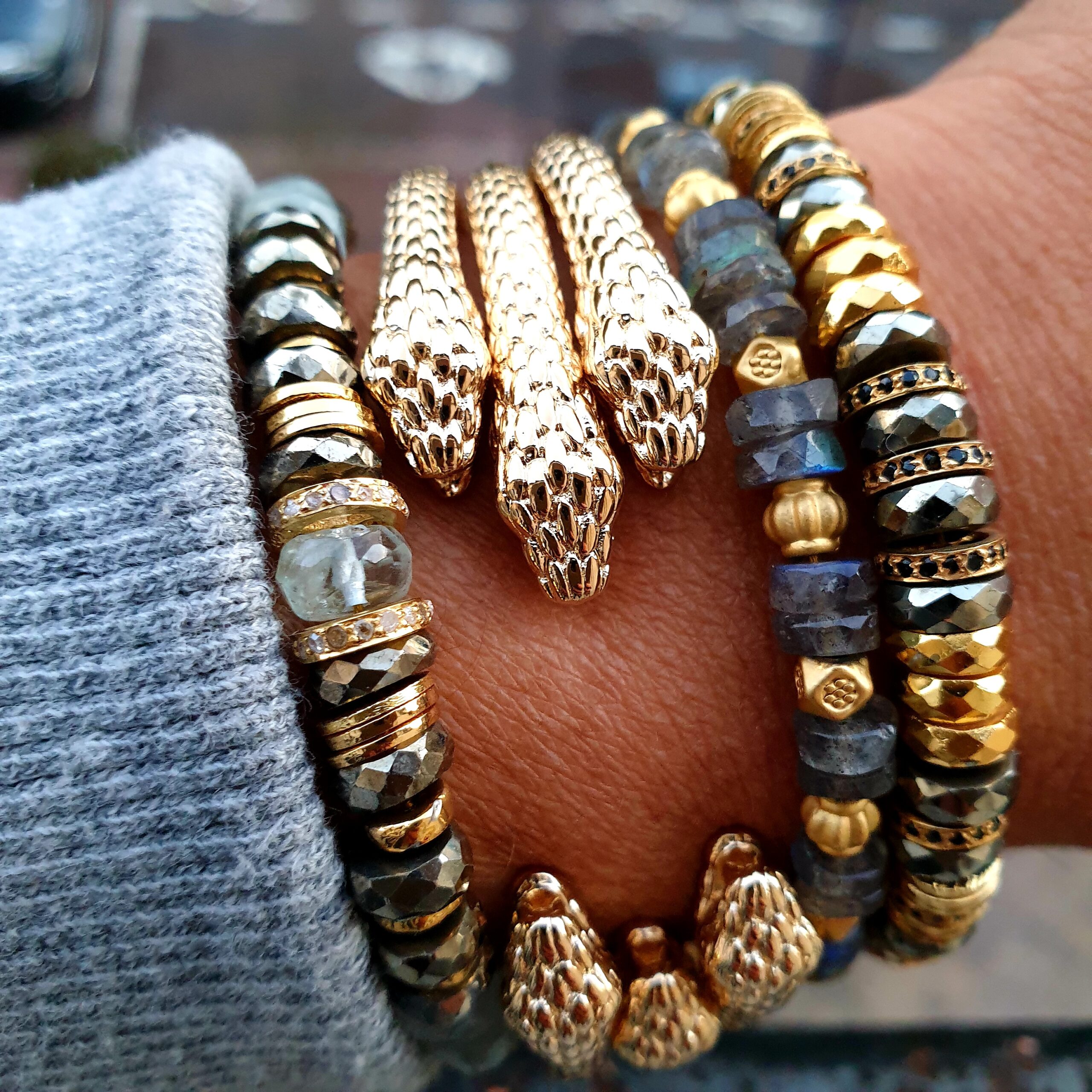 VITA est un bracelet tout en perles de labradorite facettées et perles plaquées or. La beauté des perles facettées fait de ce bijoux une vraie pépite unique en son genre.