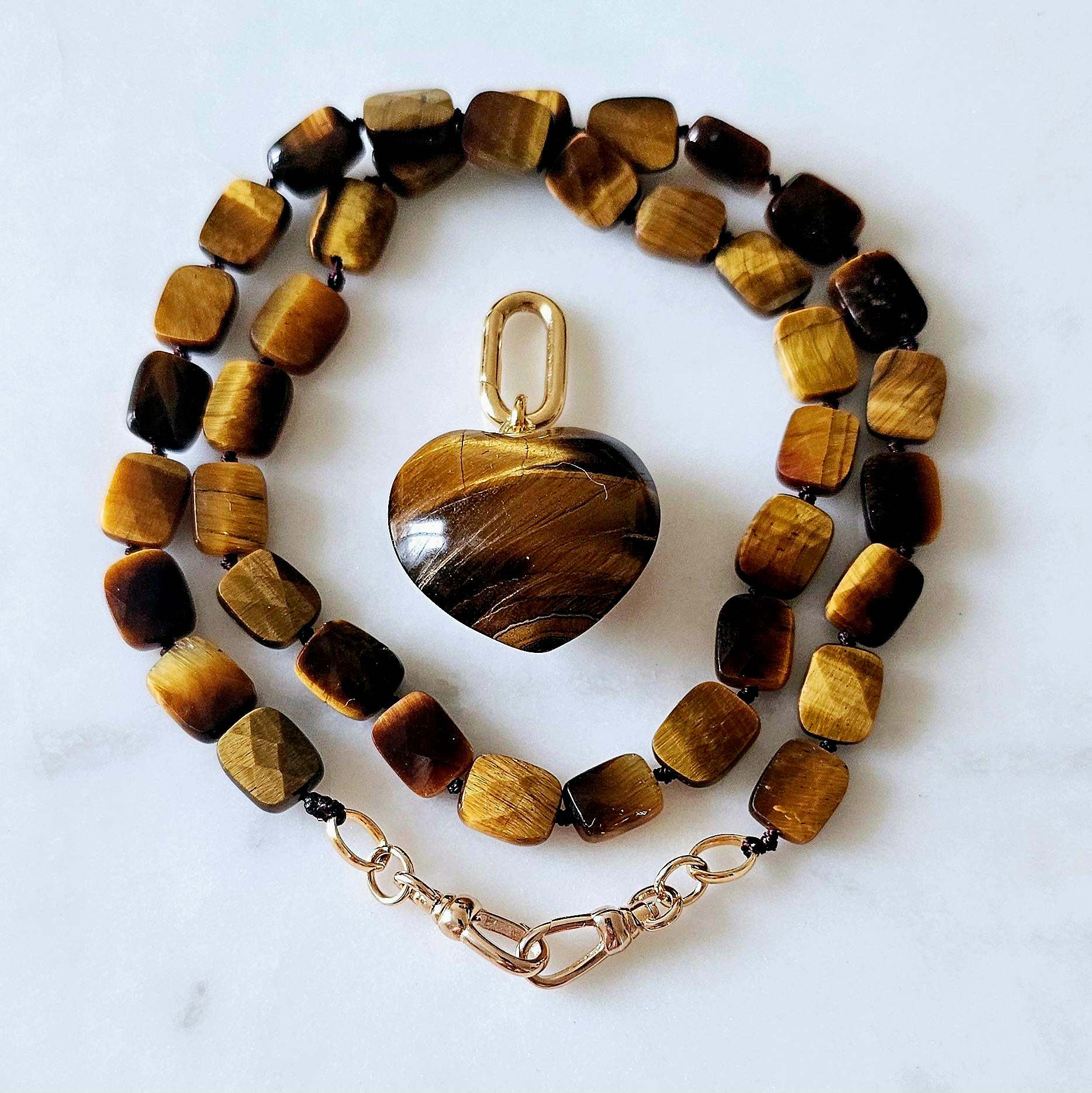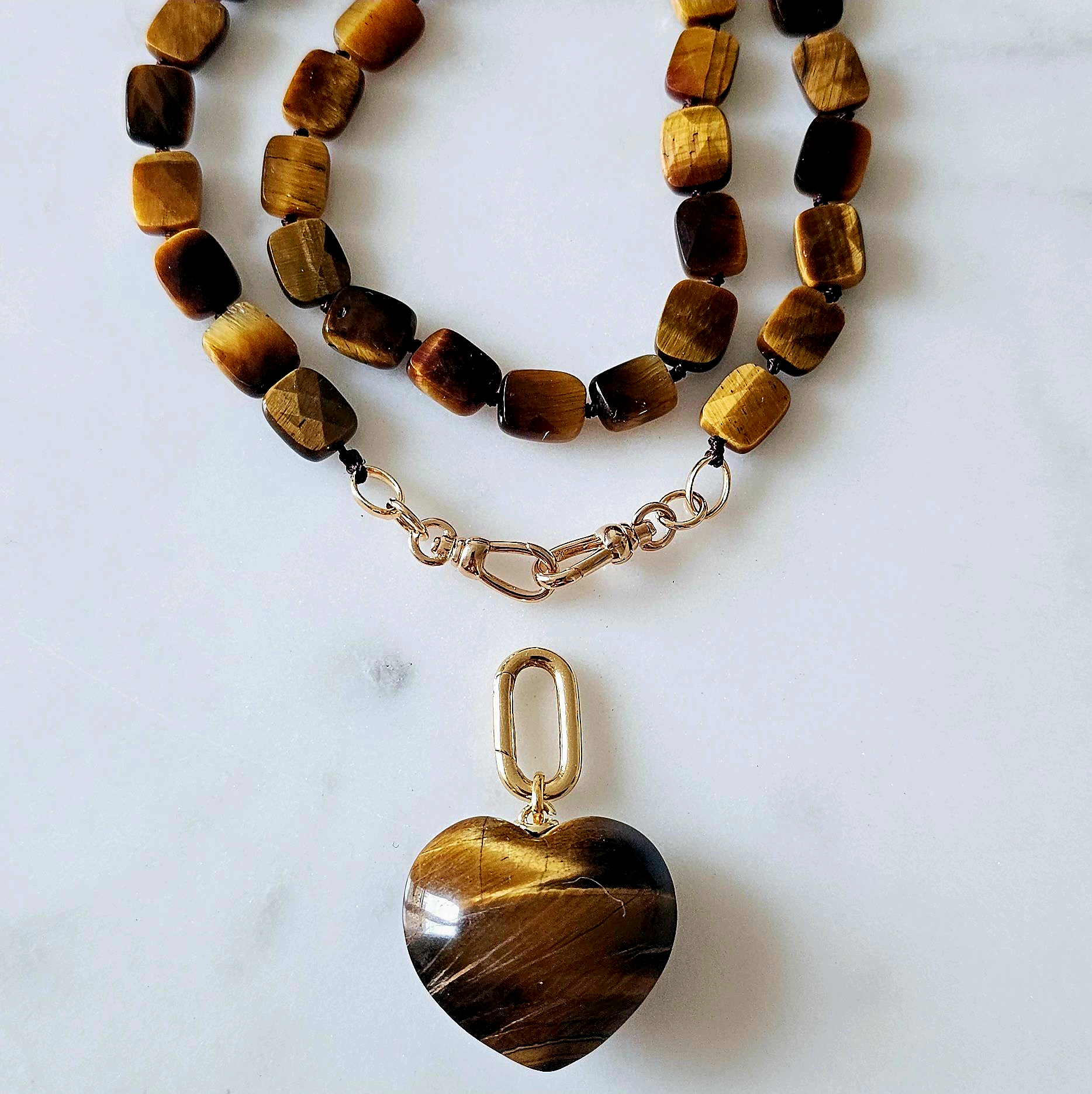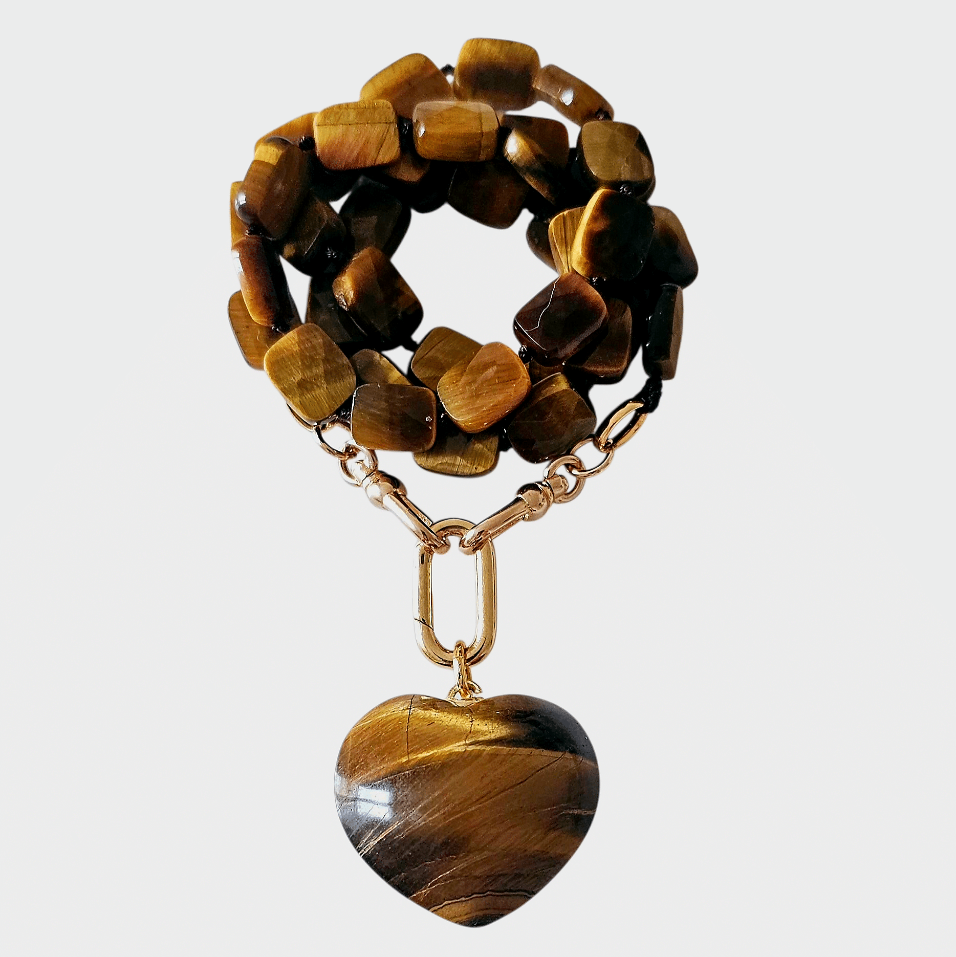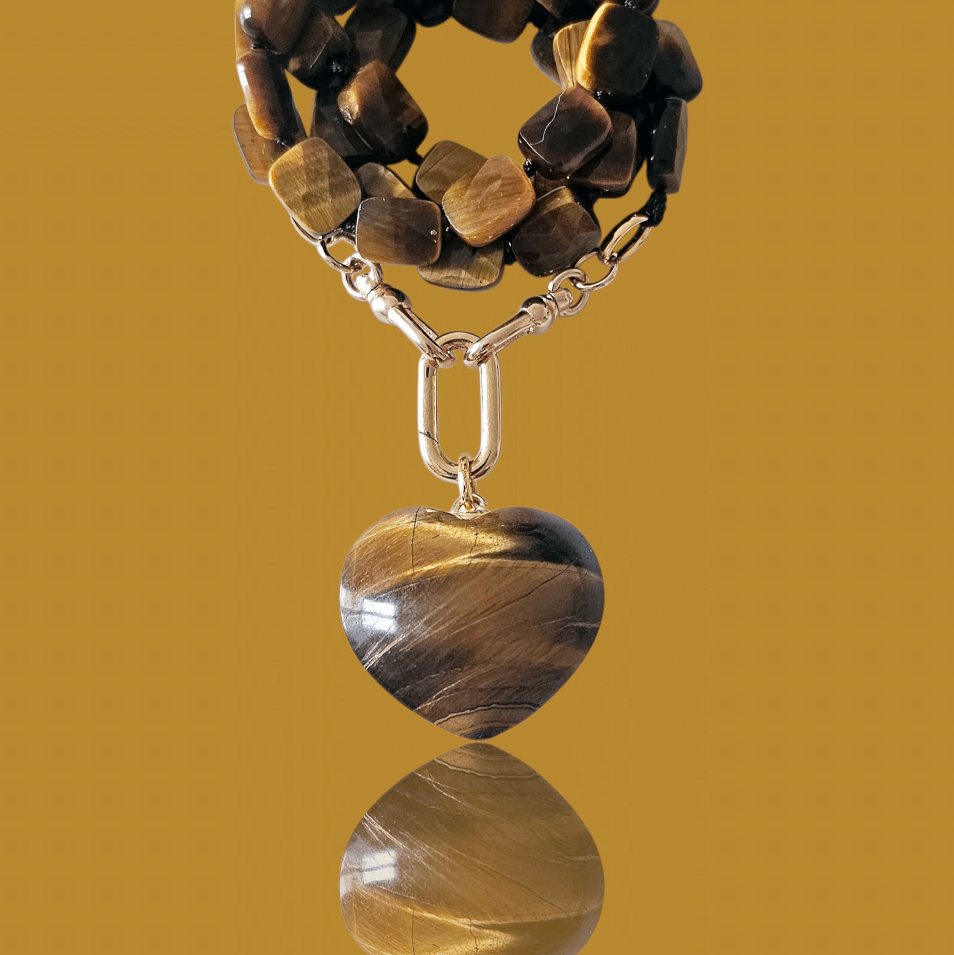 Ce sautoir est sublimé par un pendentif cœur en pierre naturelle, également en œil de tigre, suspendu à un locket mousqueton permettant ainsi la possibilité pour vous d’échanger ou pas de pendentif.