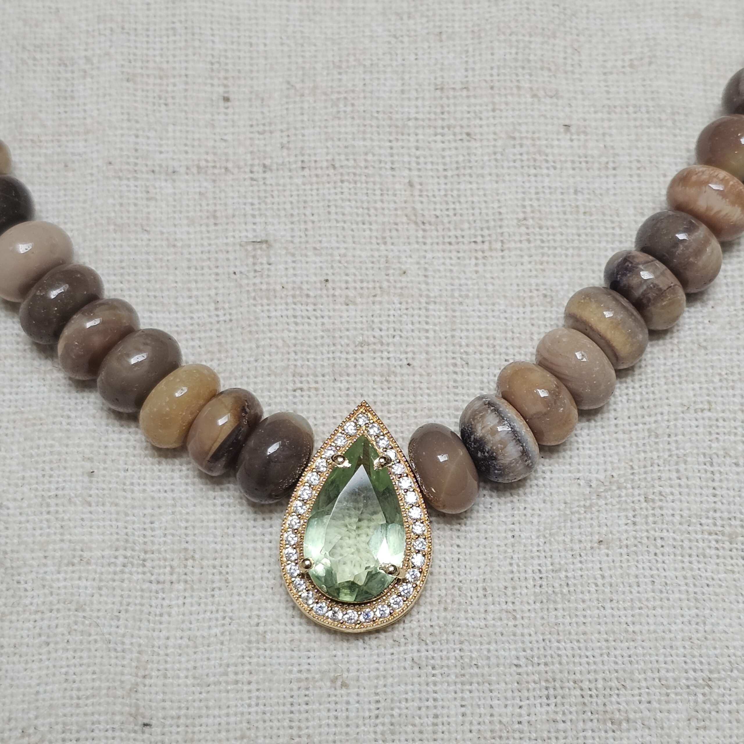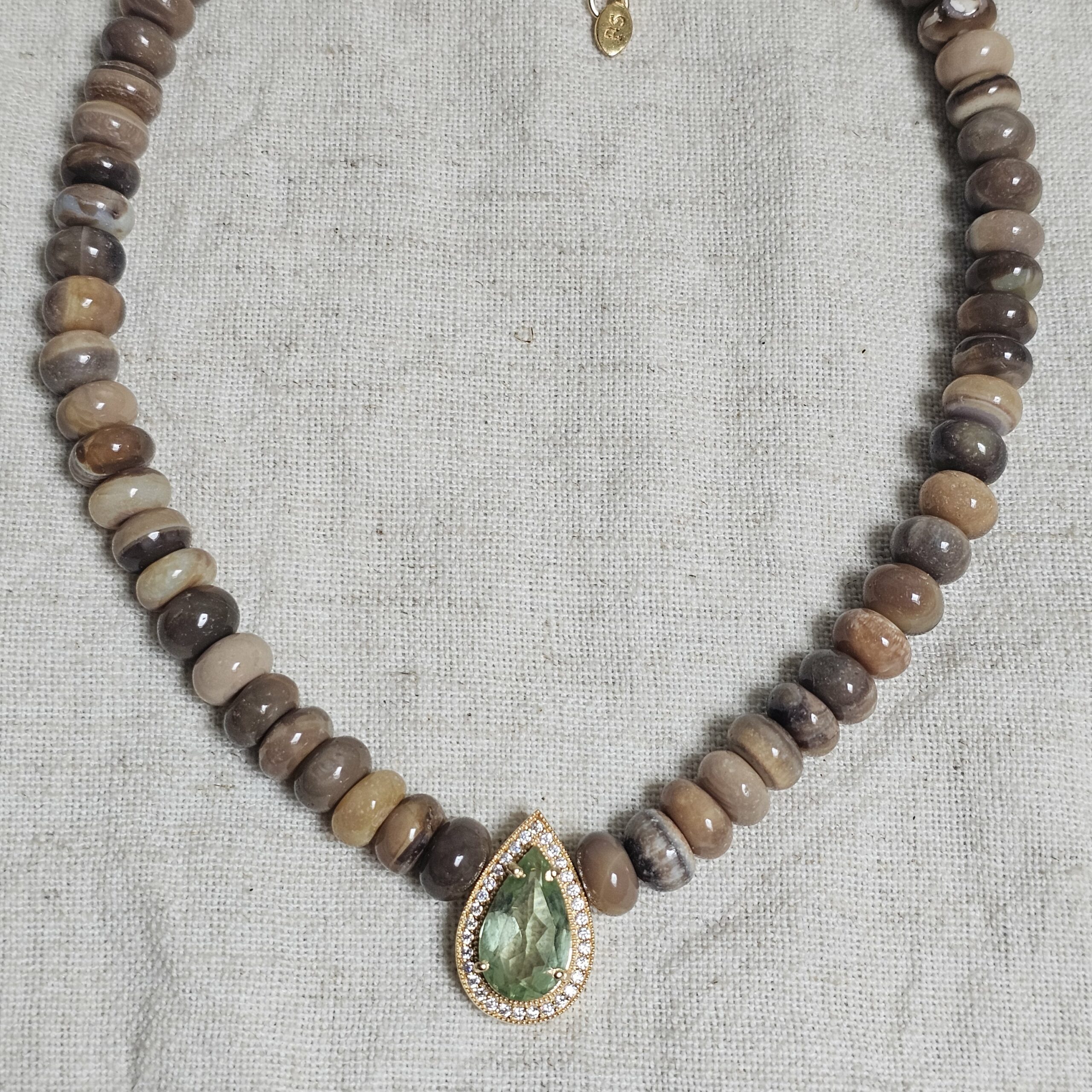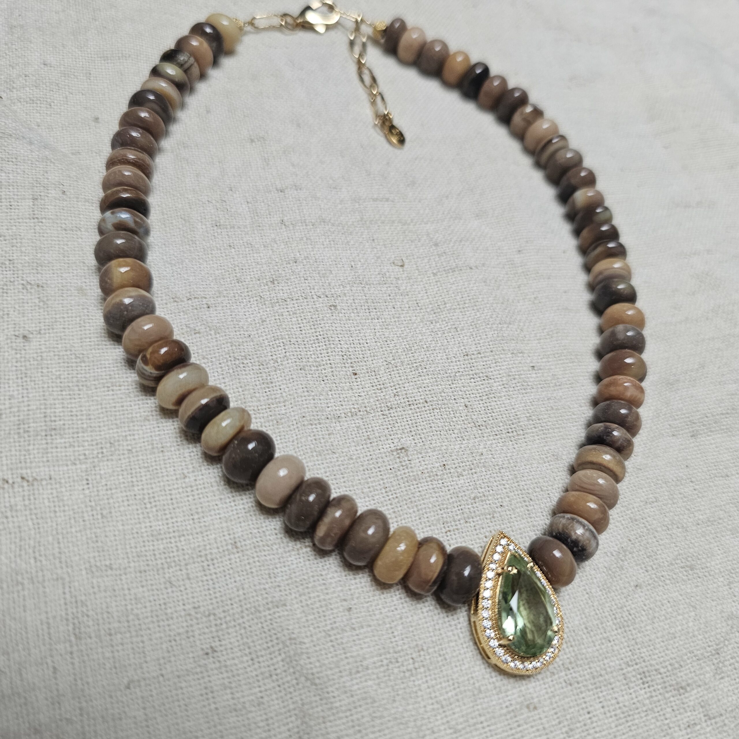 AMBER est tout en pierres d’opale naturelles, avec au centre une goutte plaquée or sertie tout autour de zircons, avec pour pierre principale une améthyste verte.