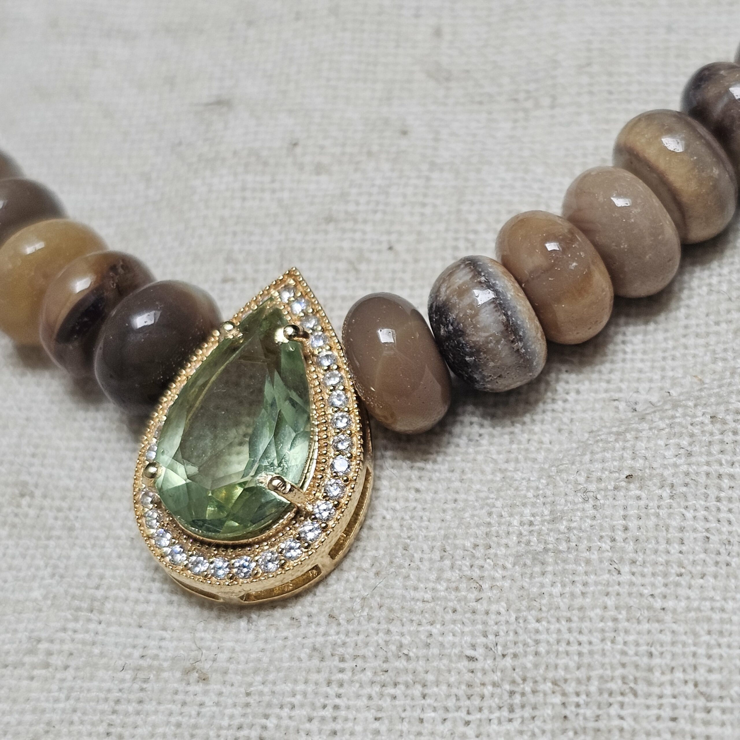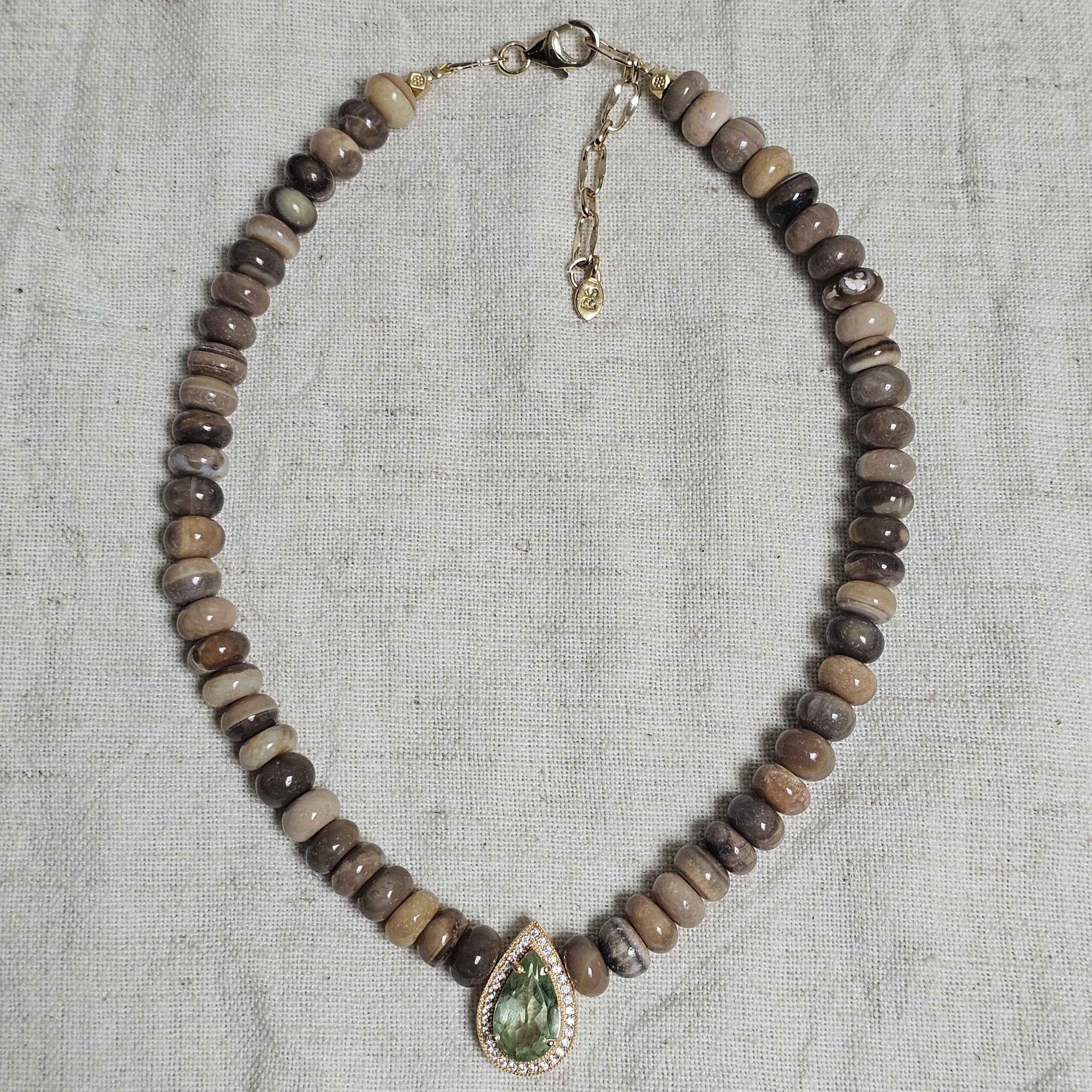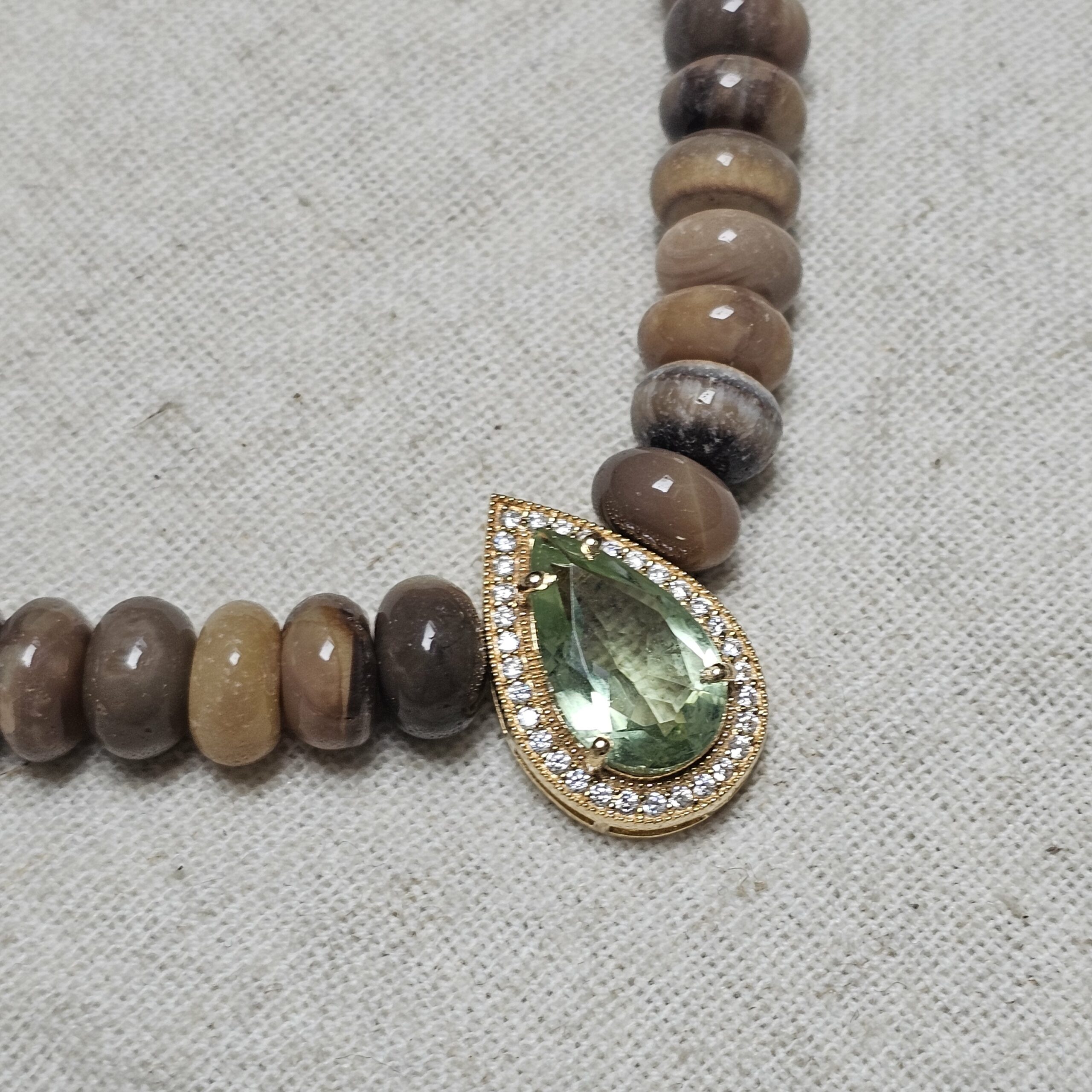 AMBER est tout en pierres d’opale naturelles, avec au centre une goutte plaquée or sertie tout autour de zircons, avec pour pierre principale une améthyste verte.