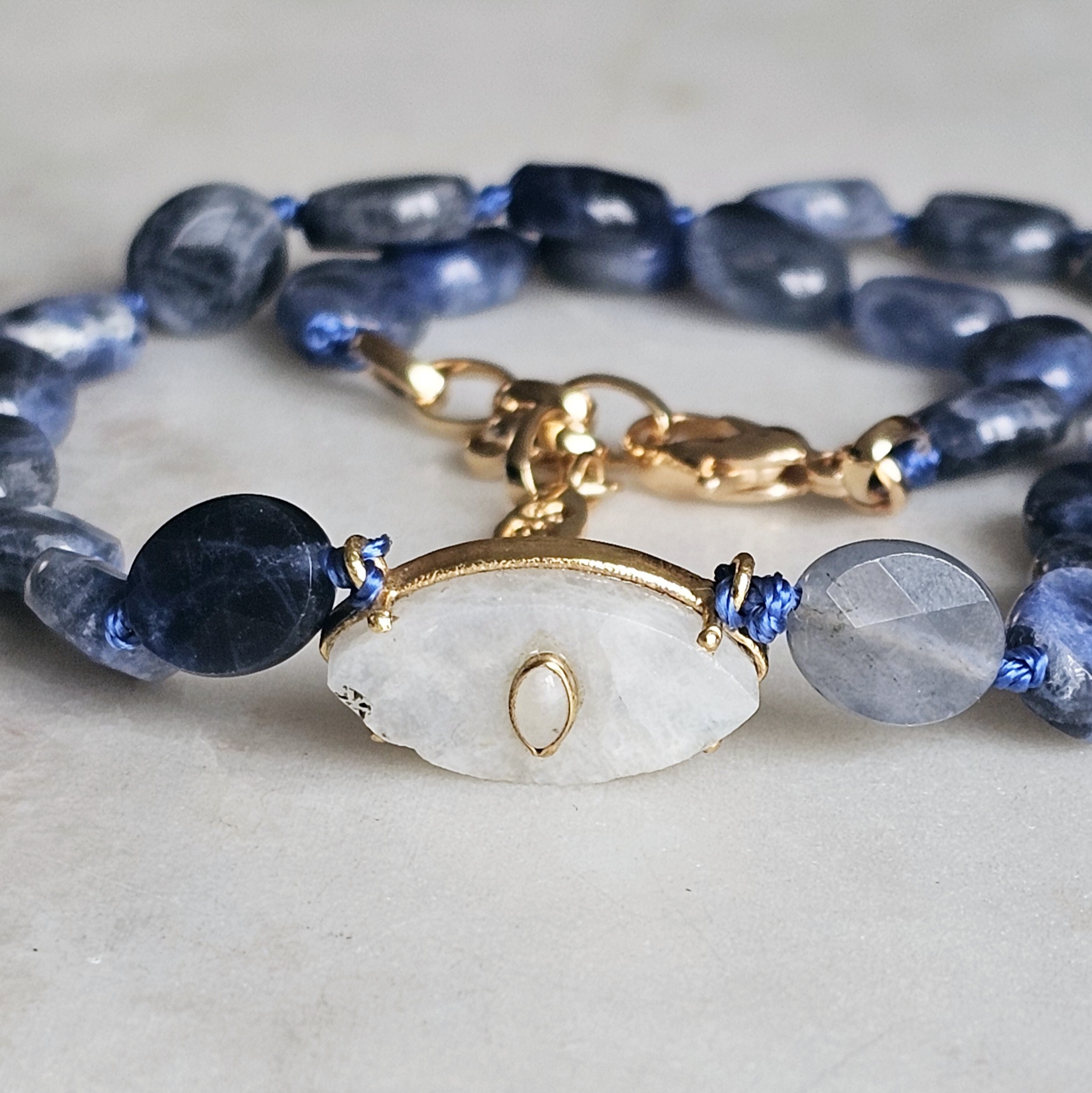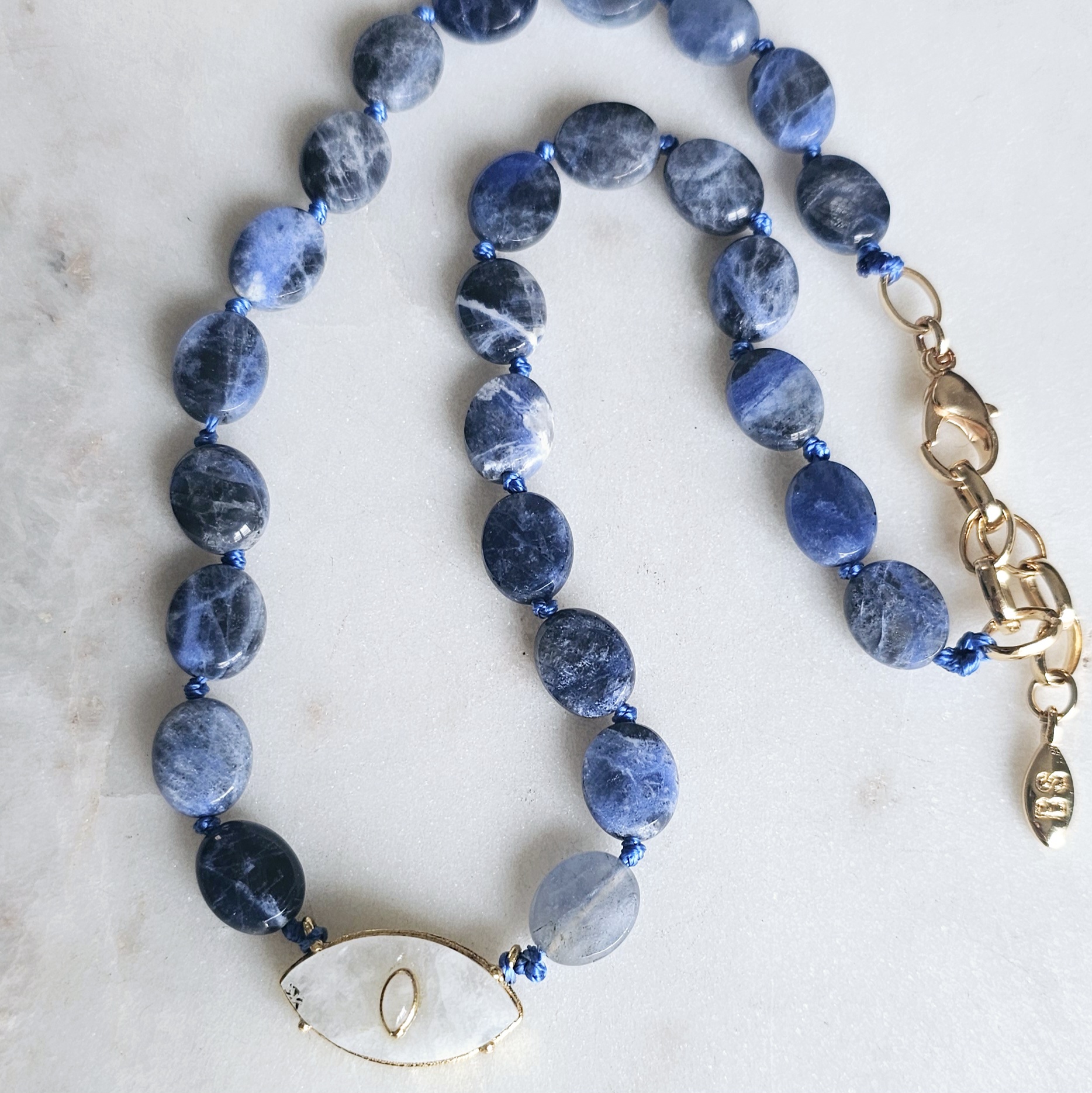 ANGELA est tout en pierres naturelles de sodalite, nouées sur un cordon de soie, avec au centre son œil Ainara pierre de lune.