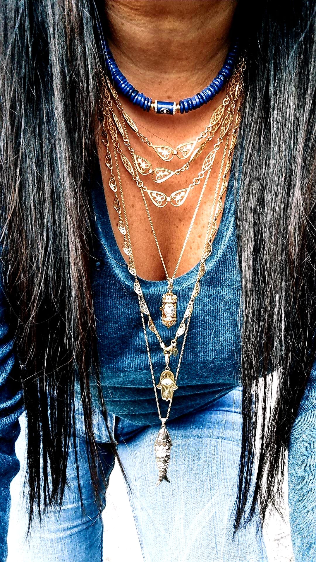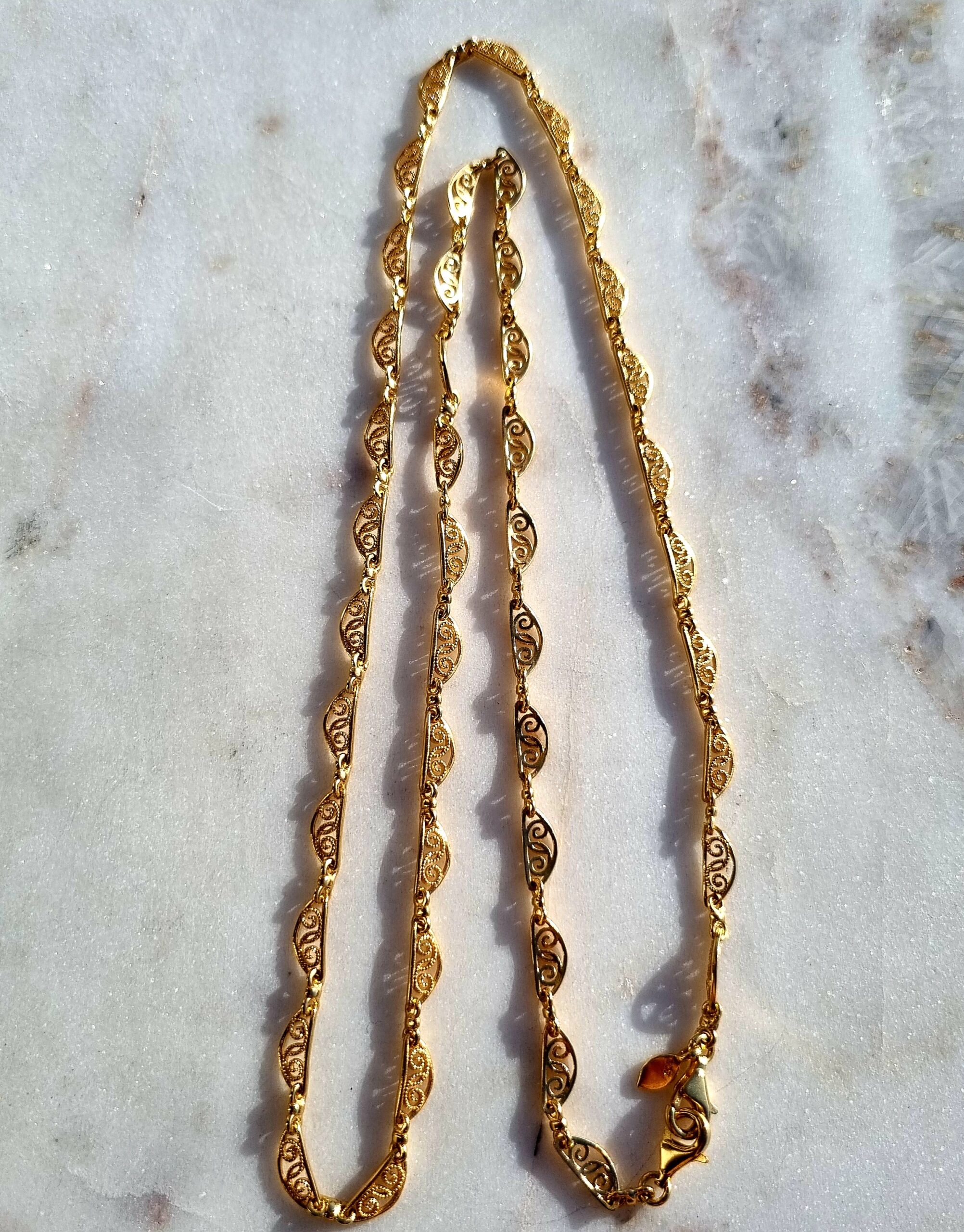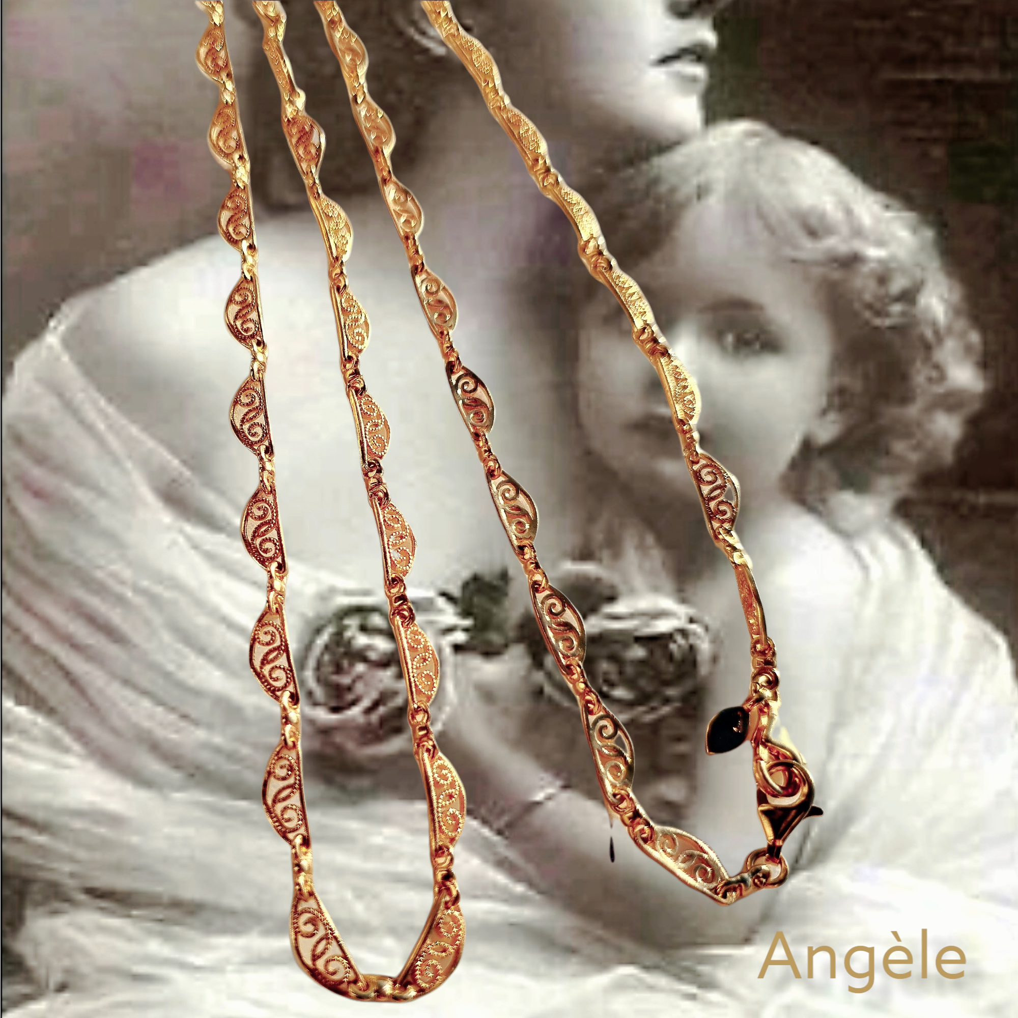 Angèle est une réplique des légendaires chaînes de montre de nos grands mères. C’est une chaîne à maillons en filigrane tout en vermeil.