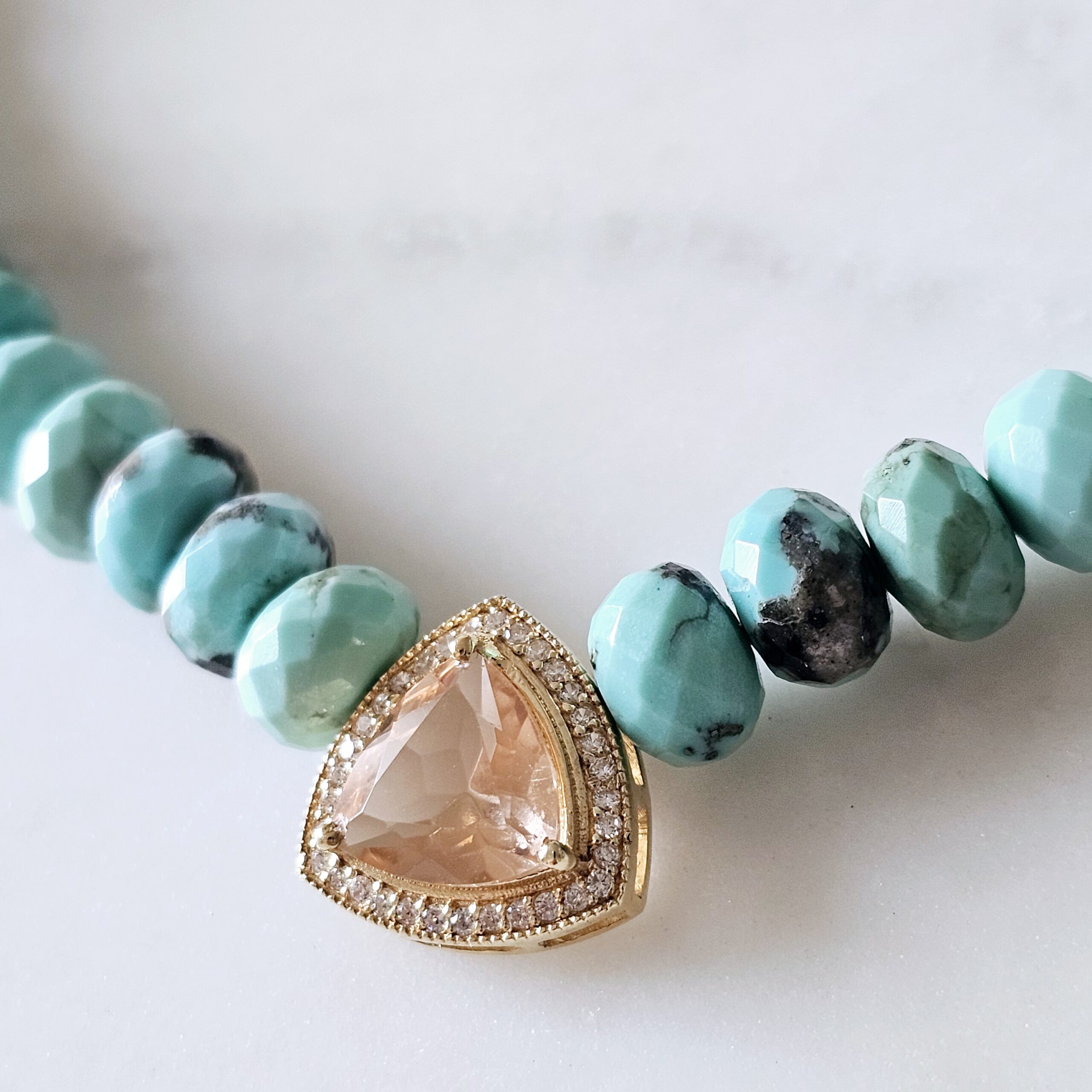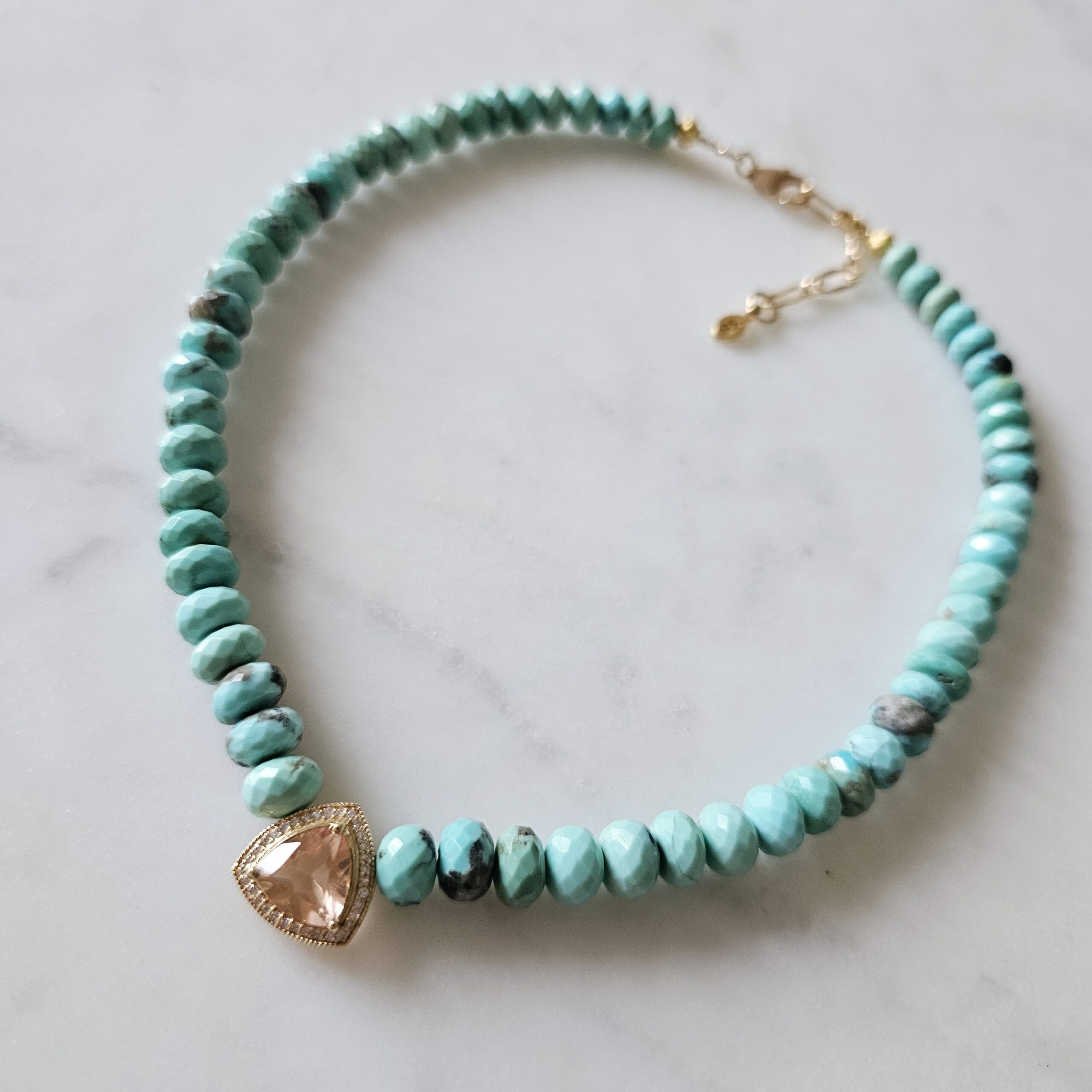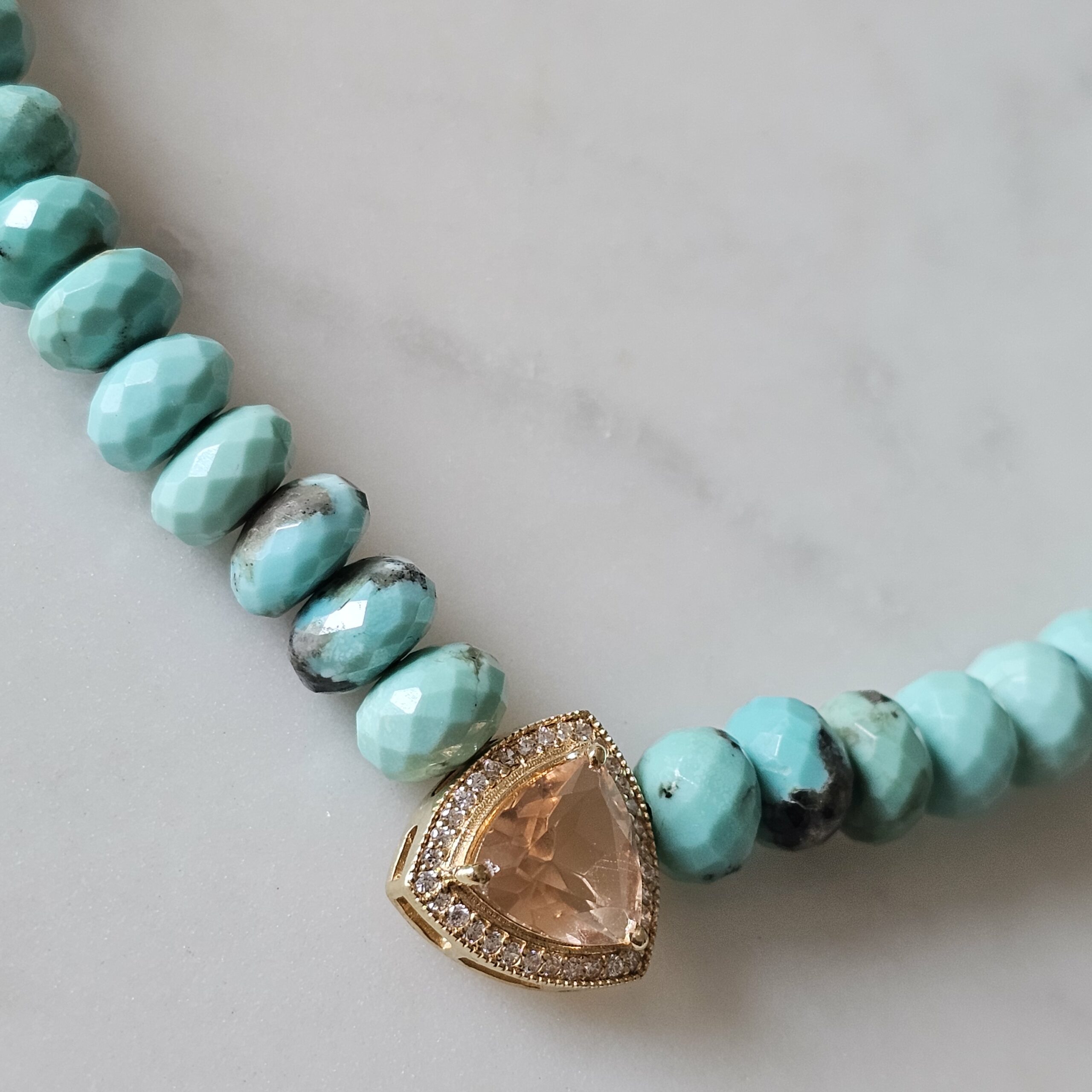 ARIZONA est un chocker tout en pierres naturelles de turquoise Arizona, avec au centre un triangle morganite en argent plaqué or, serti tout autour de zircons.
