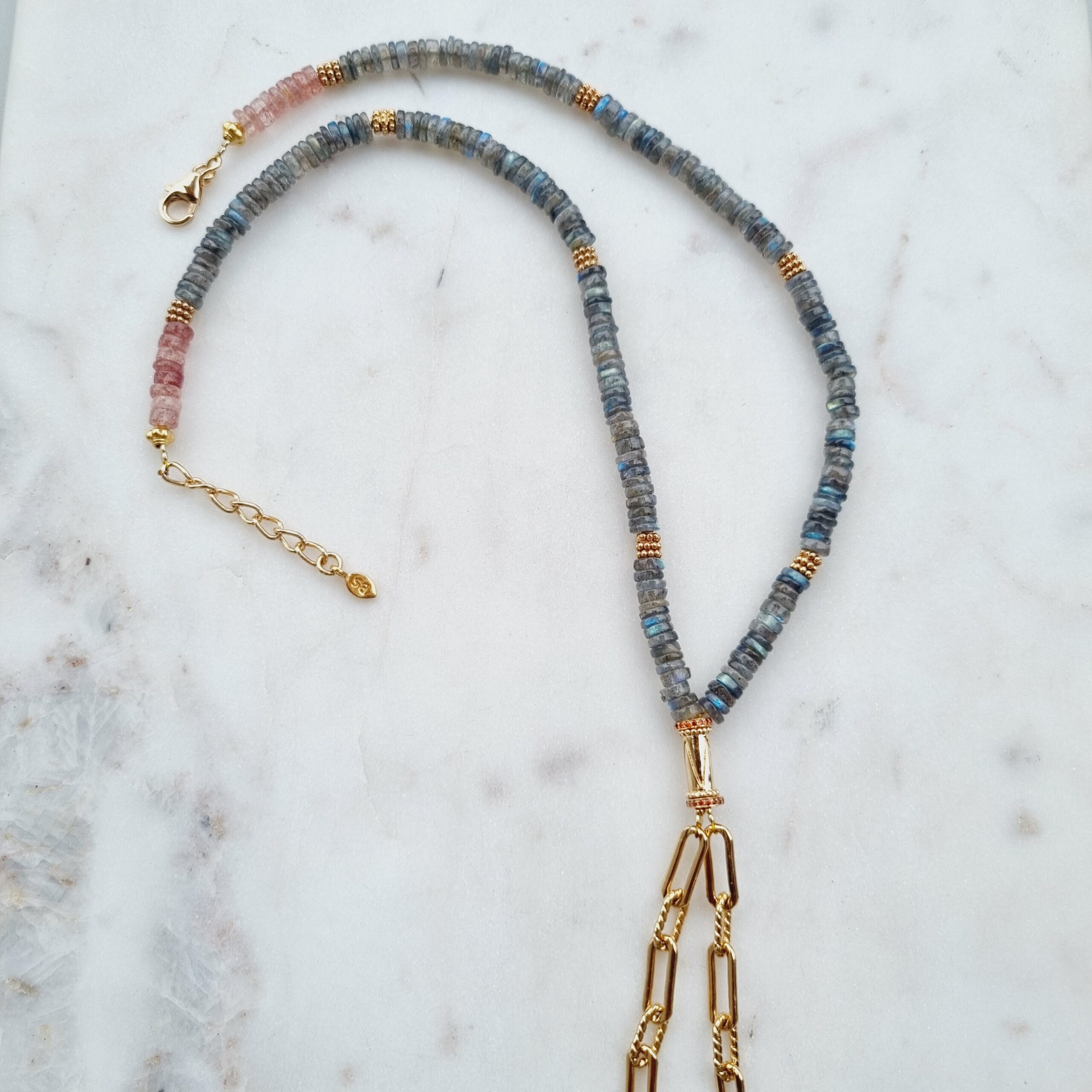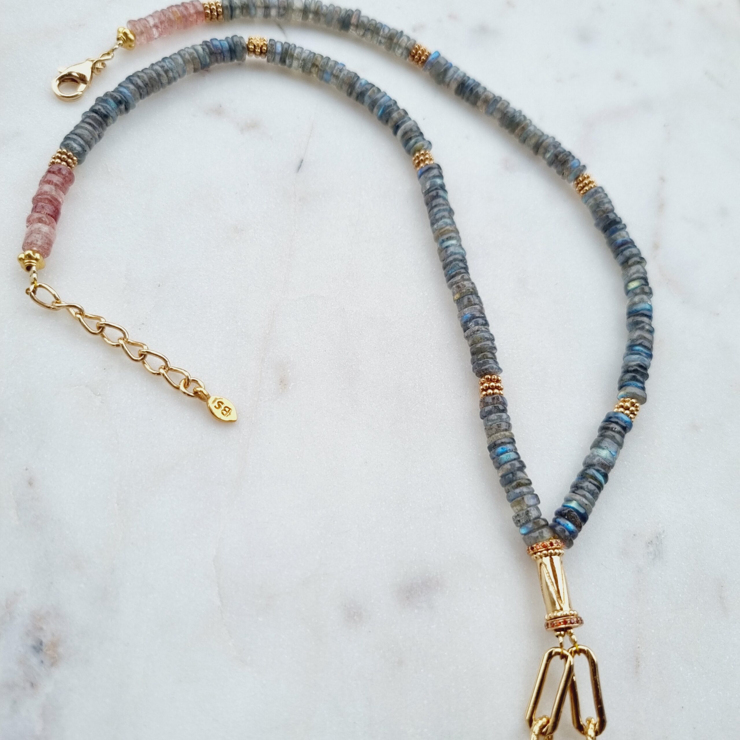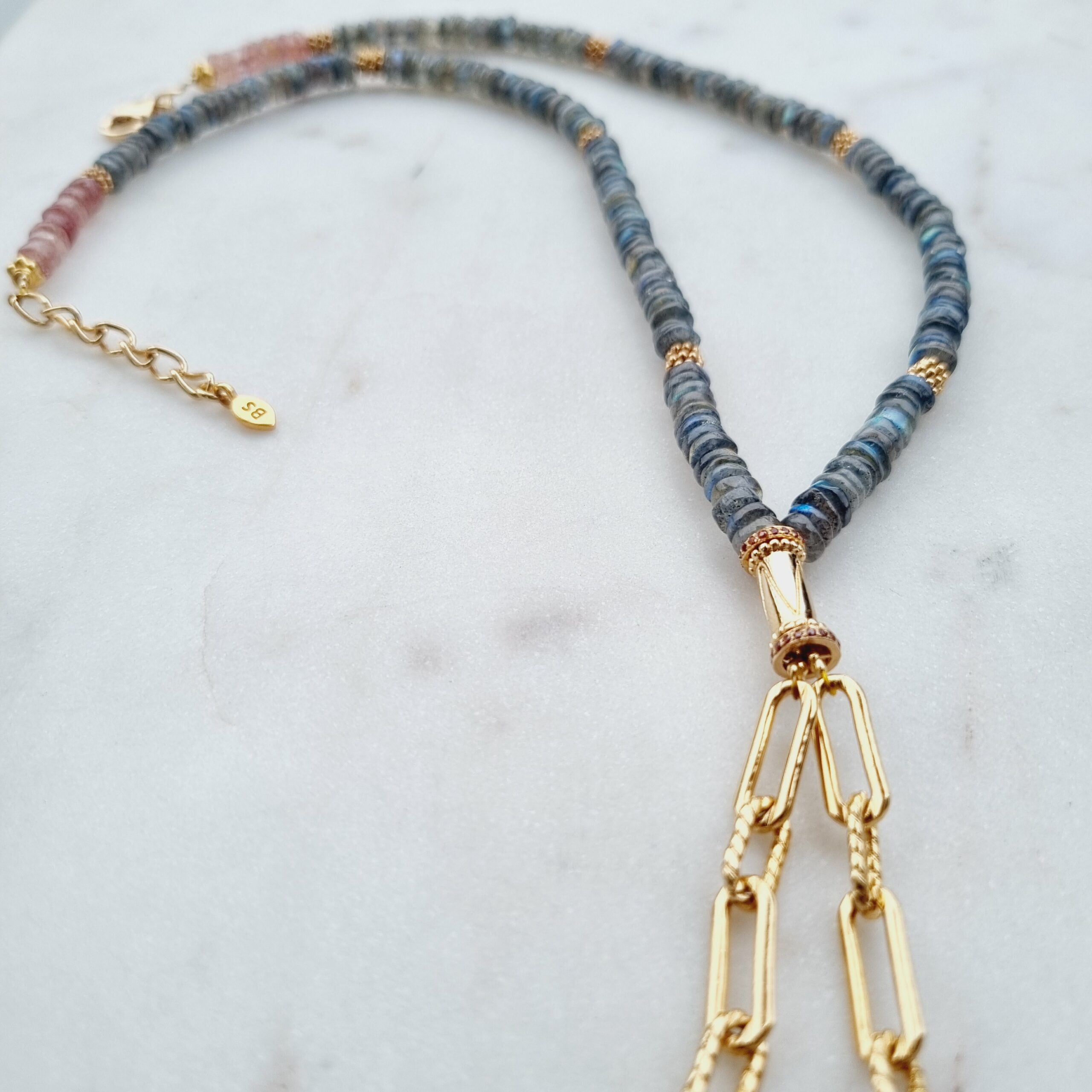 ASHLEY est un collier essentiellement en pierres de labradorite. Sa forme originale ” cravate” laisse apparaitre deux chaines plaquées or microns.