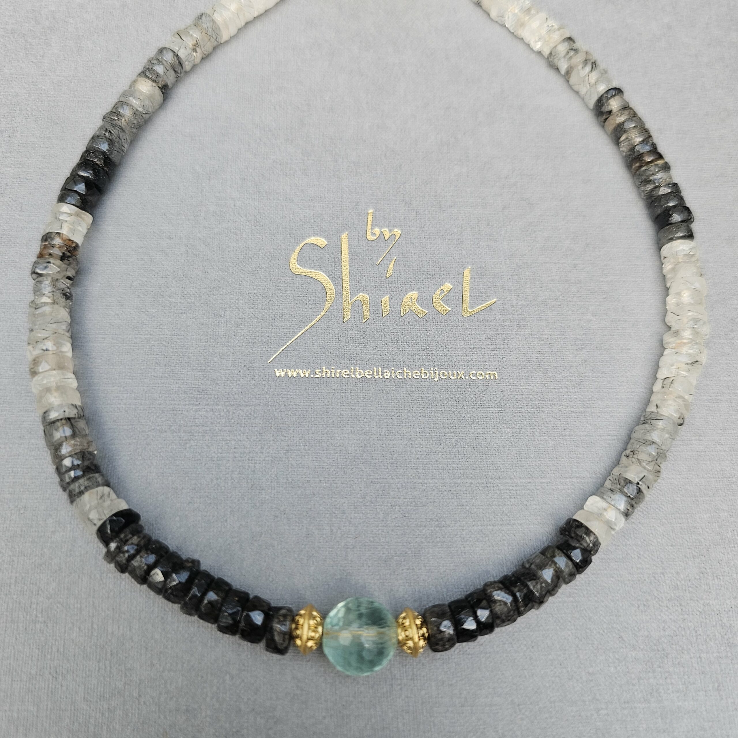 AVIGAIL est tout en black rutile, plaqué or avec au centre une fluorite.