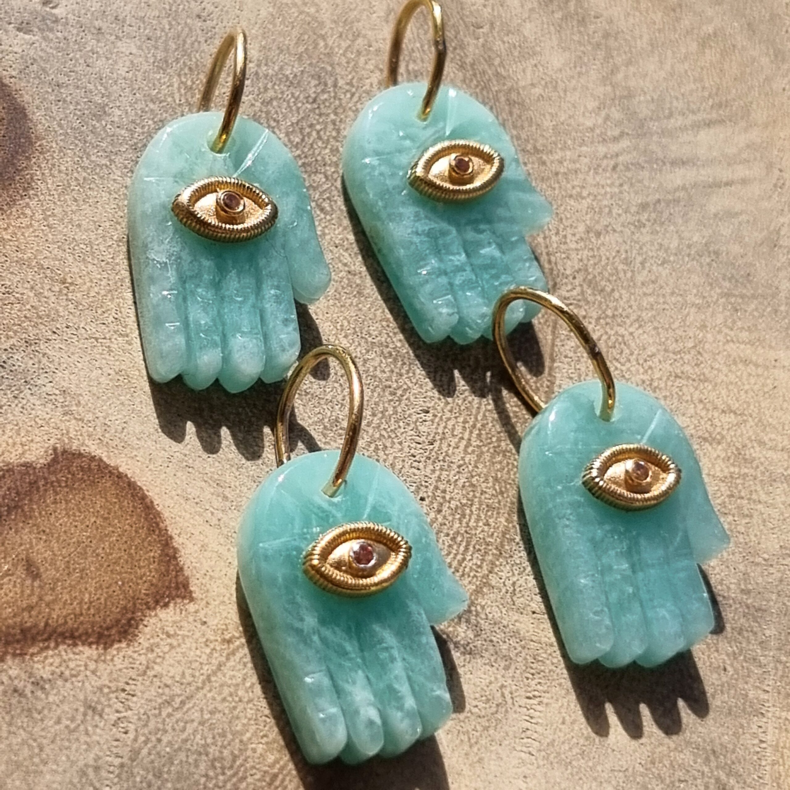 Mona Charm’s est proposée sans chaine. La version proposée ici est en amazonite avec au centre un petit oeil plaqué or.