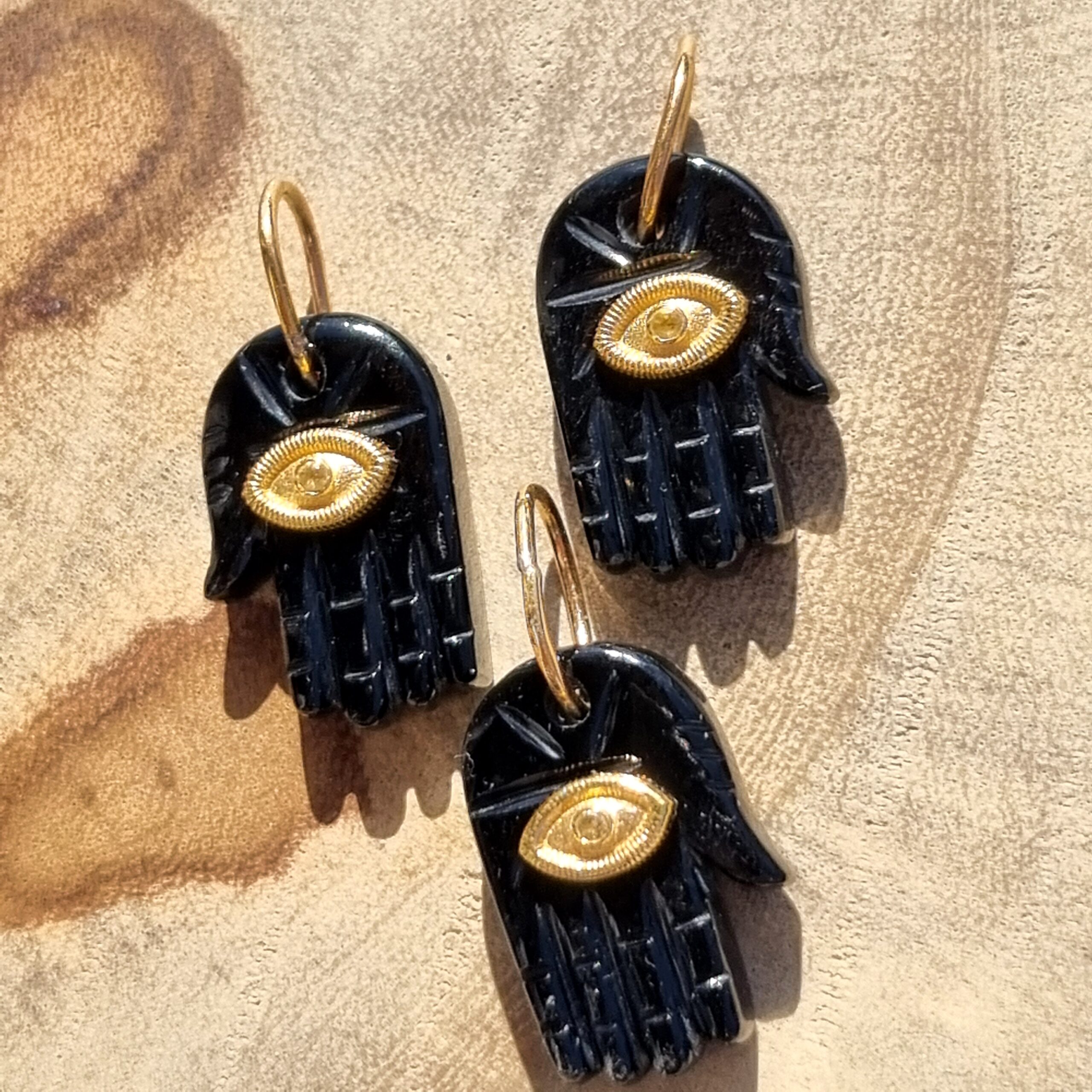 Mona Charm’s est proposée sans chaine. La version proposée ici est en onyx noire avec au centre un petit oeil plaqué or.