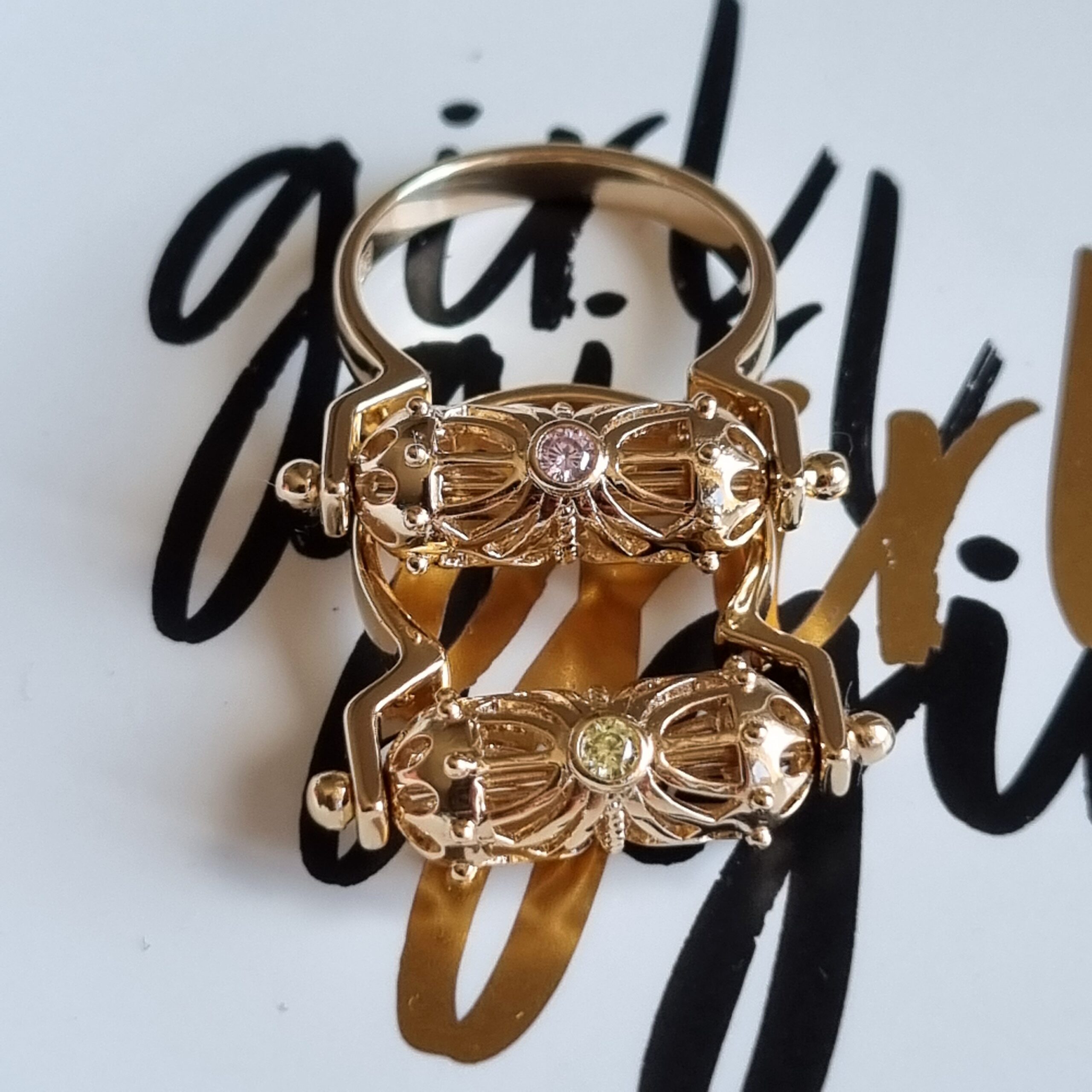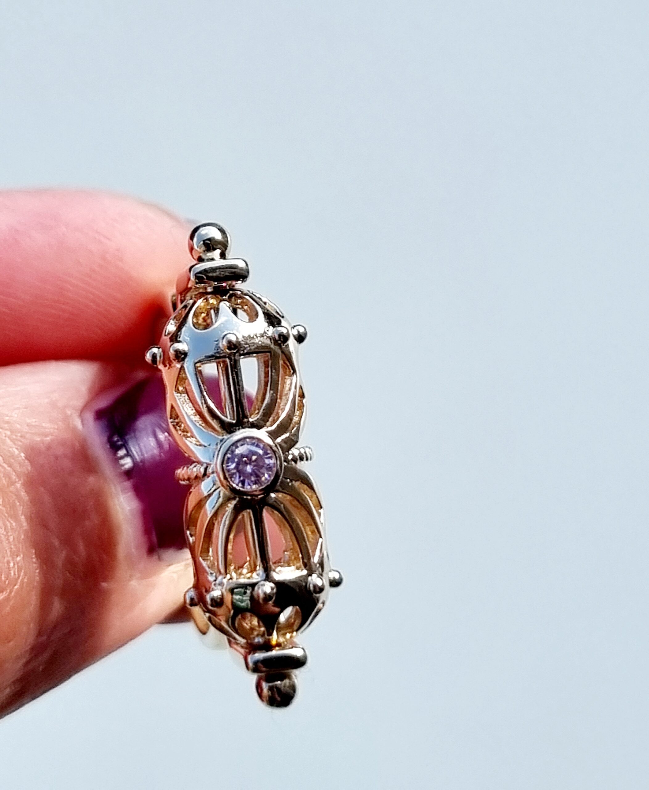 Bague Sefer plaquée or 3 microns avec une particularité, sur une face le zircon est rose puis sur l’autre face le zircon est blanc.