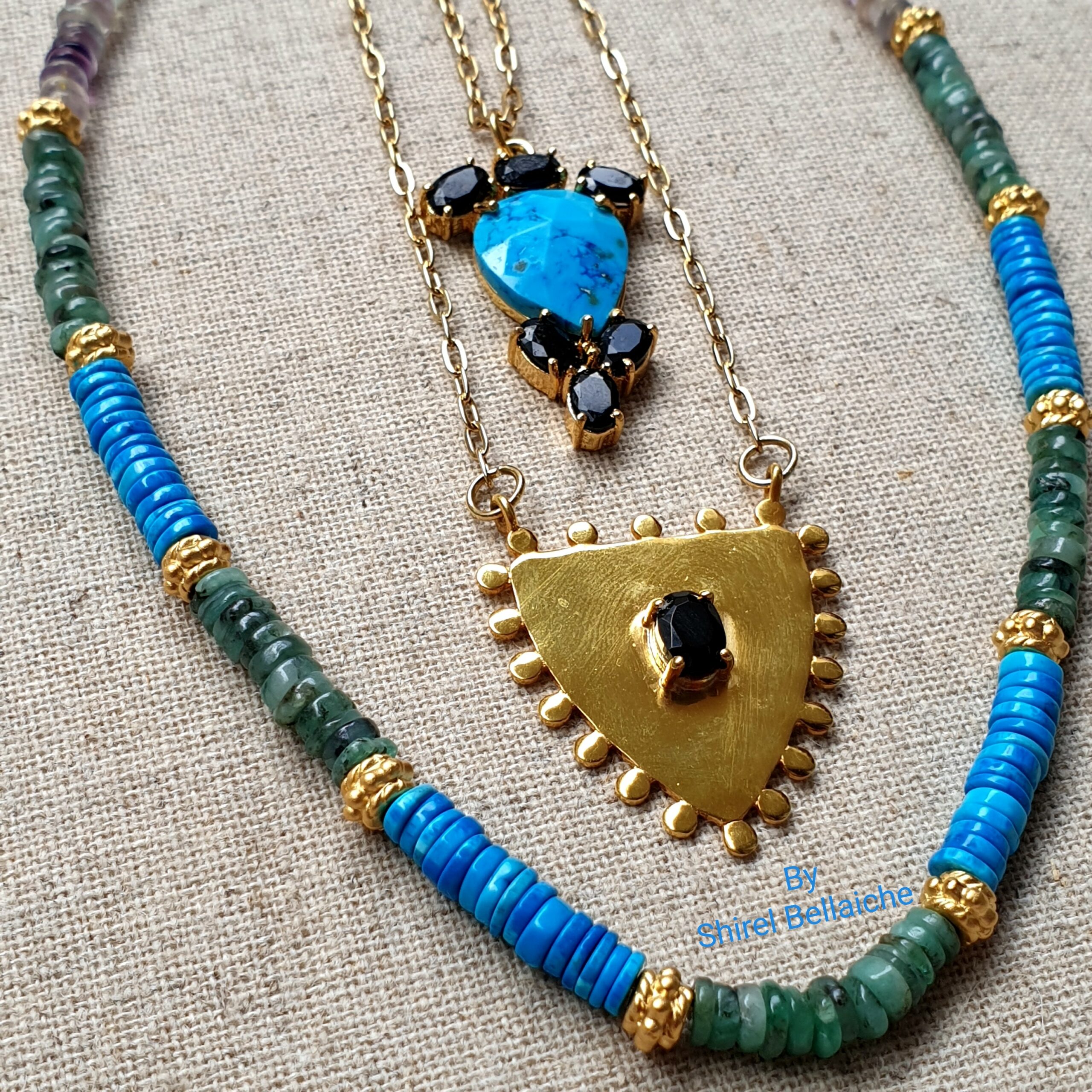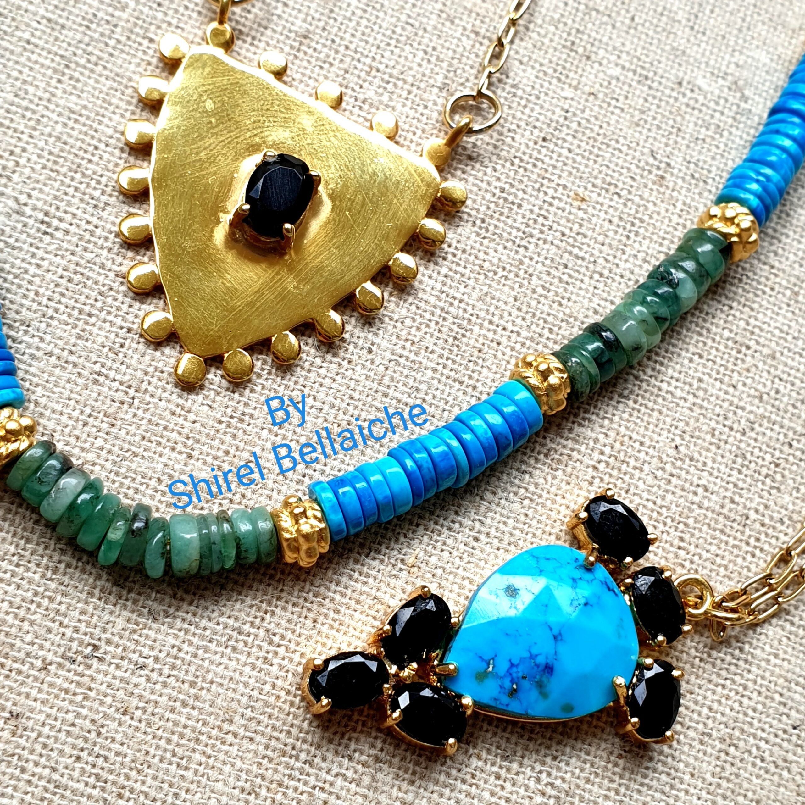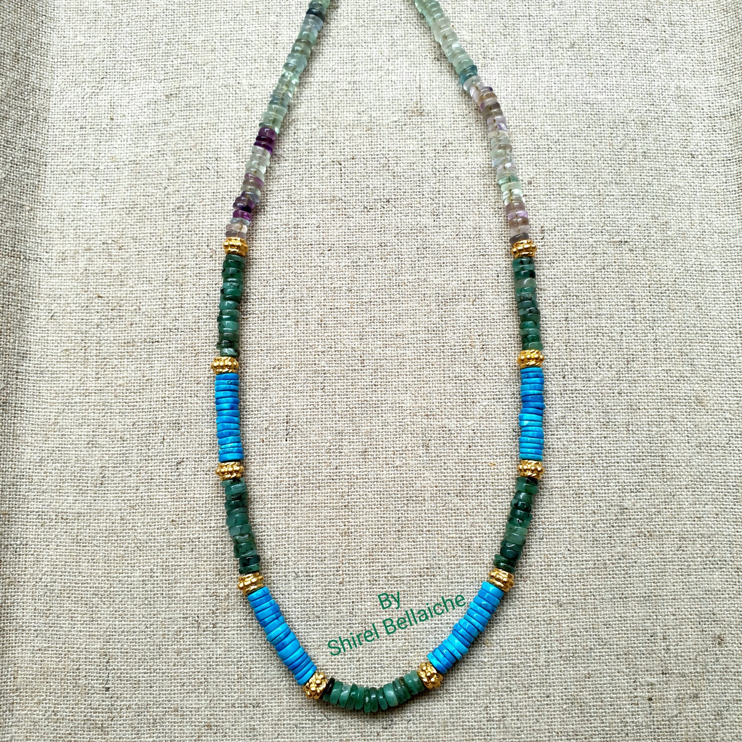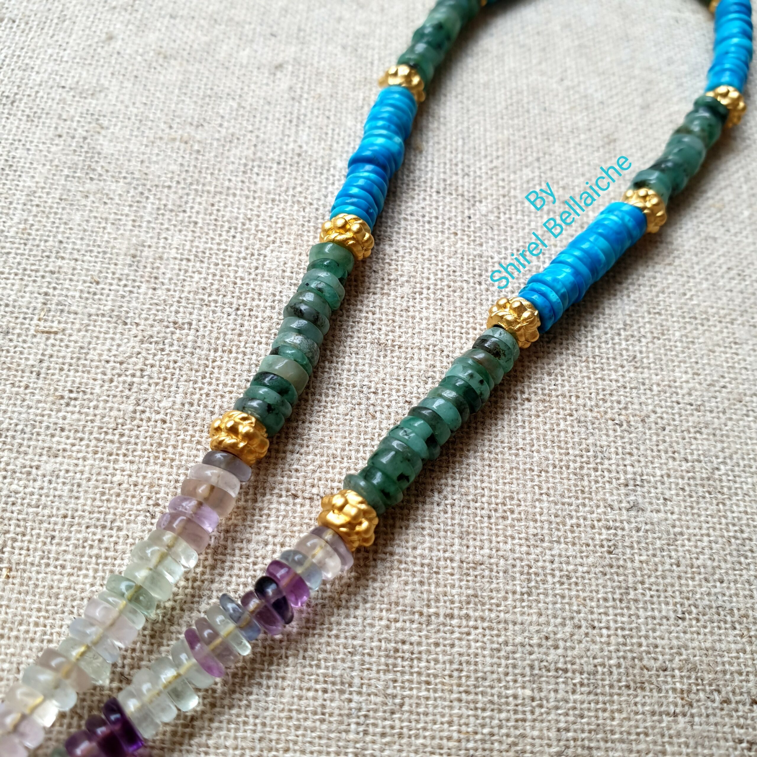 Bahamas est un collier composé d un trio de perles semi-spécieuses: à savoir fluorite, émeraudes et turquoise puis également de perles plaquées or.