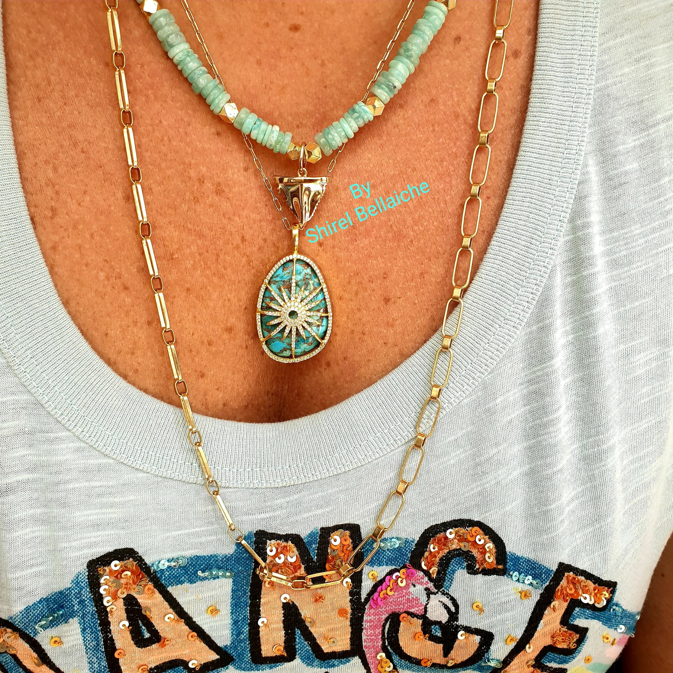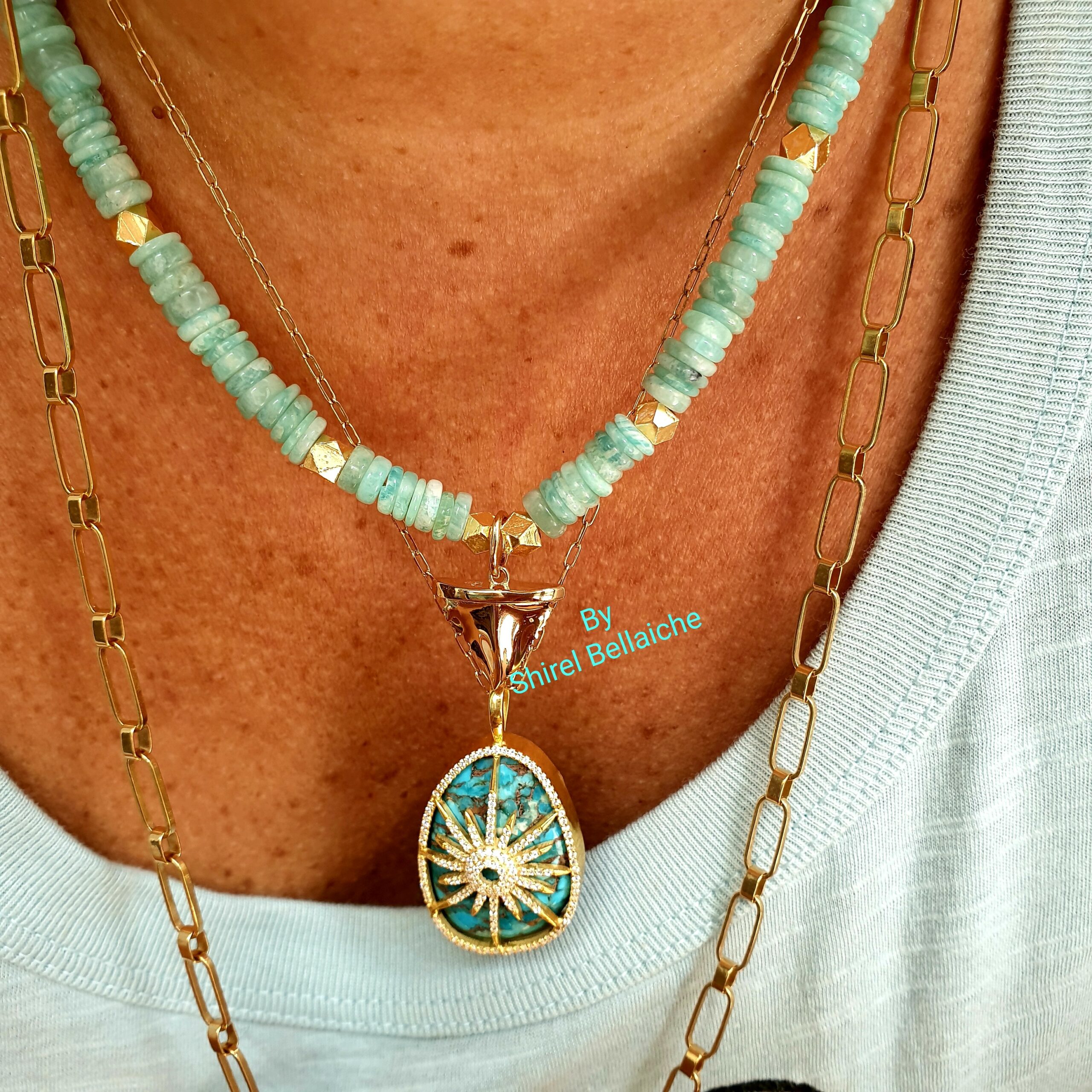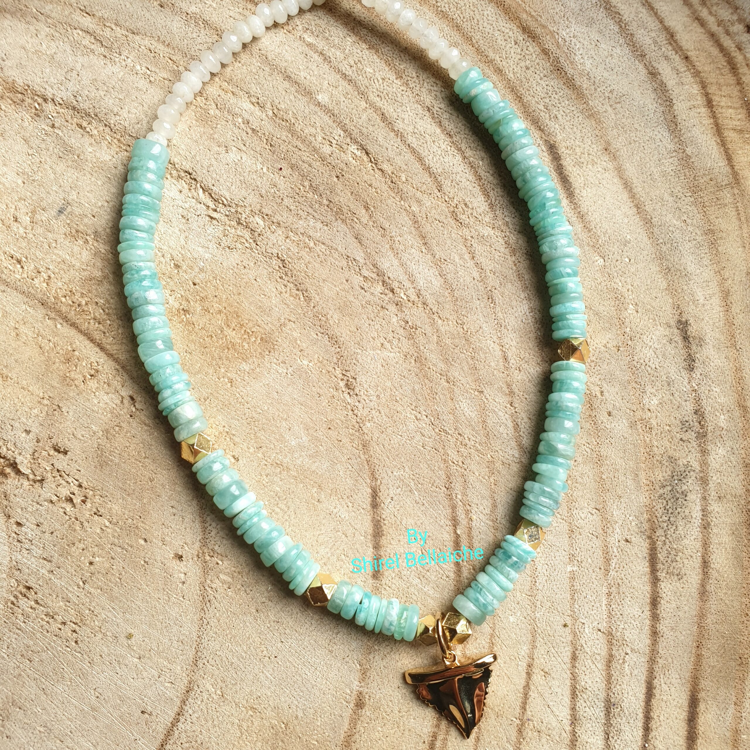 BALI, collier en perles d amazonite et plaquées or avec son pendentif plaqué o 3 microns dent de requin.