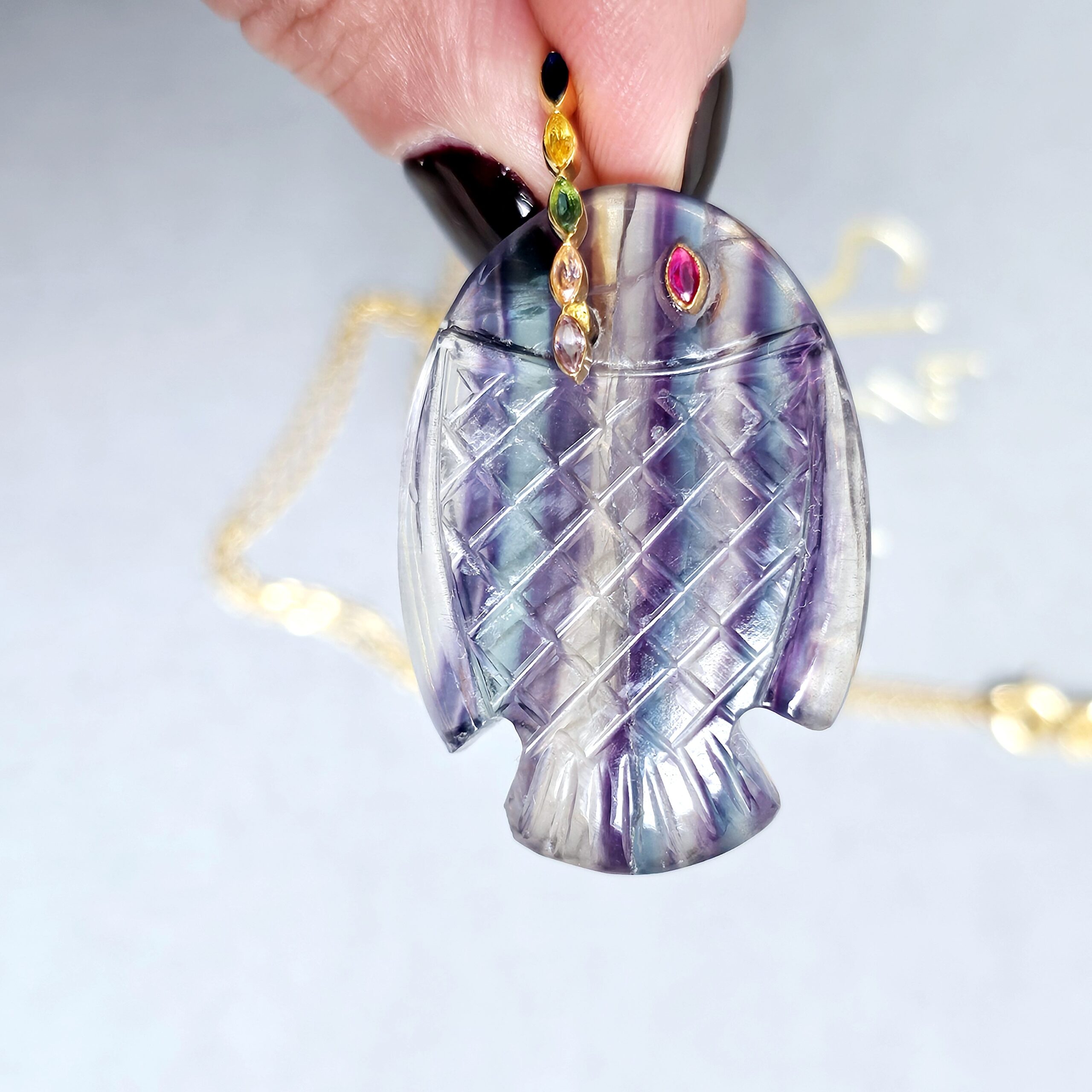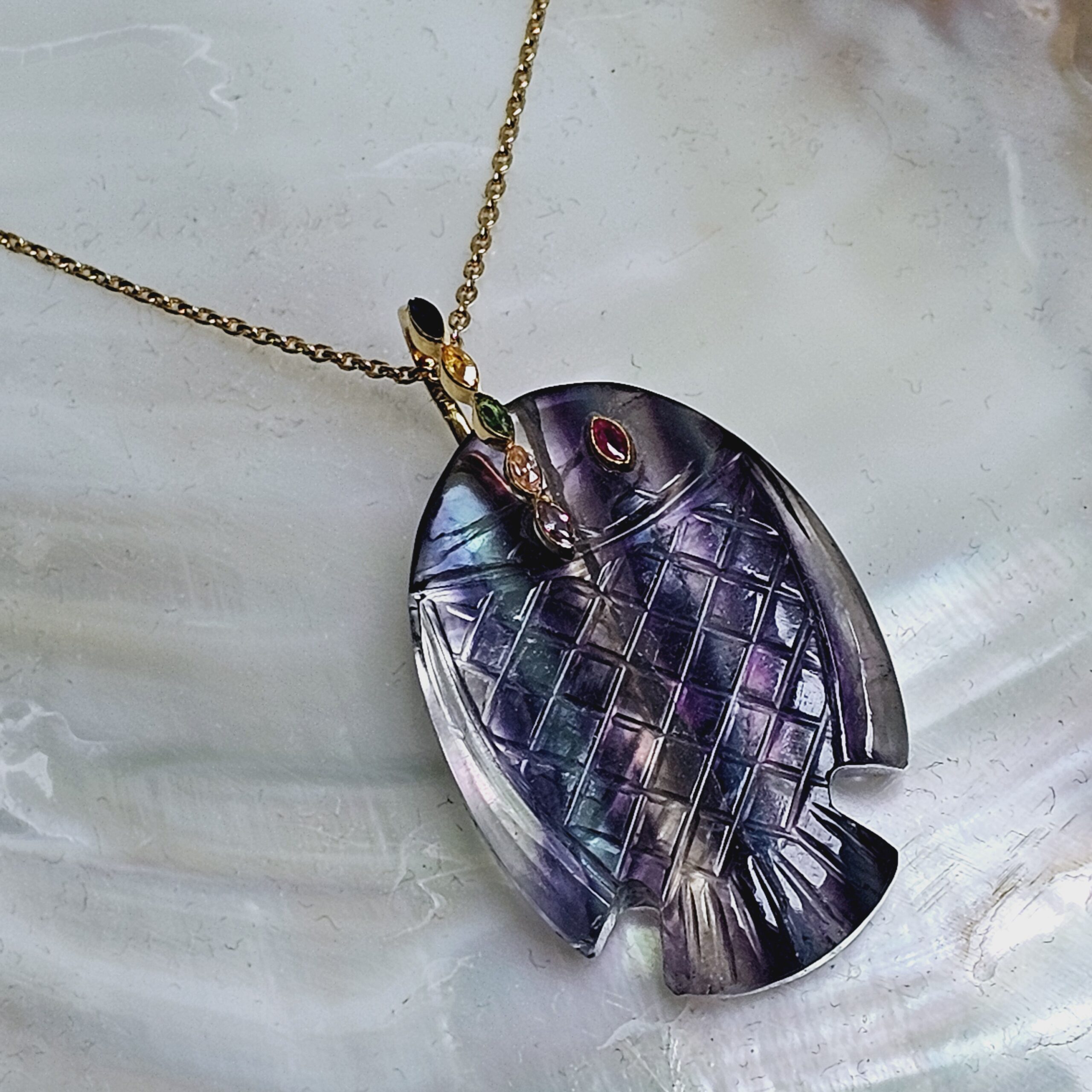 BIG Fish Bélière est proposé ici en pierre naturelle de fluorite, la particularité de ce pendentif poisson est cette bélière mobile qui vous offre la possibilité de le porter aussi sur une chaine plus épaisse ou bien encore un collier en pierres.