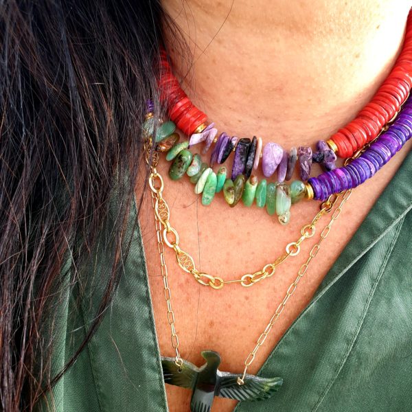 Le contraste du fermoir boué plaqué or fait de ce sautoir un mariage parfait d’esprit chic et Boho