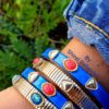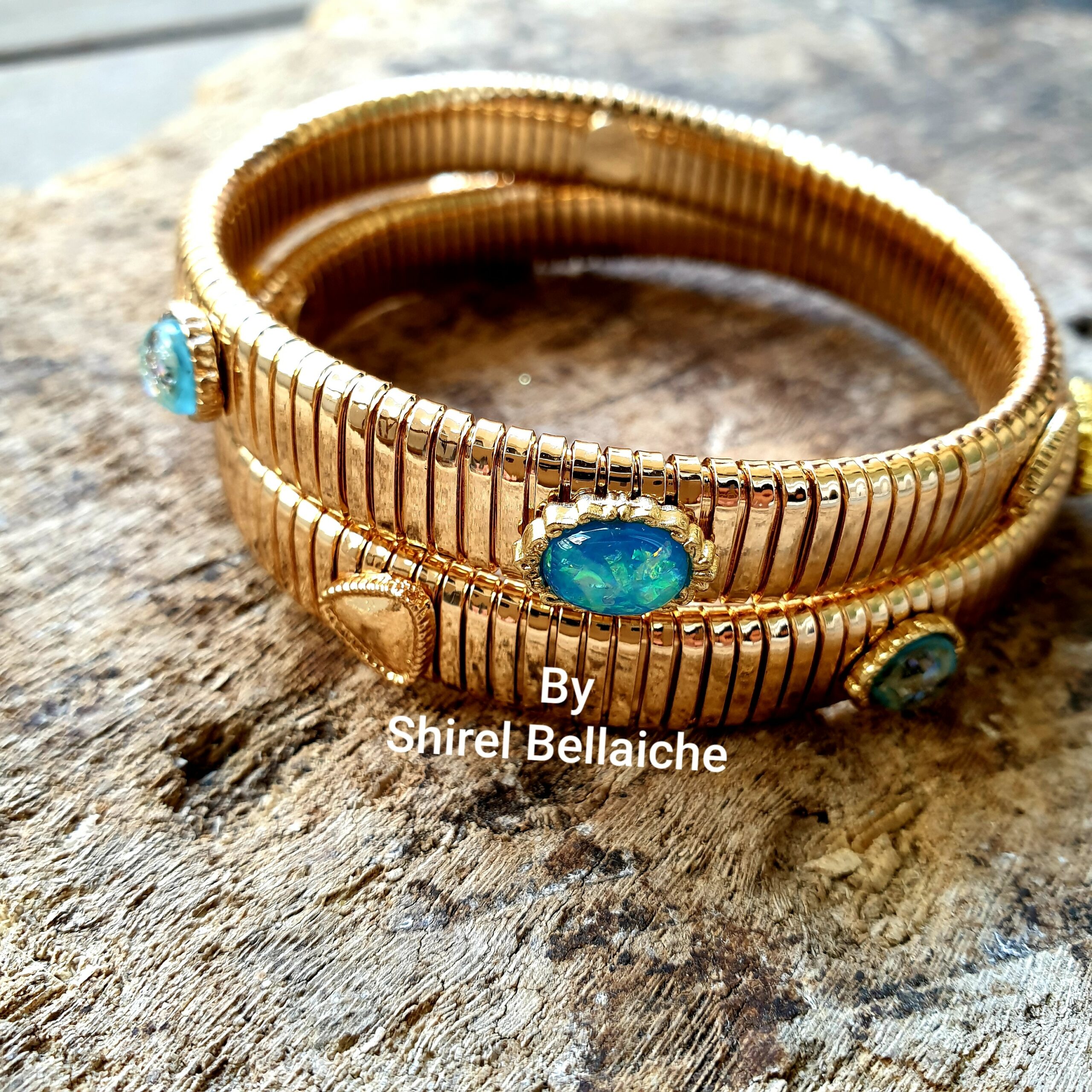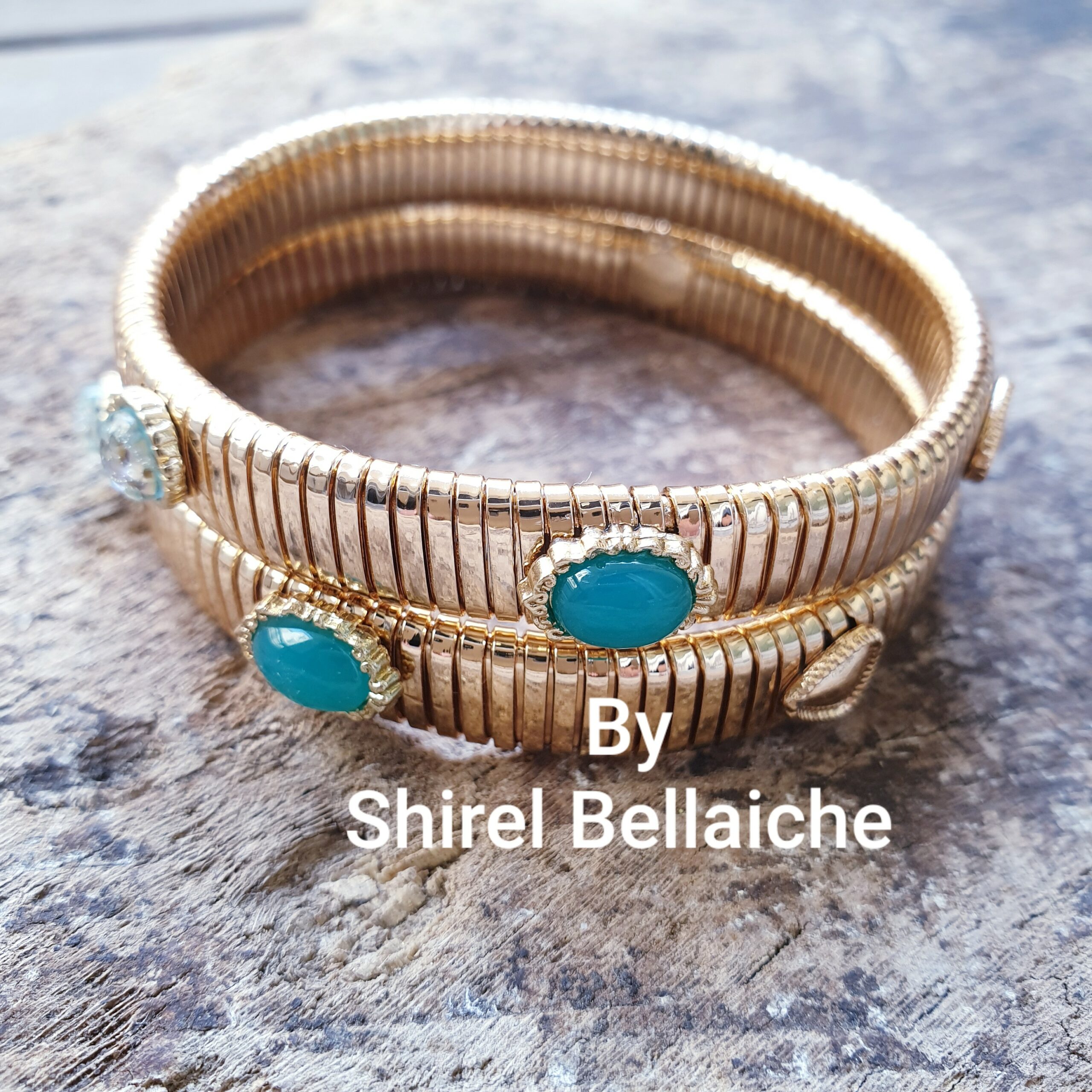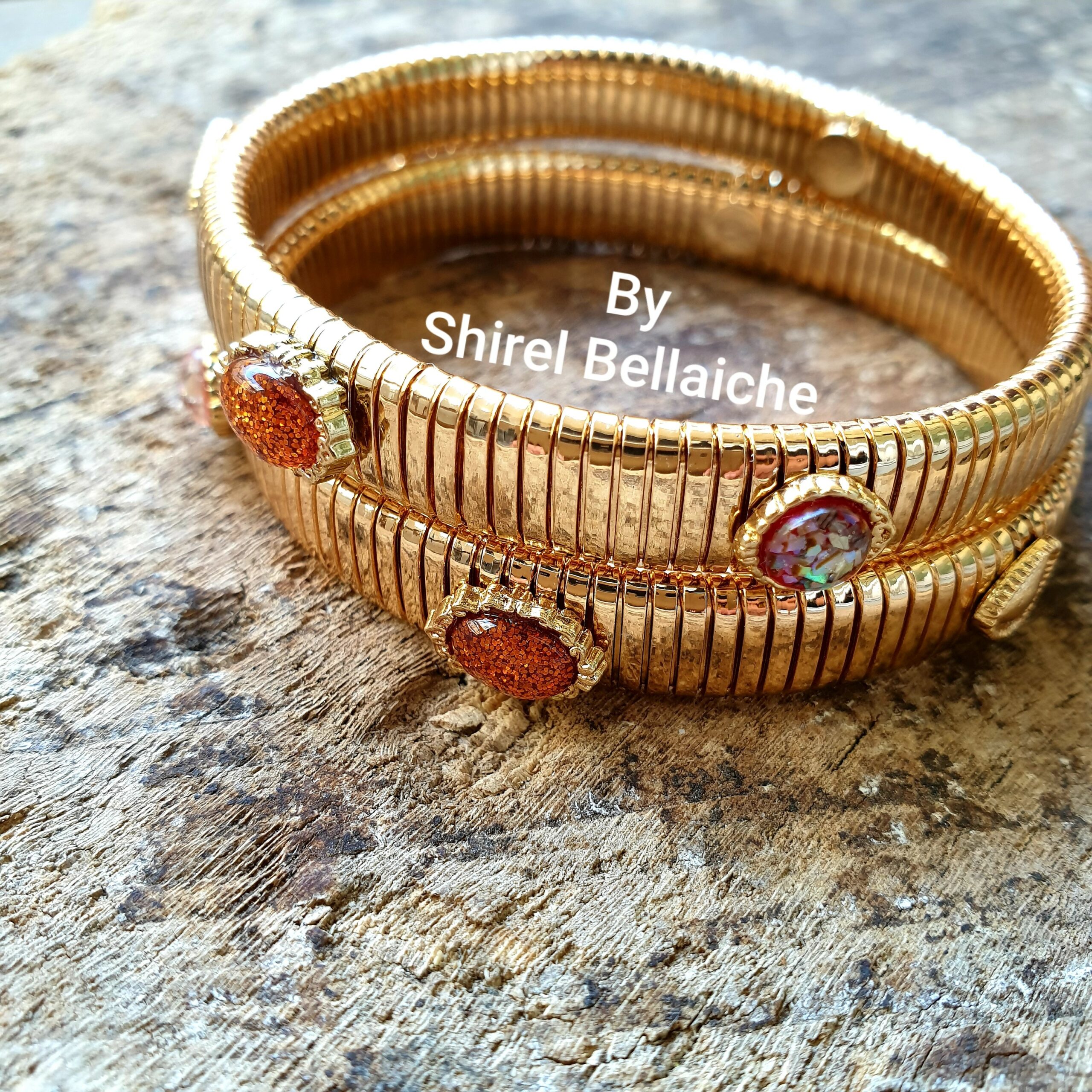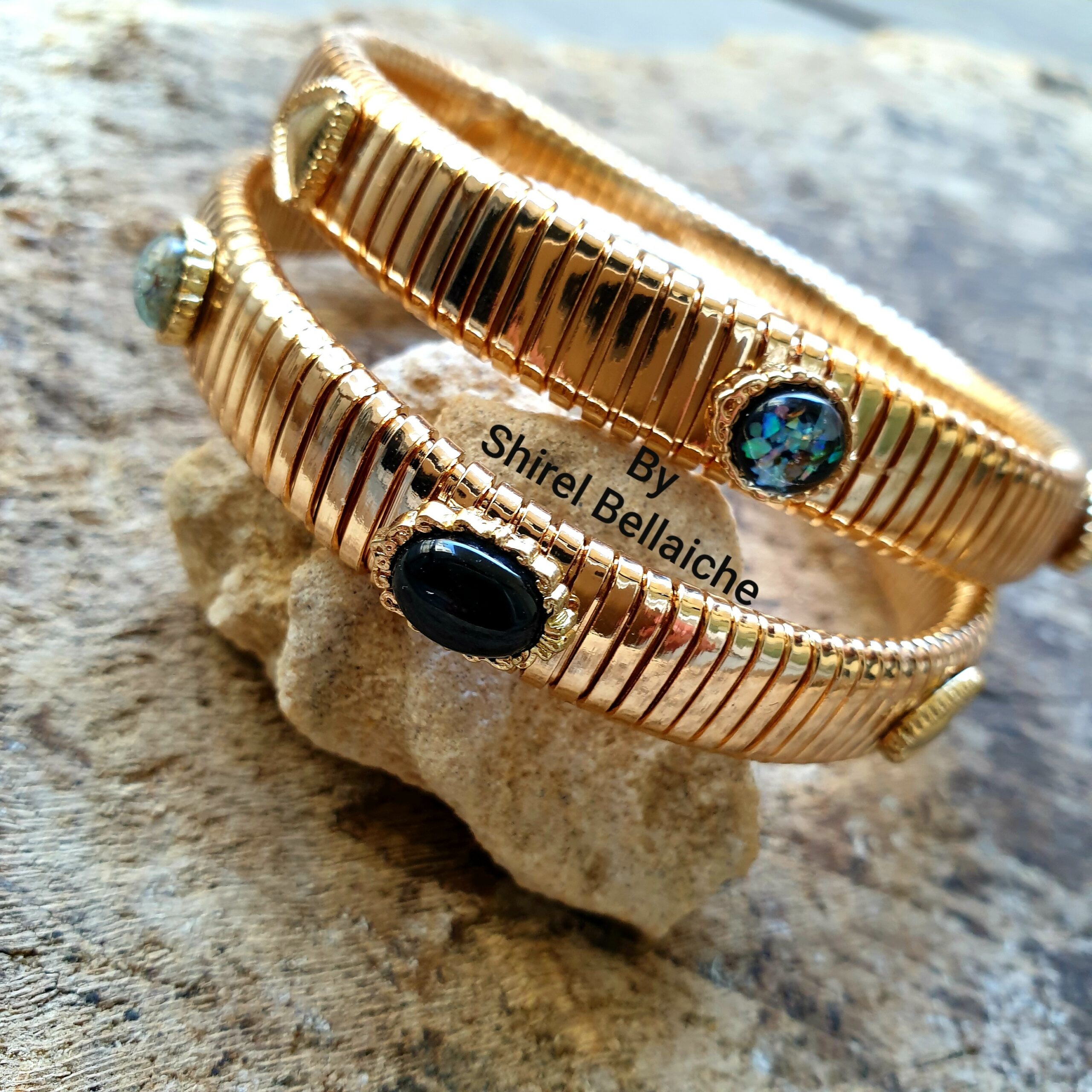 Bracelet souple version doré , orné de pierres naturelles de différentes couleurs. La structure dorée renferme un élastique qui lui permet de s’ajuster à tous les poignets.