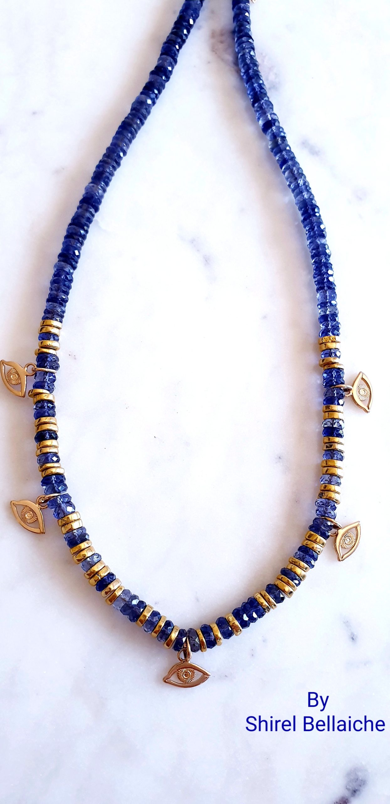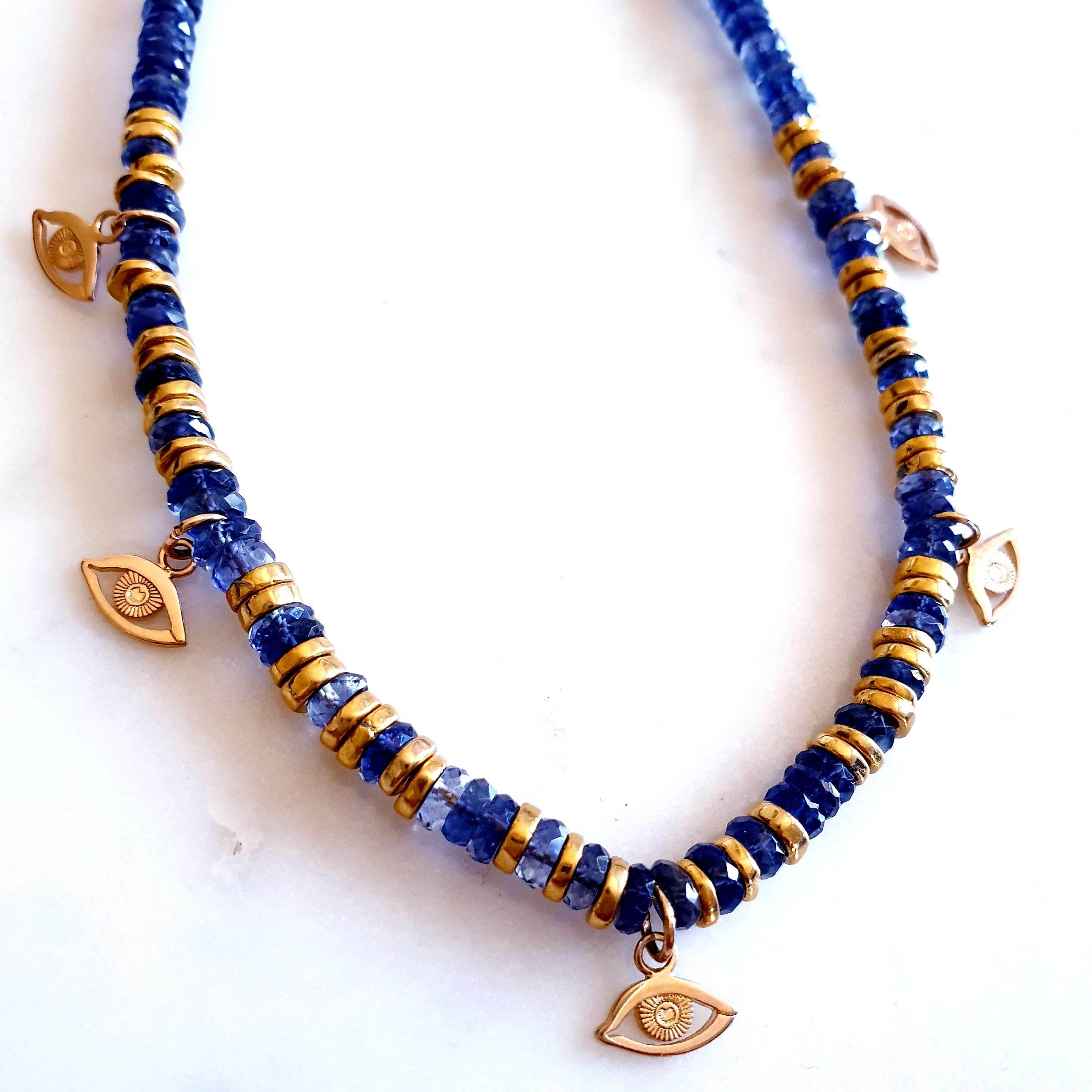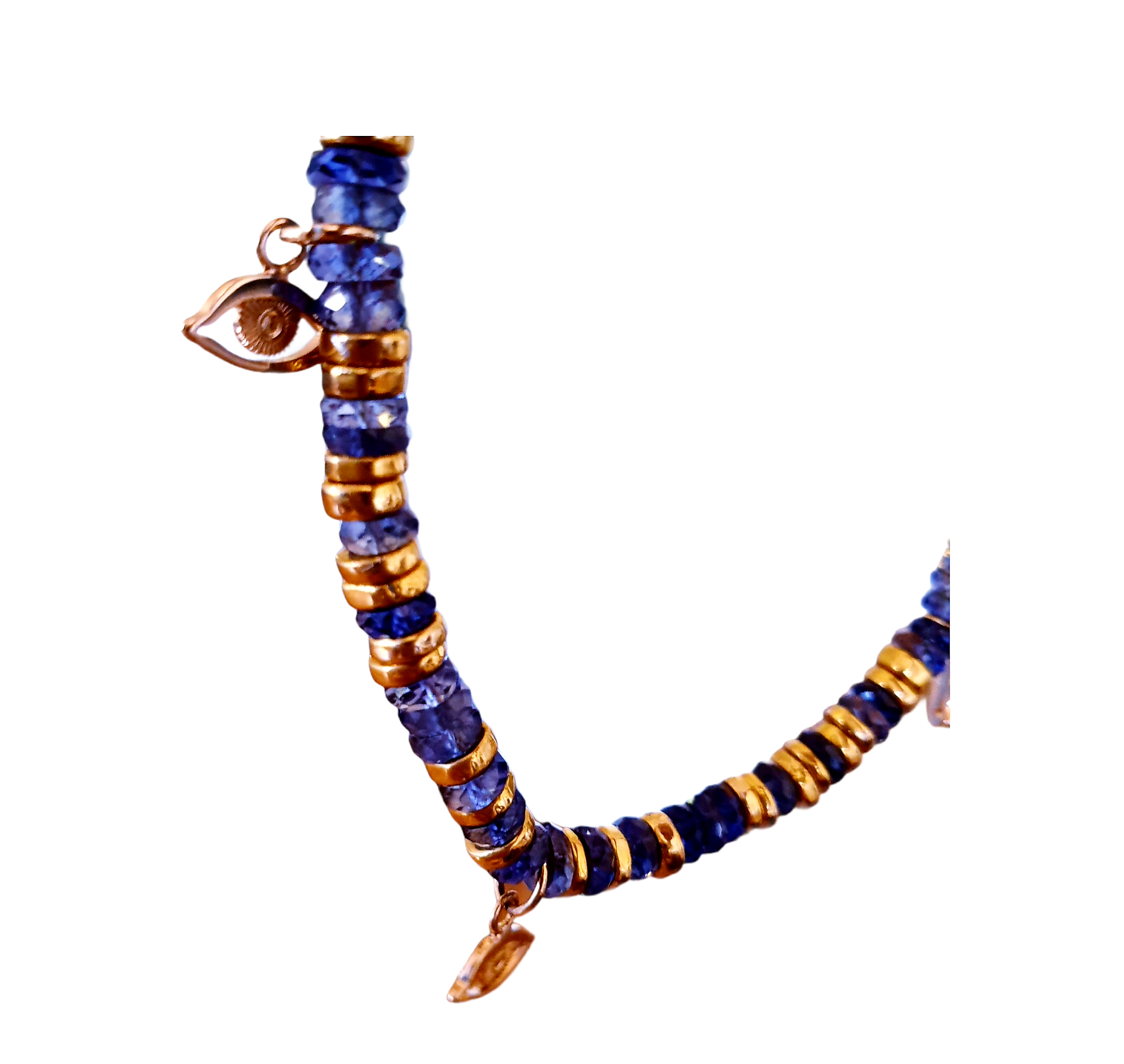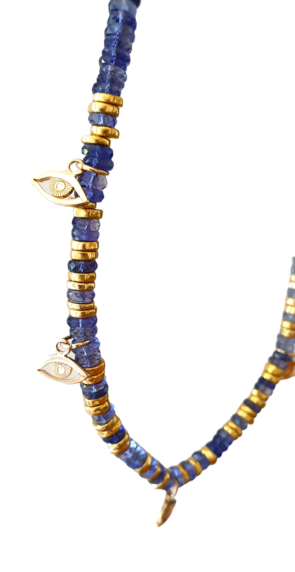 BYZANCE tout en perles d’iolite facettées et pyrites, avec cinq mini yeux plaqués or 3 microns.
