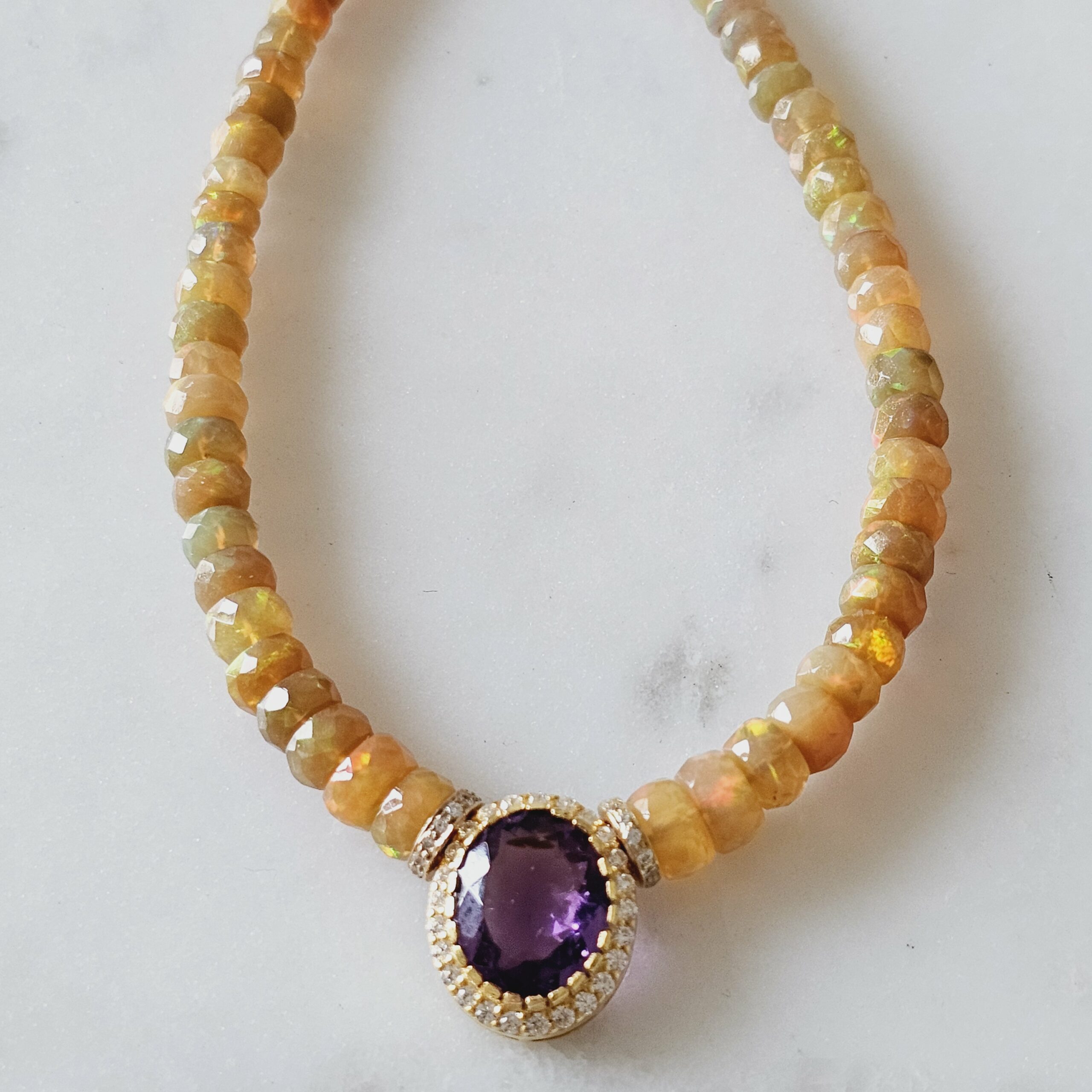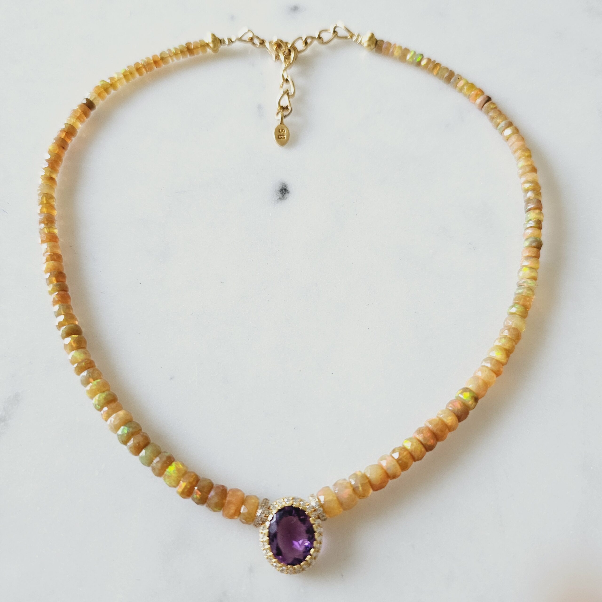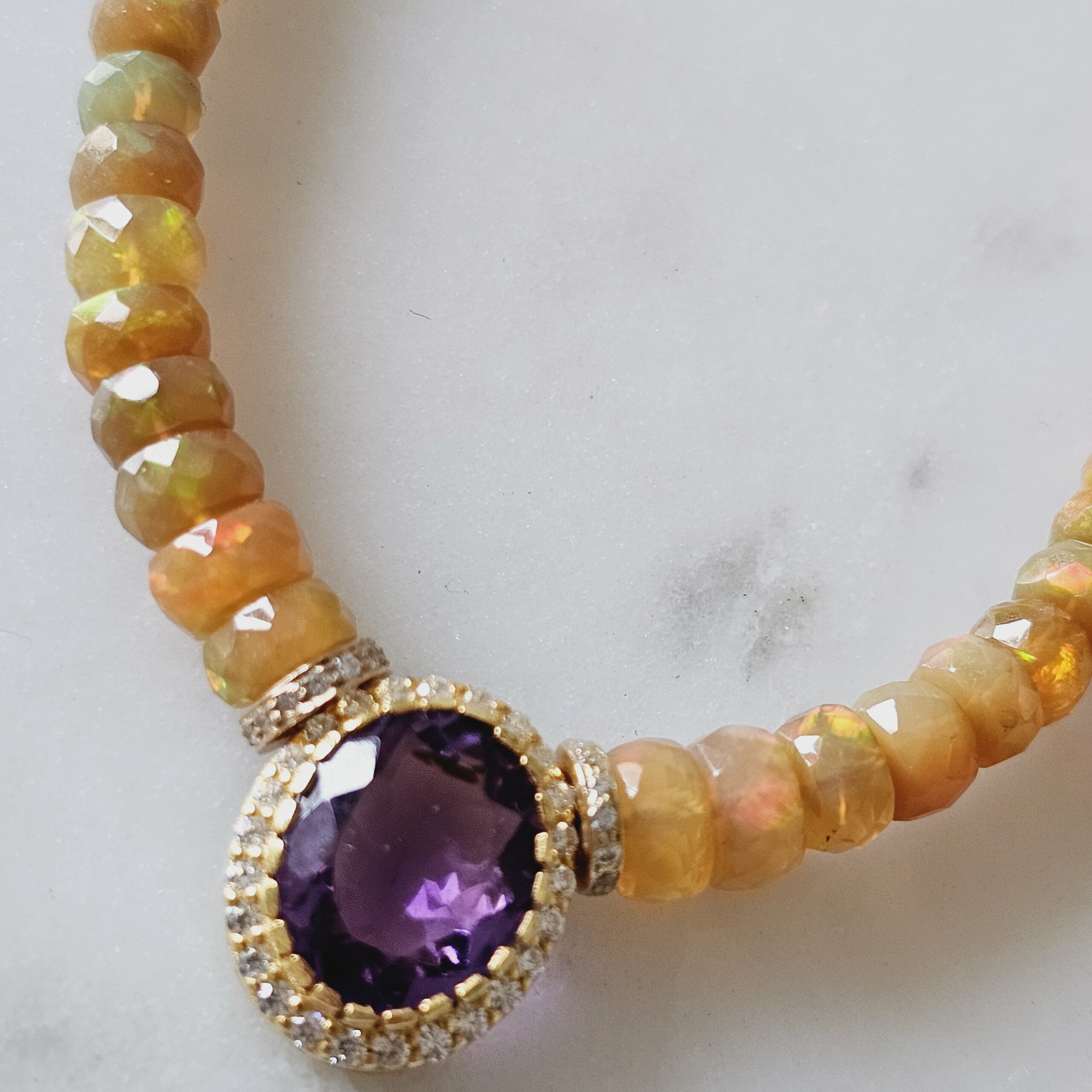CHARLIZE est tout en pierres naturelles d’opales jaunes Ethiopienne et zircons, avec au centre un pendentif “coussin” en améthyste serti tout autour de zircons.