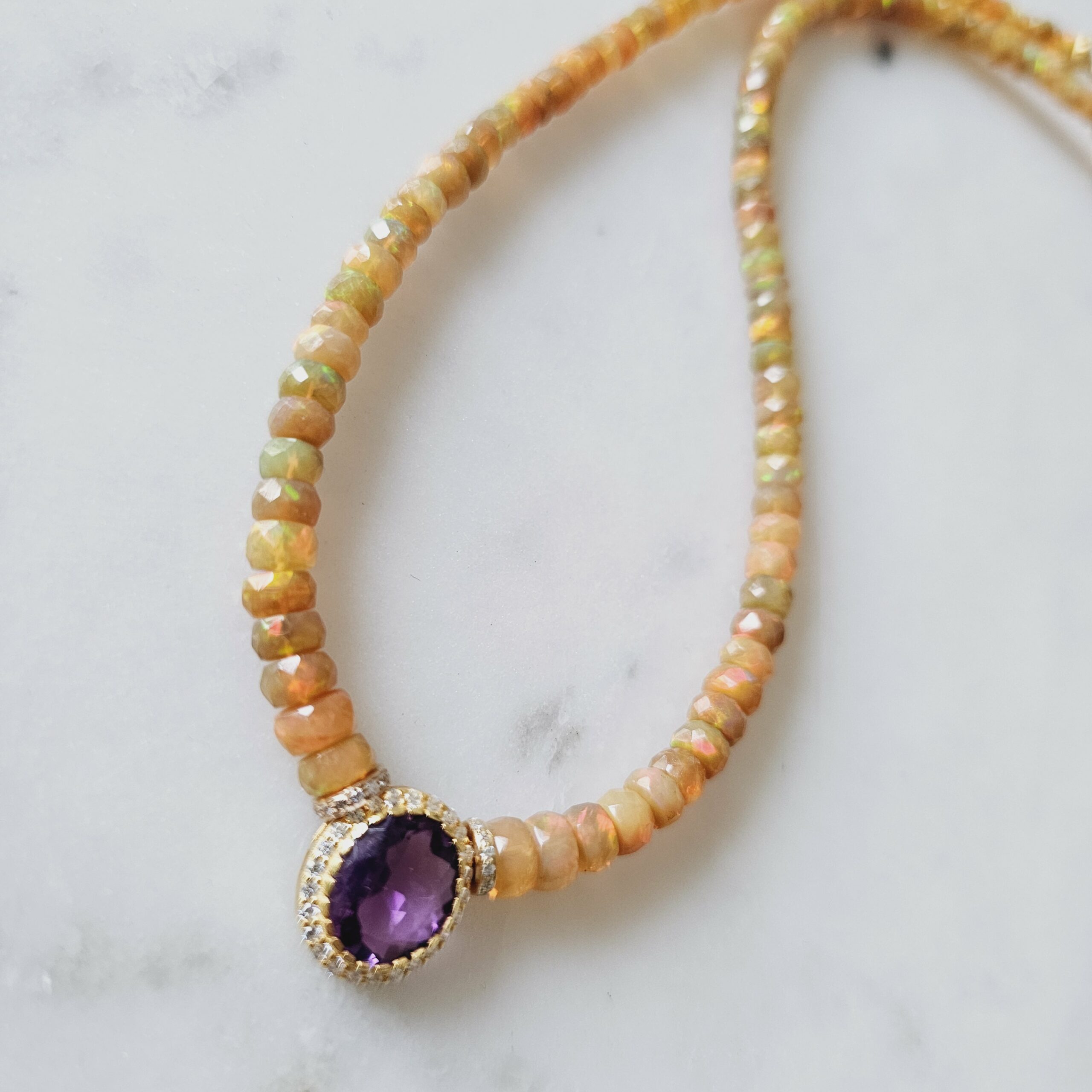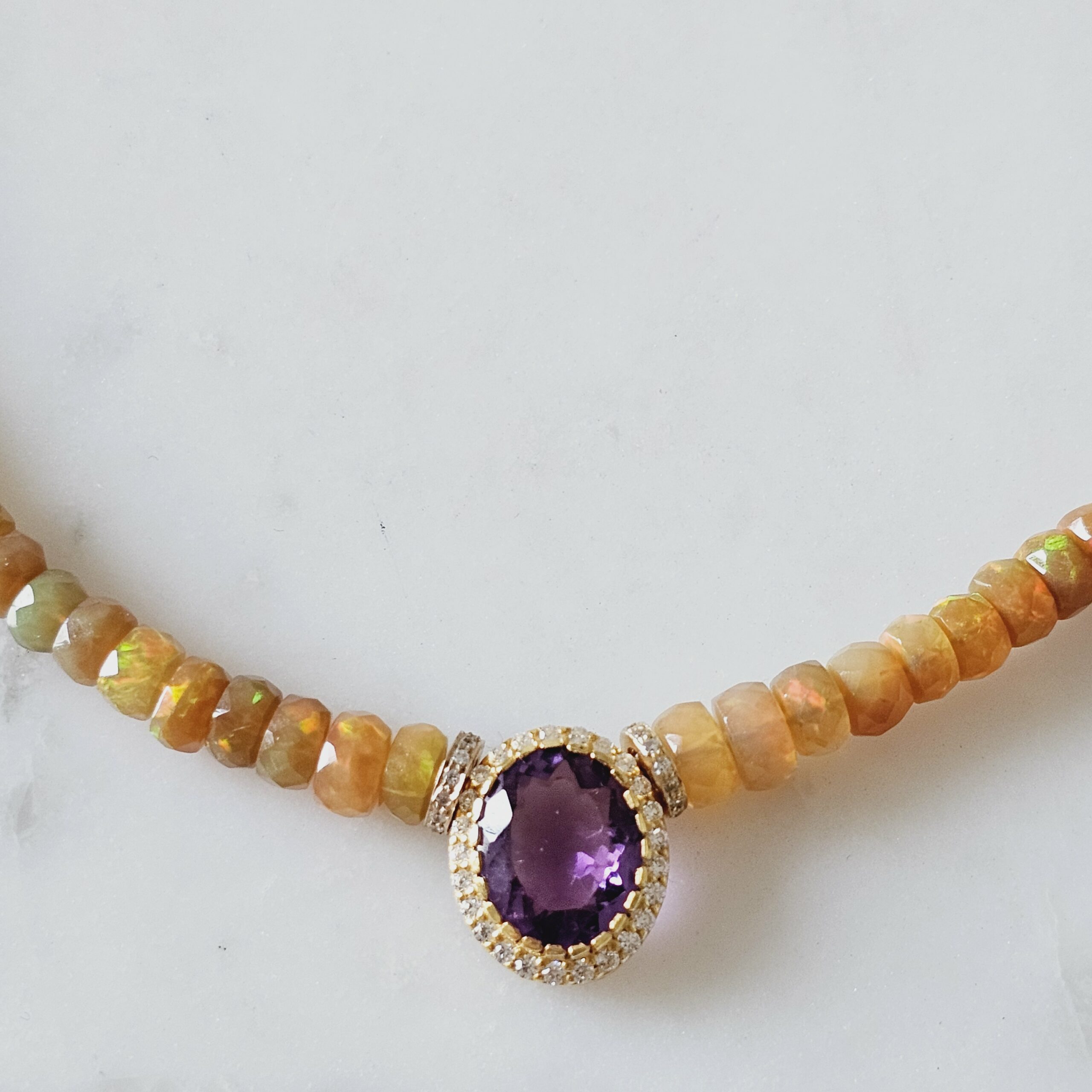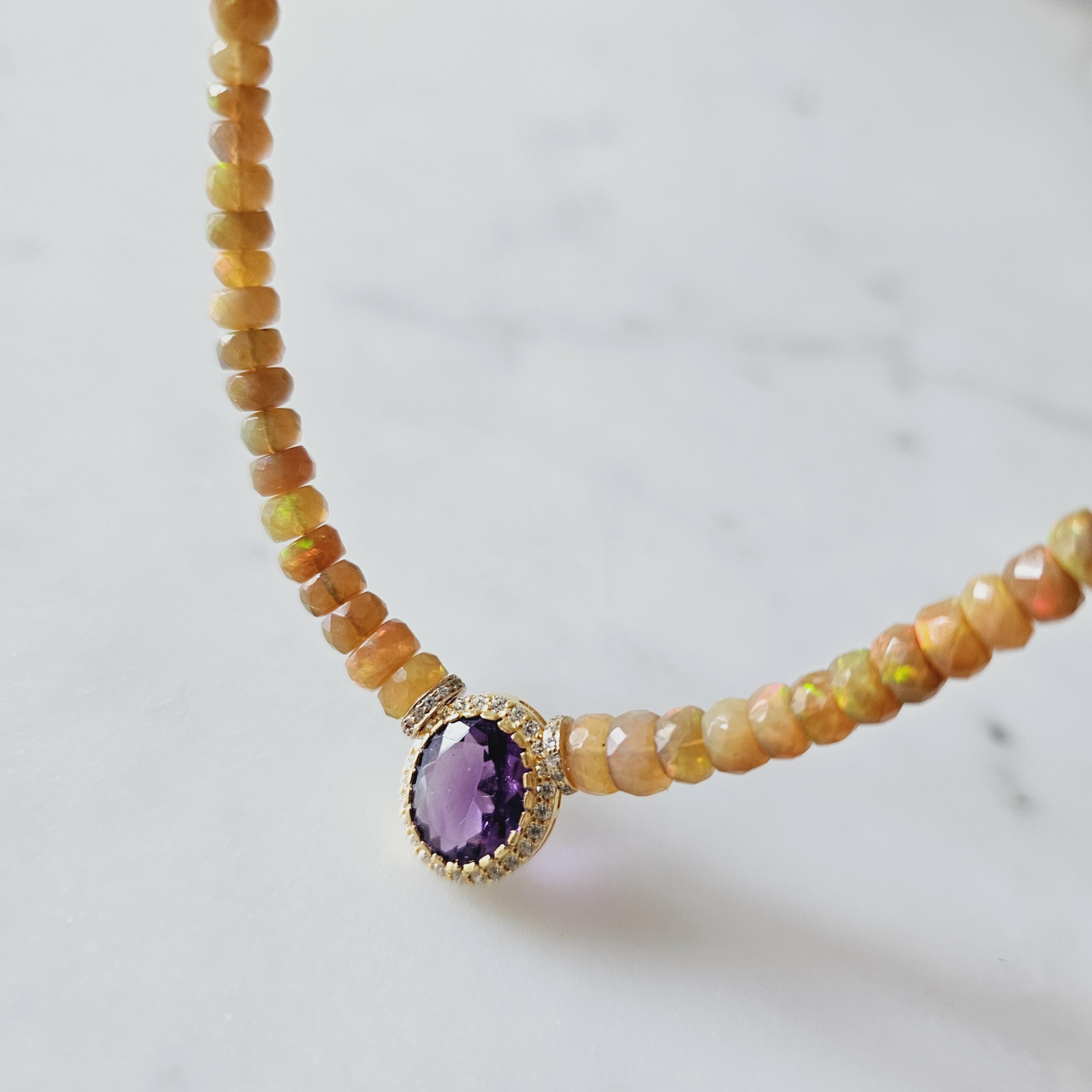 CHARLIZE est tout en pierres naturelles d’opales jaunes Ethiopienne et zircons, avec au centre un pendentif “coussin” en améthyste serti tout autour de zircons.