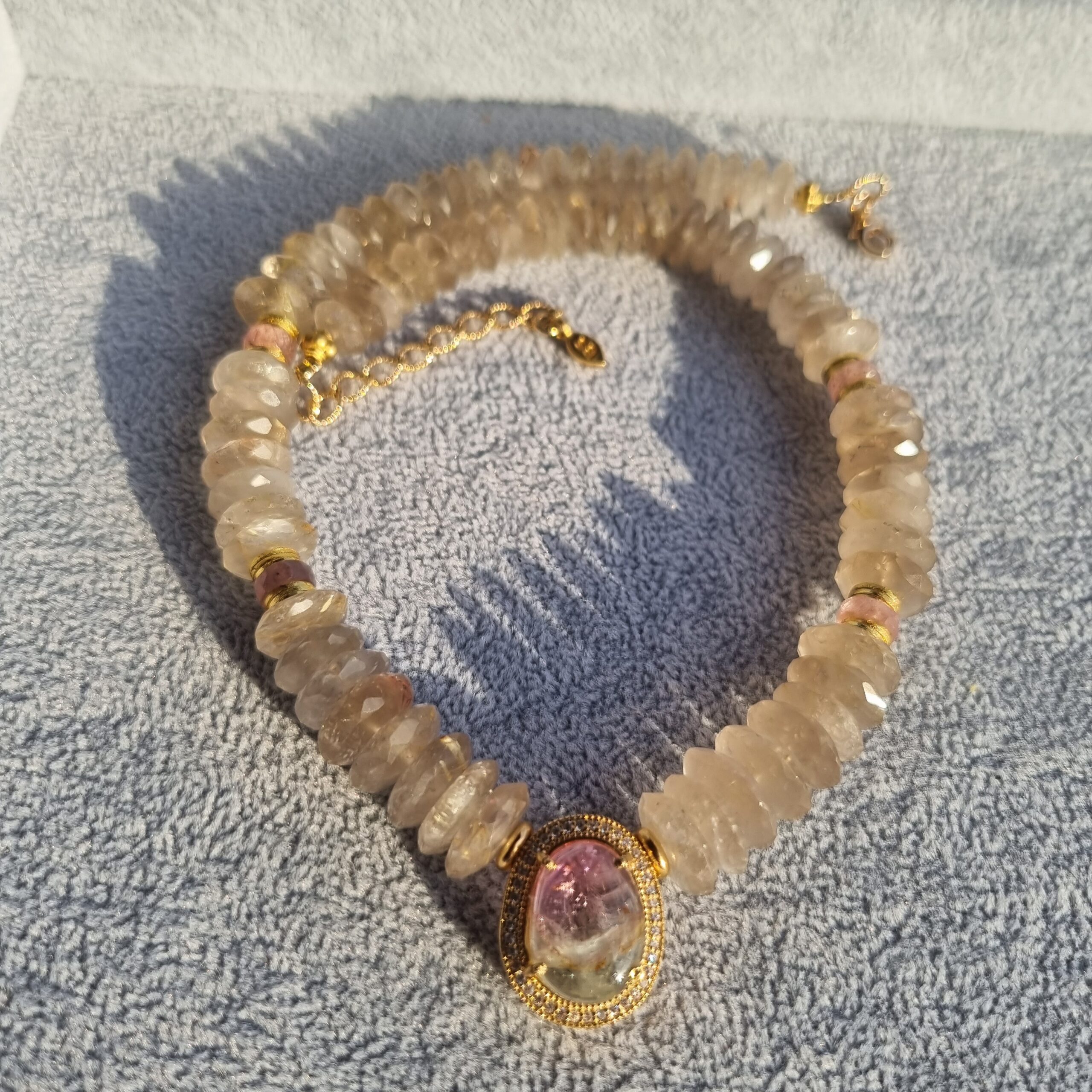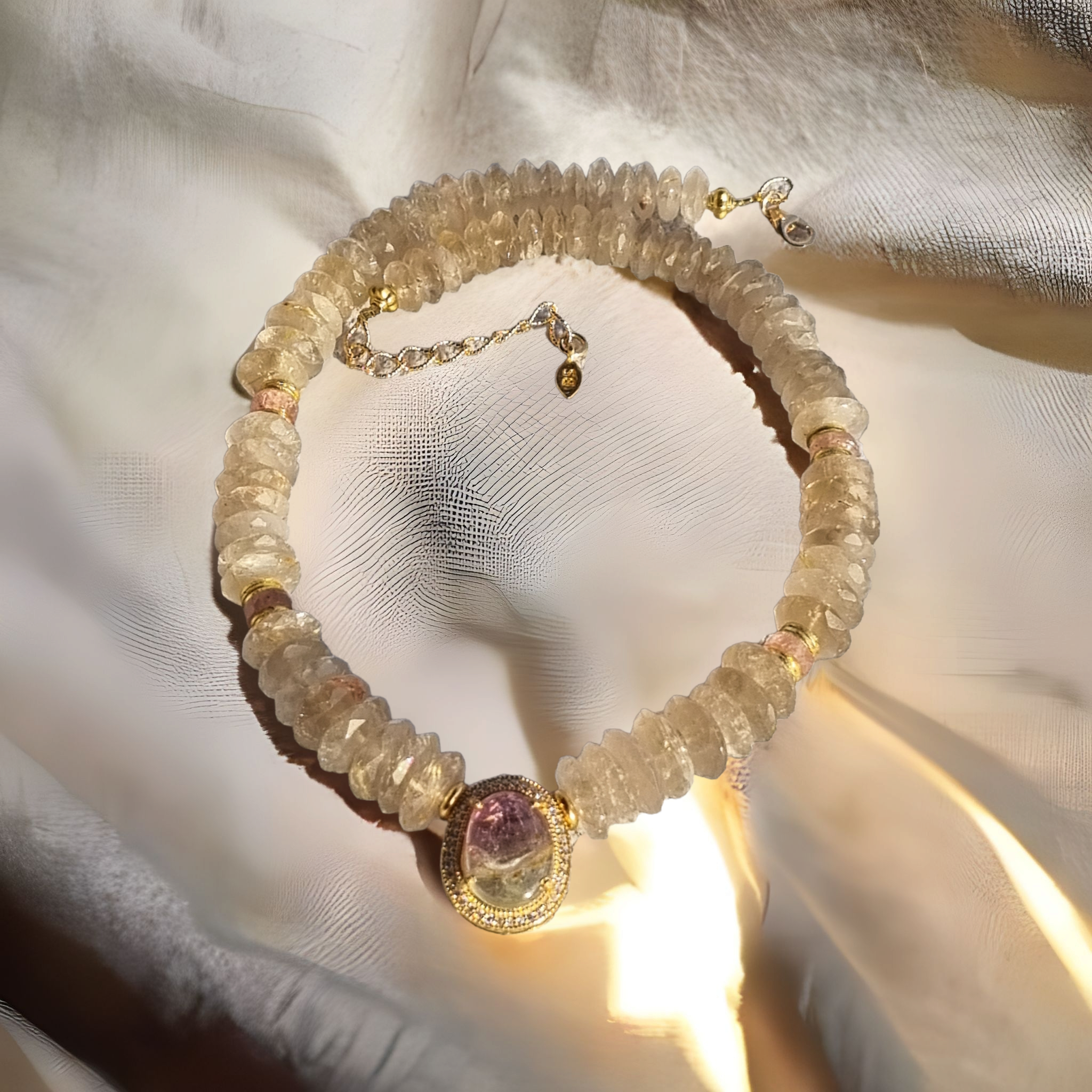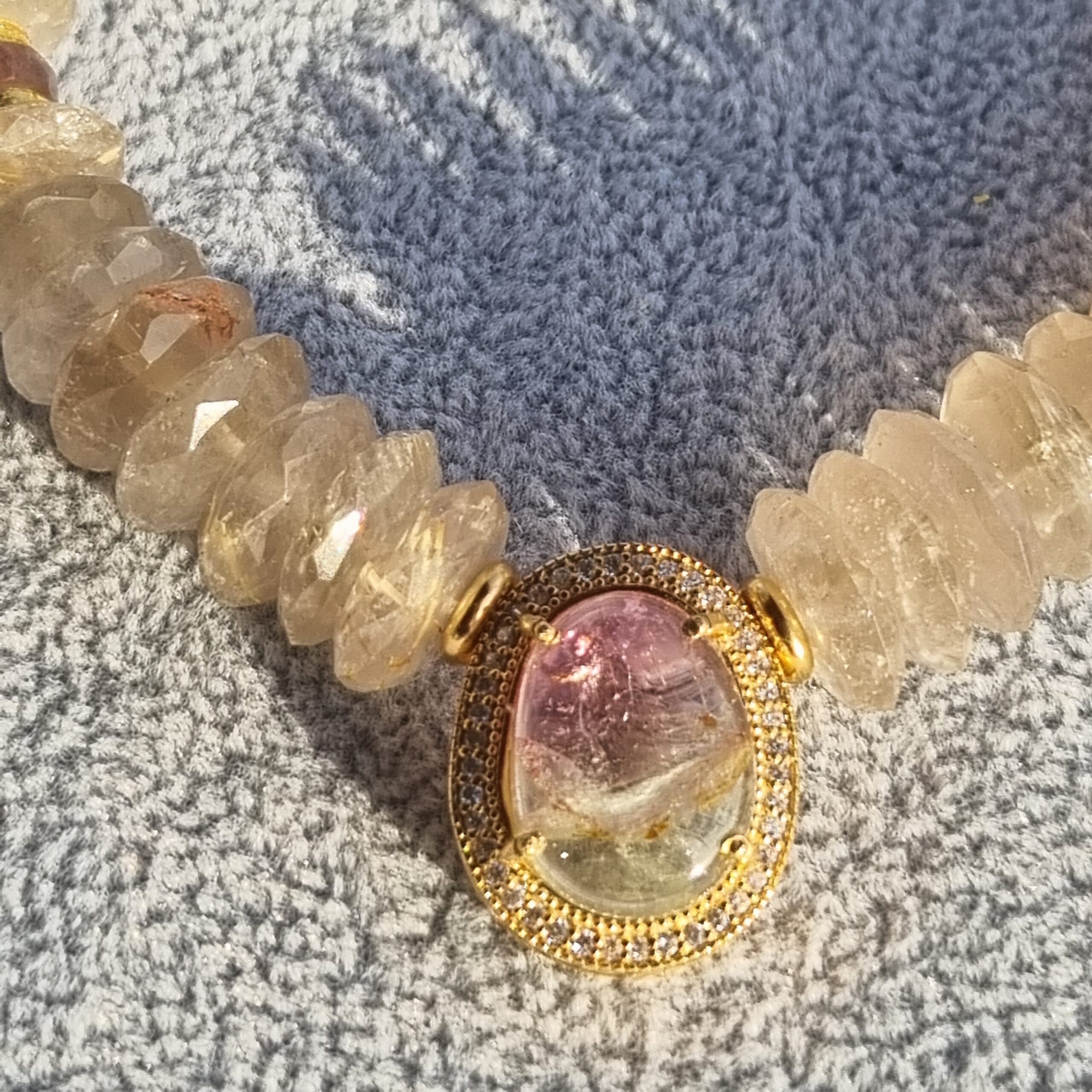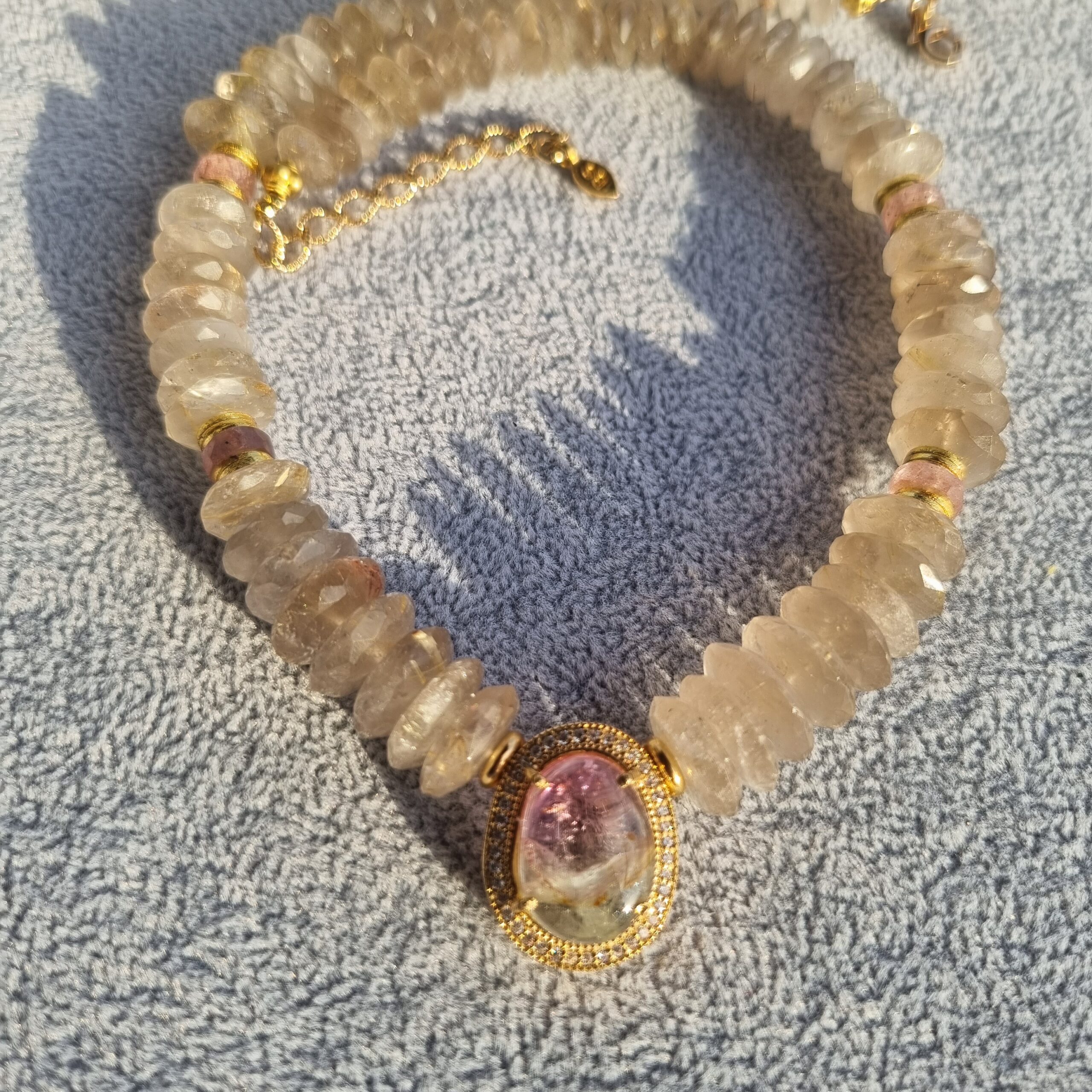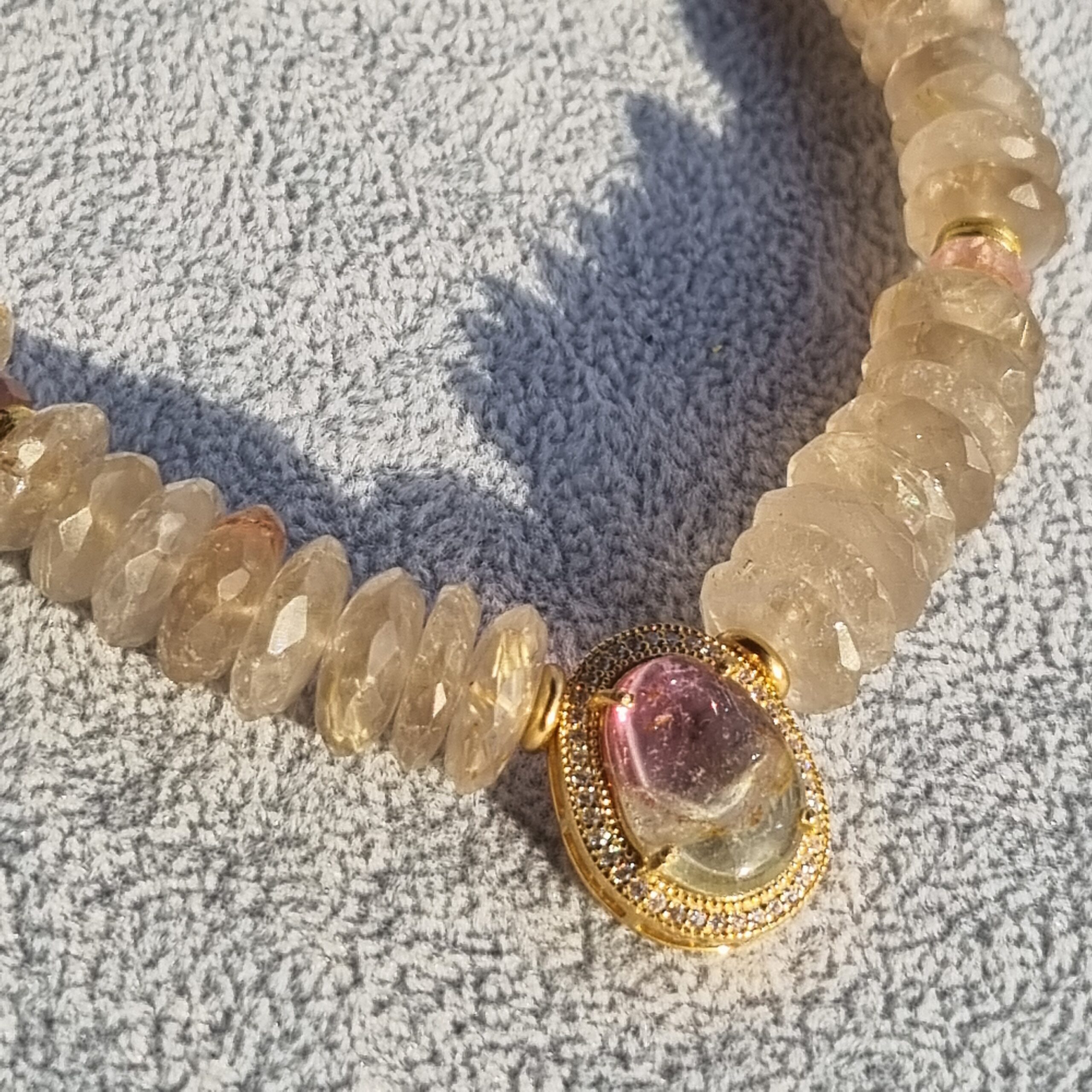 CHLOE est tout en golden rutile avec au centre une watermelon tourmaline naturelle mais surtout unique car ces pierres ont la particularité d’être singulières. Ce qui offre à cette création une pièce unique.