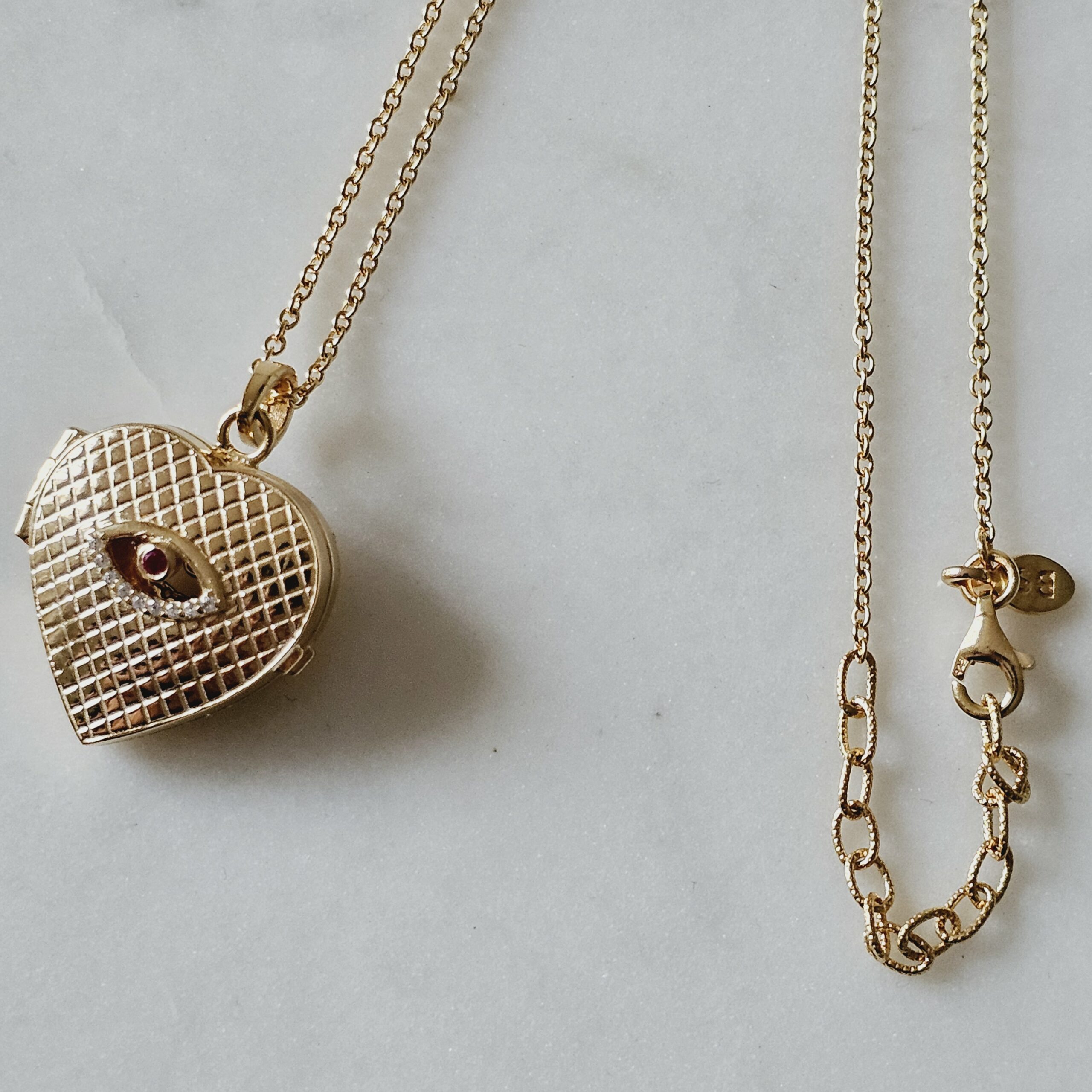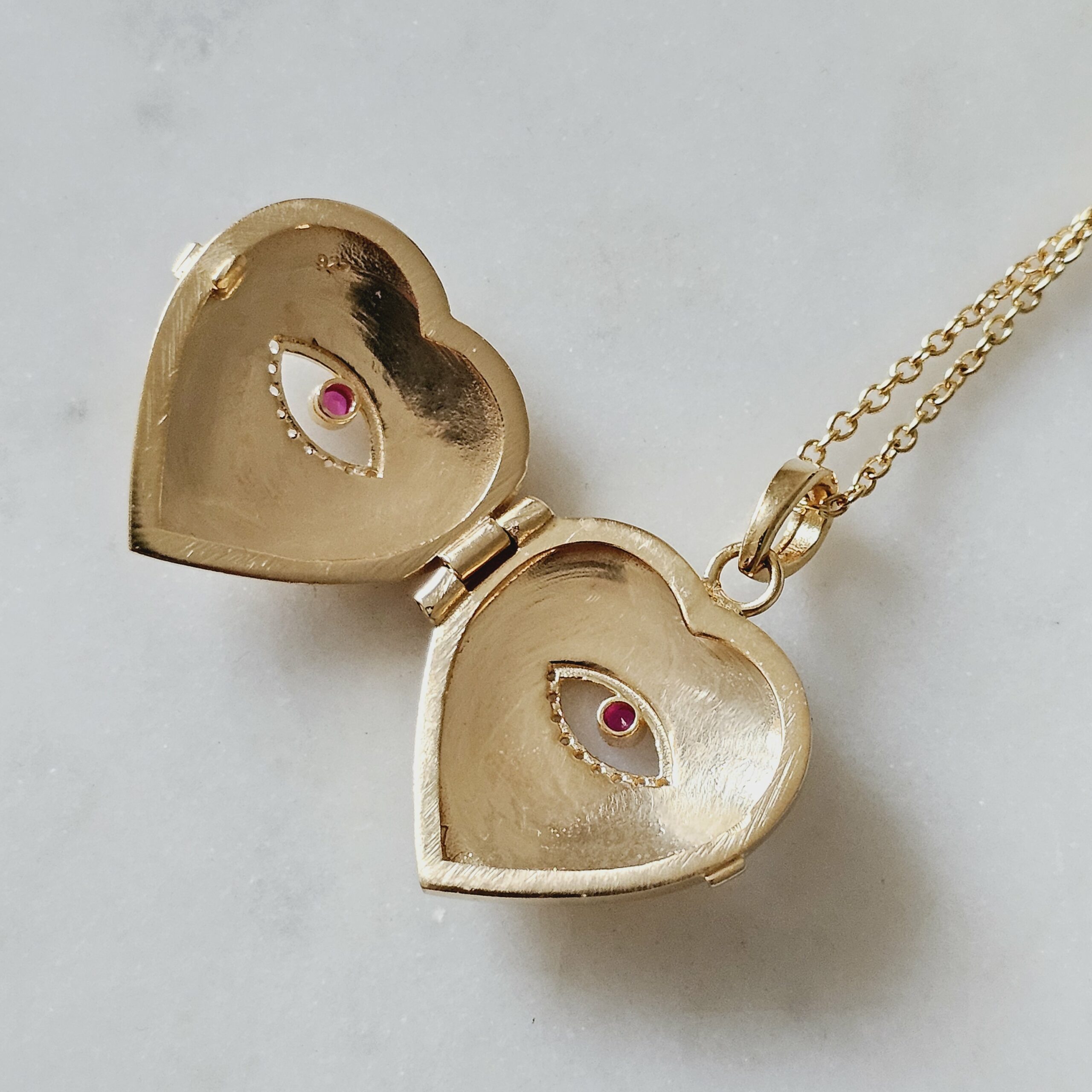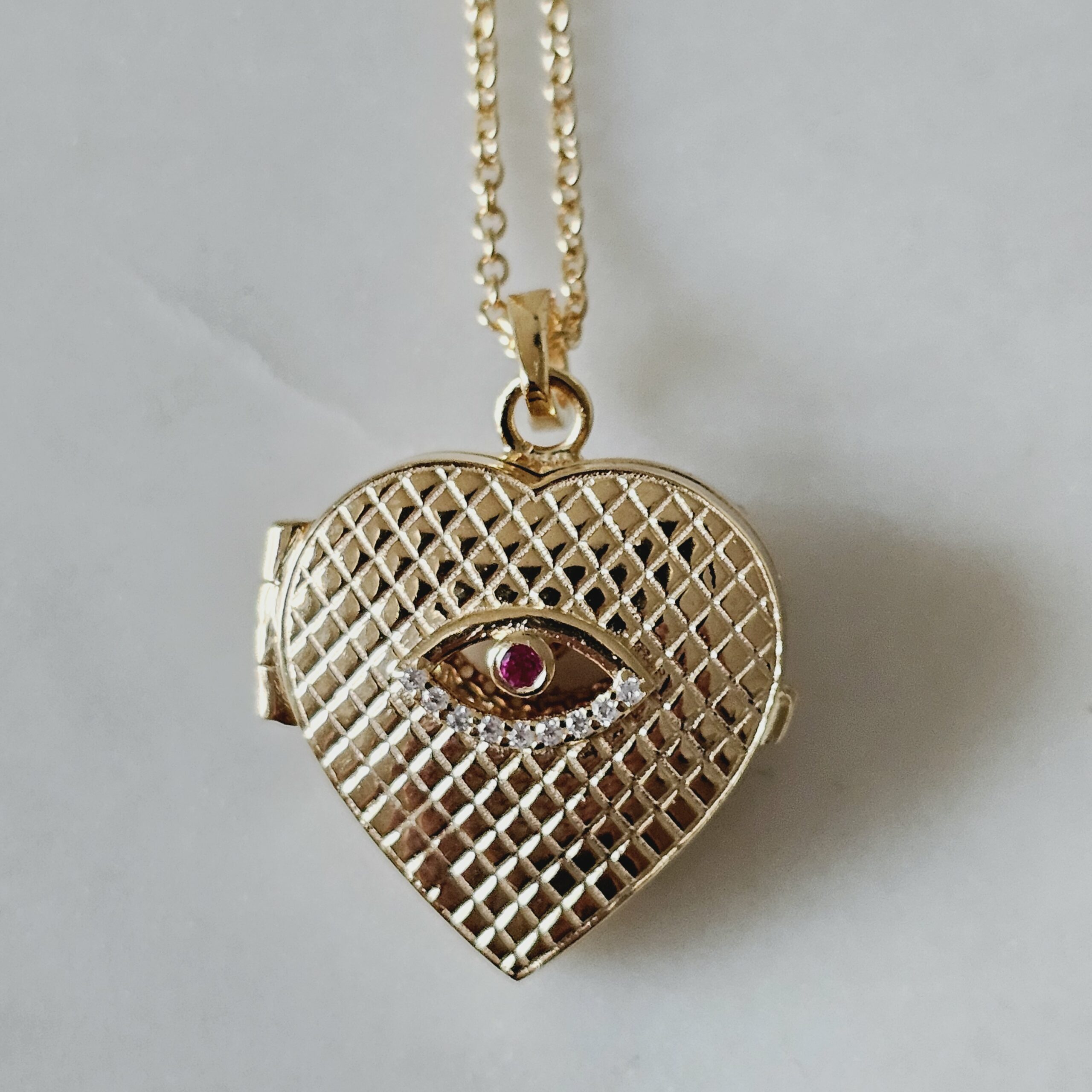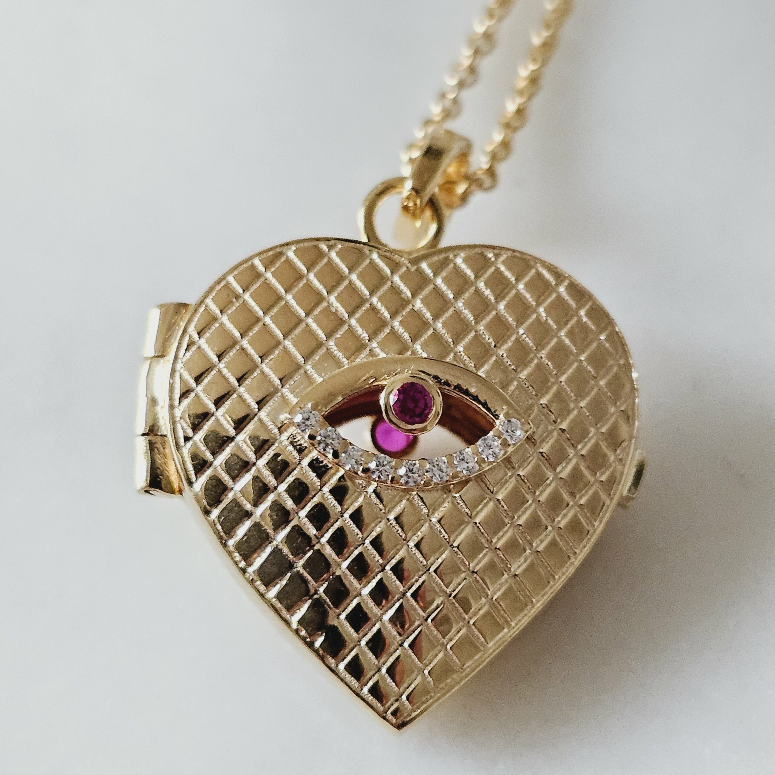 Cœur Protection est un pendentif coeur avec au centre un petit oeil de protection tout en zircon et son iris est en grenat. Il est tout en argent 925 plaqué or. Le pendentif s’ouvre pour que vous puissiez y glisser à l intérieur ce que vous désirez. Les deux faces du pendentif sont identiques.