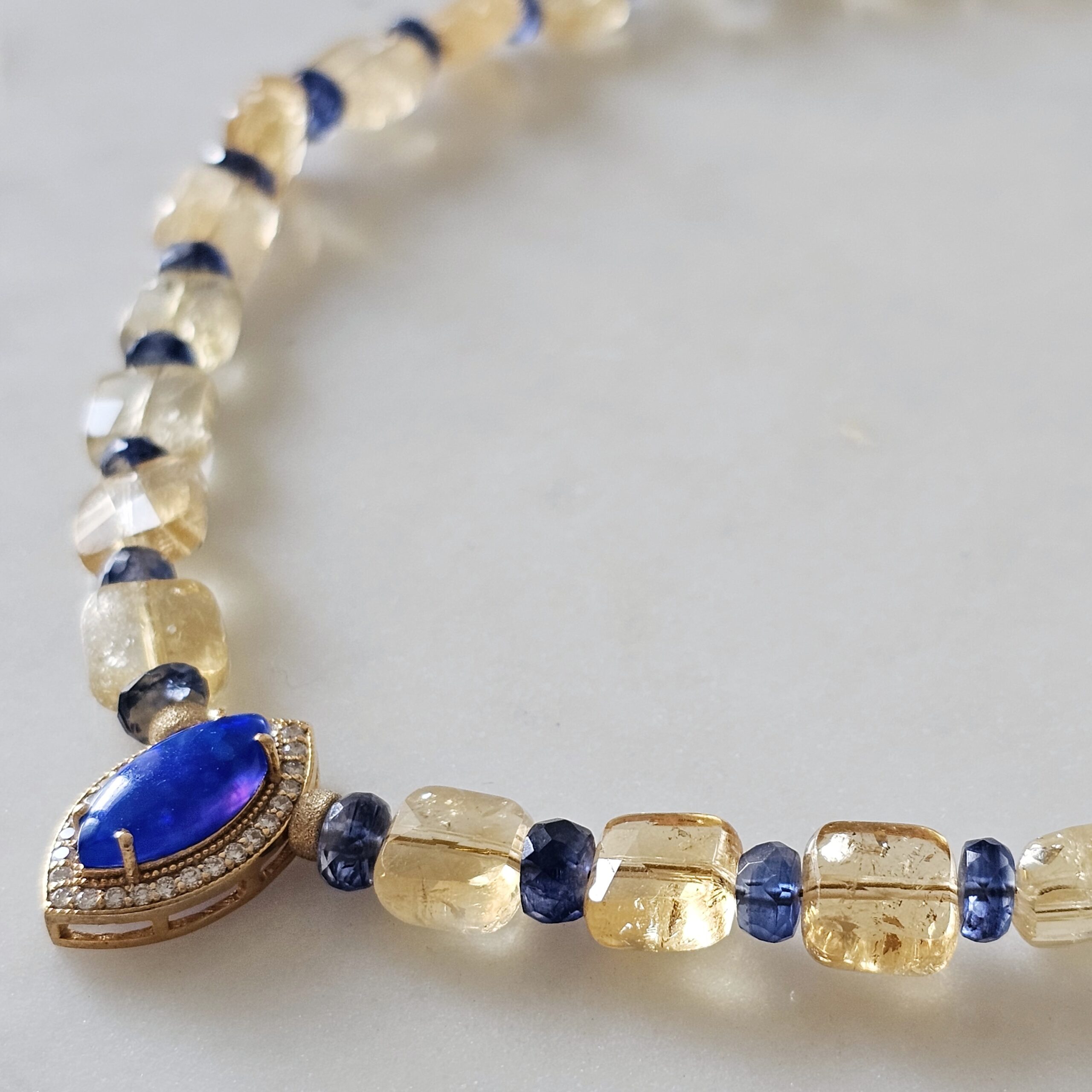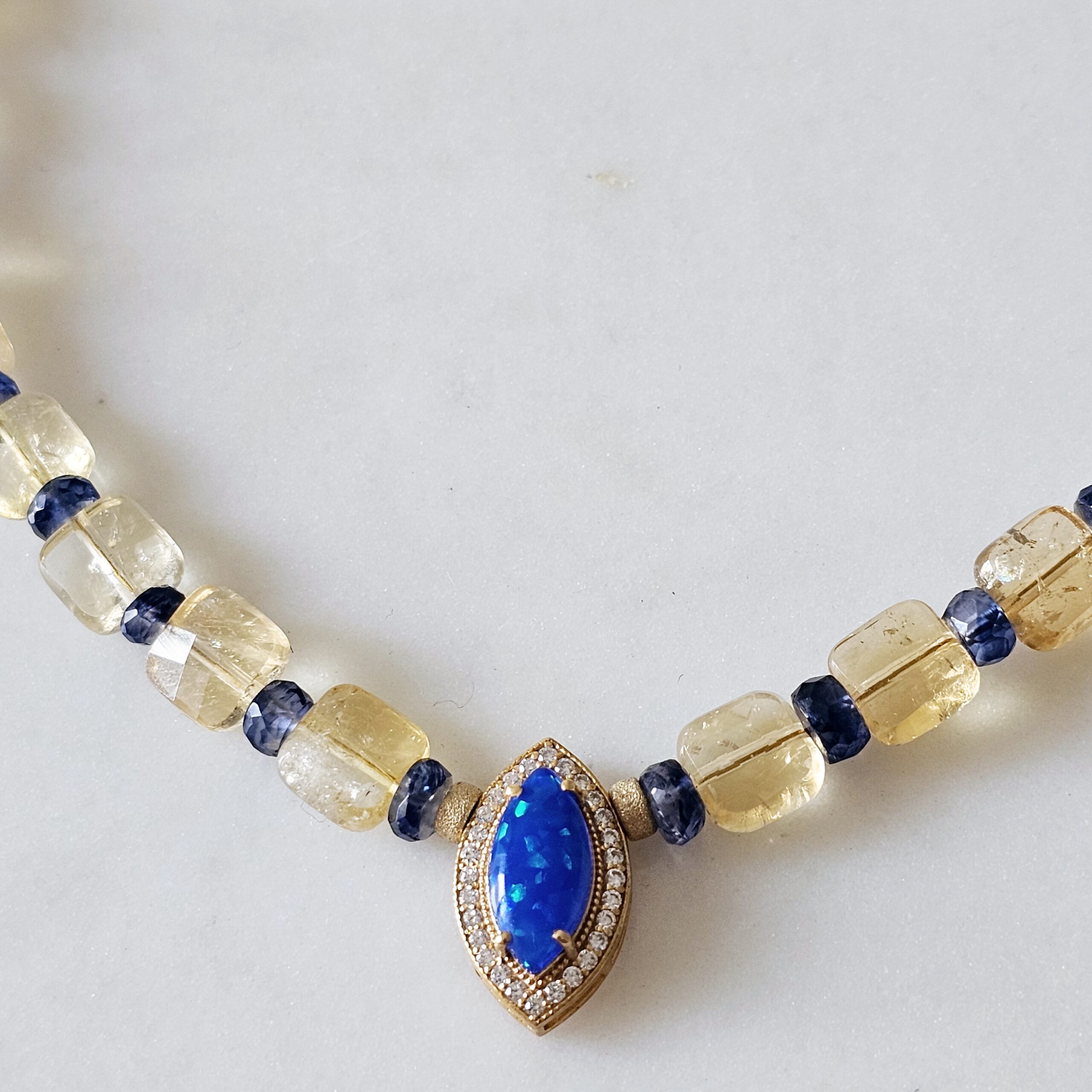 DAISY est tout en pierres naturelles de citrine, kyanite, or laminée 14 carats, avec au centre une marquise en argent plaquée or, zircons et opale d’arlequin bleue.