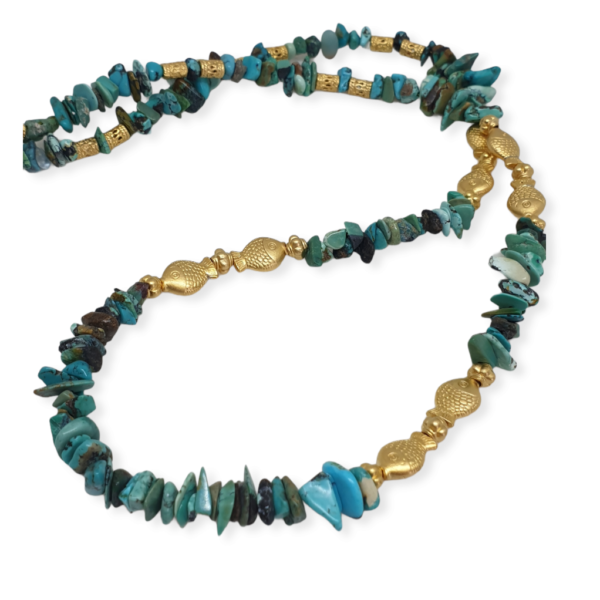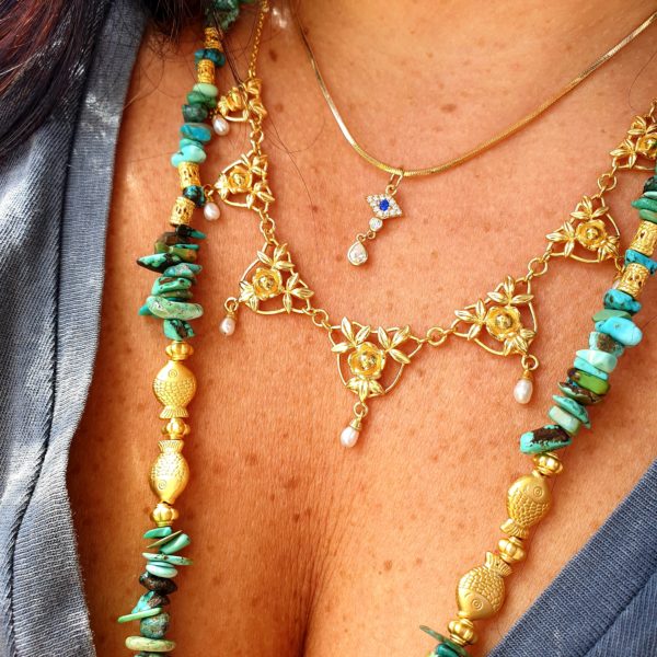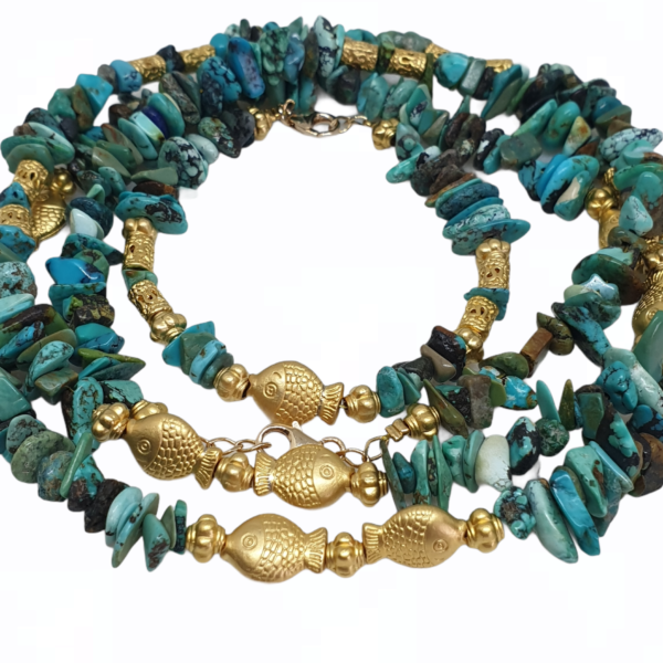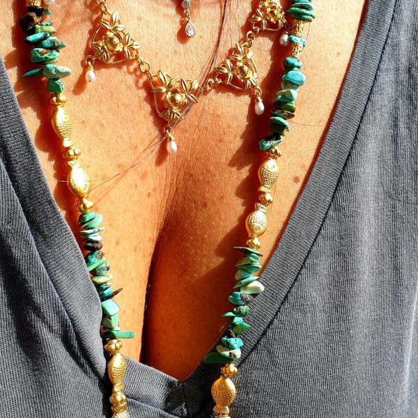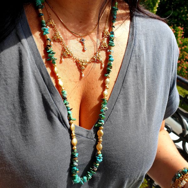 DANA est sautoir tout en perles de turquoise naturelle, et de perles plaquées or .La couleur turquoise de ces perles nous font penser eaux profondes de l’océan, et de leurs petits poissons.