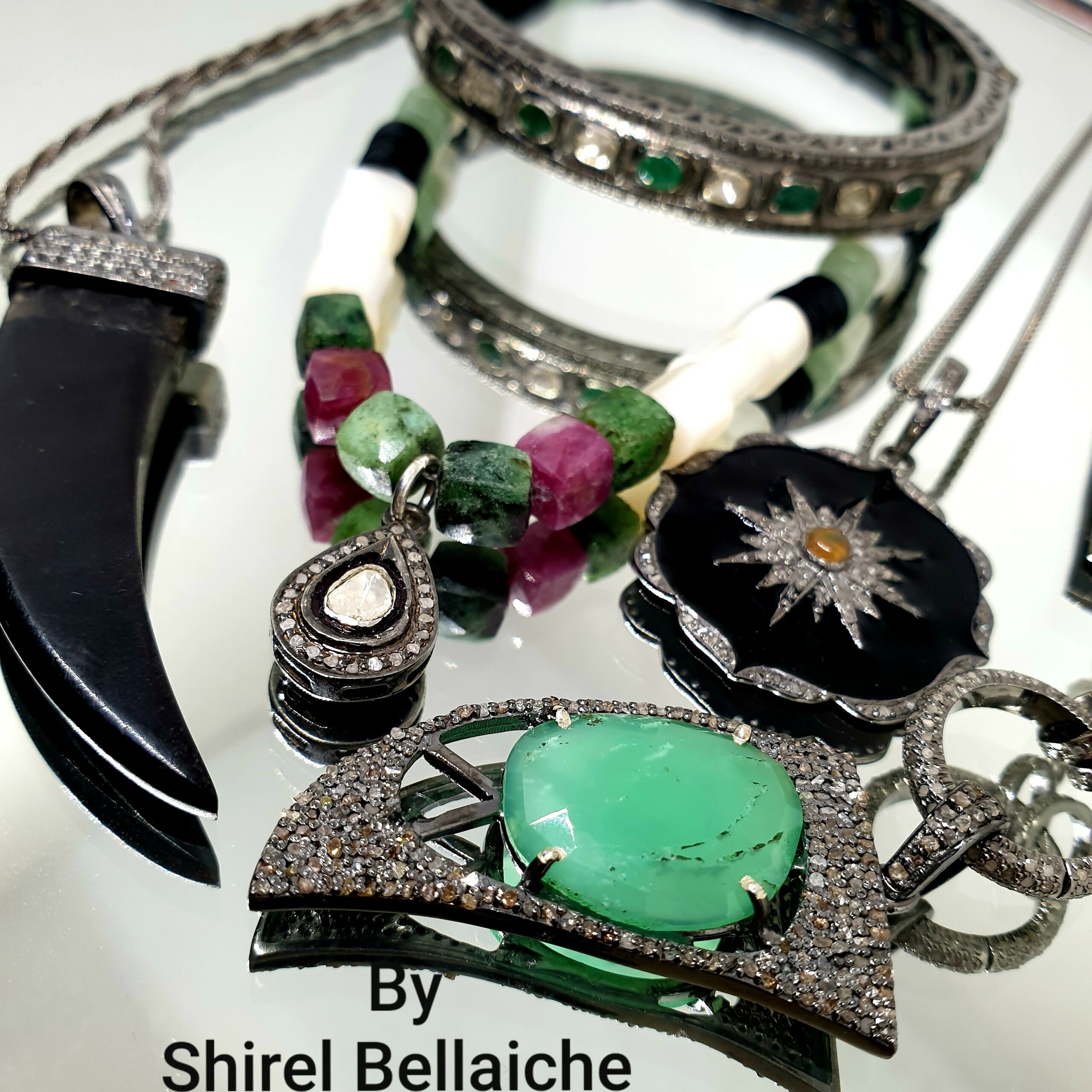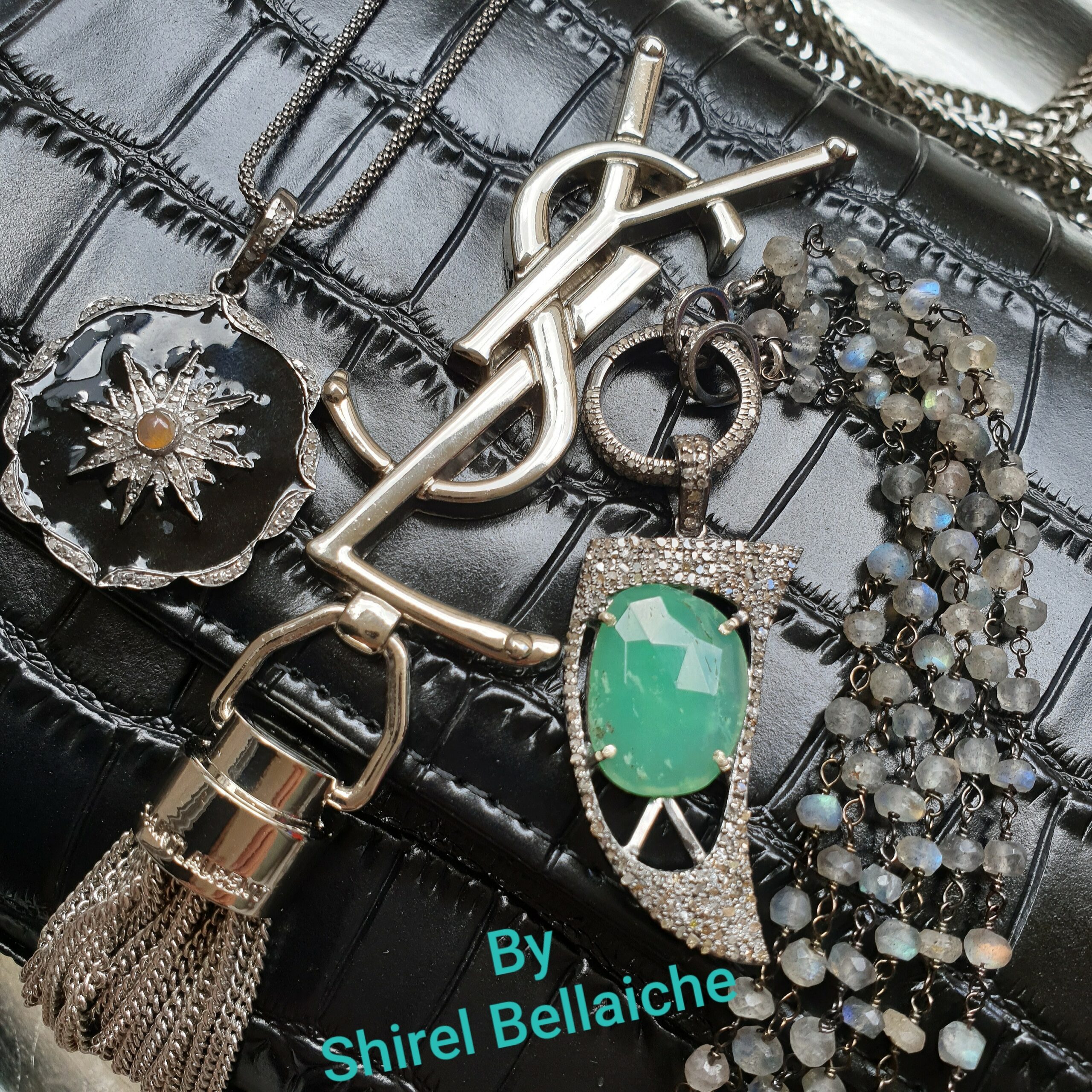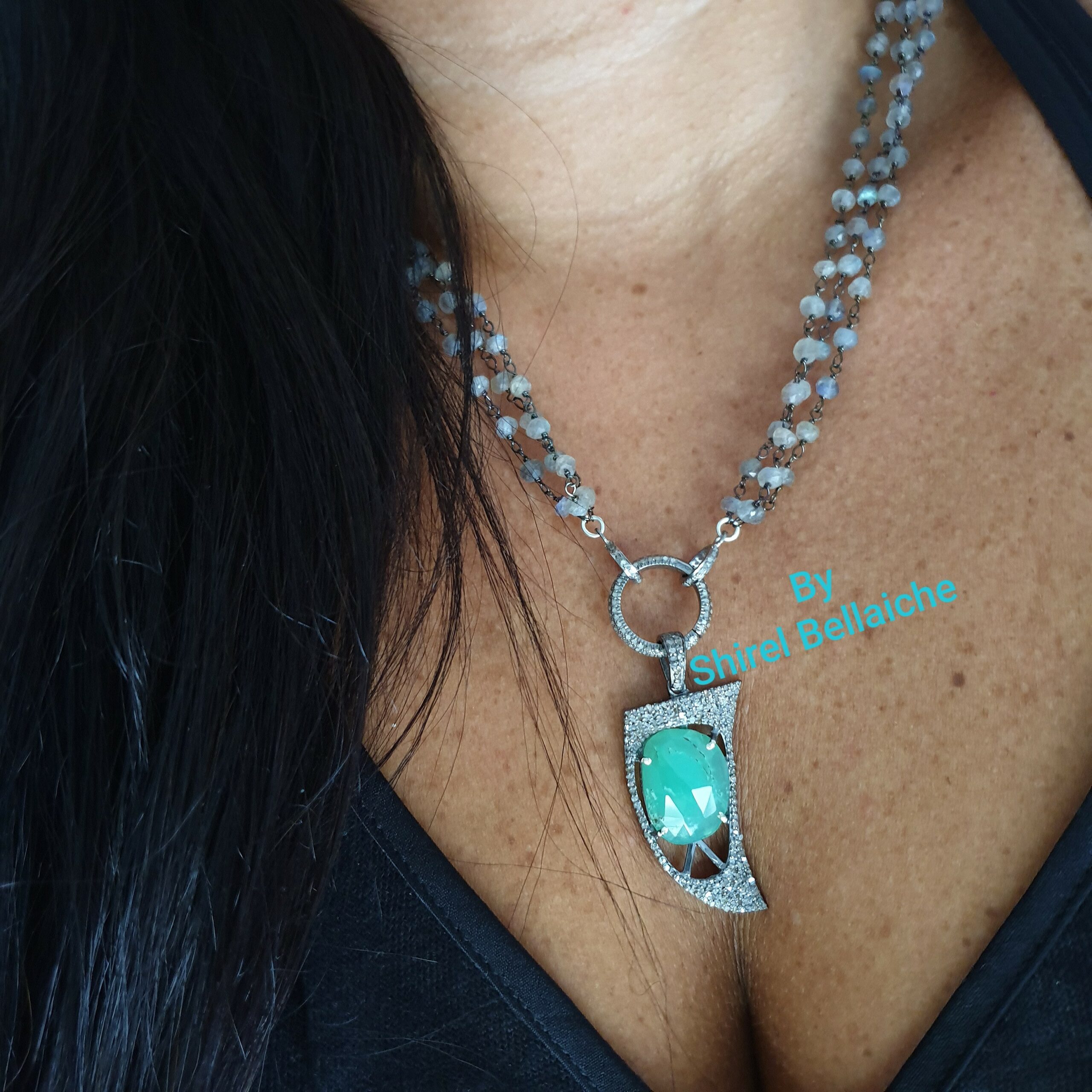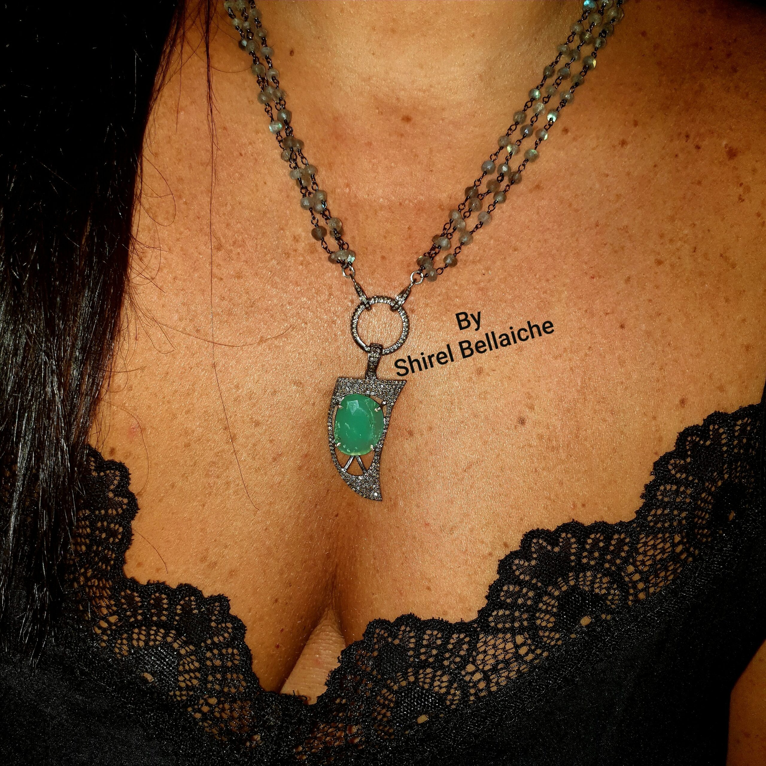 Collier en perles Labradorites, l anneau et la corne sont entièrement pavés de diamants. La pierre centrale de la corne est une Chrysoprase, le tout monté sur support argent sterling.