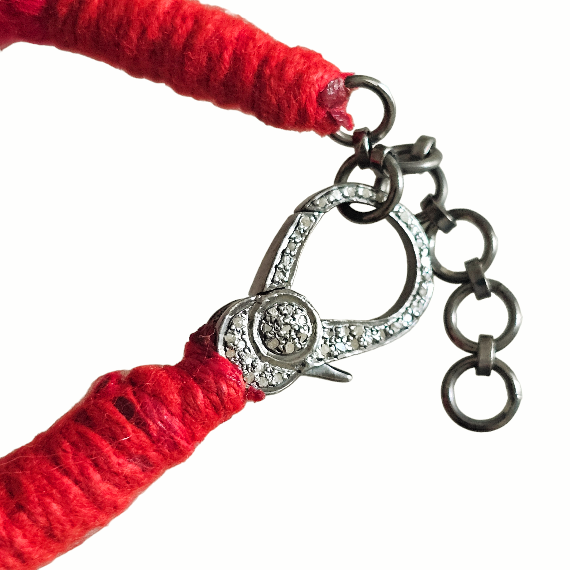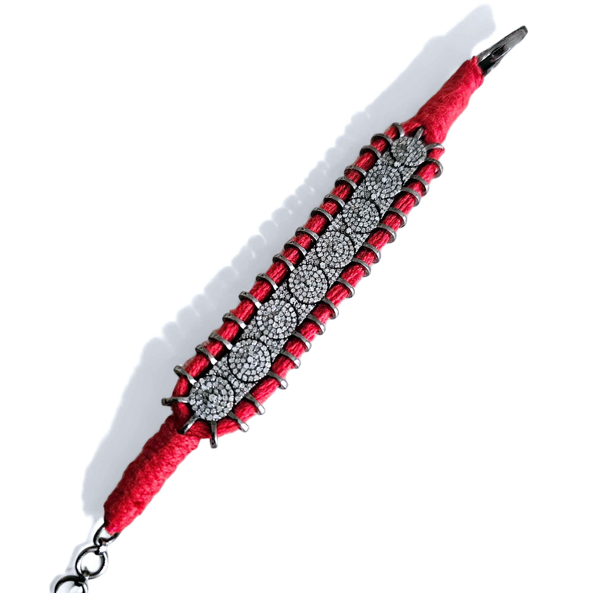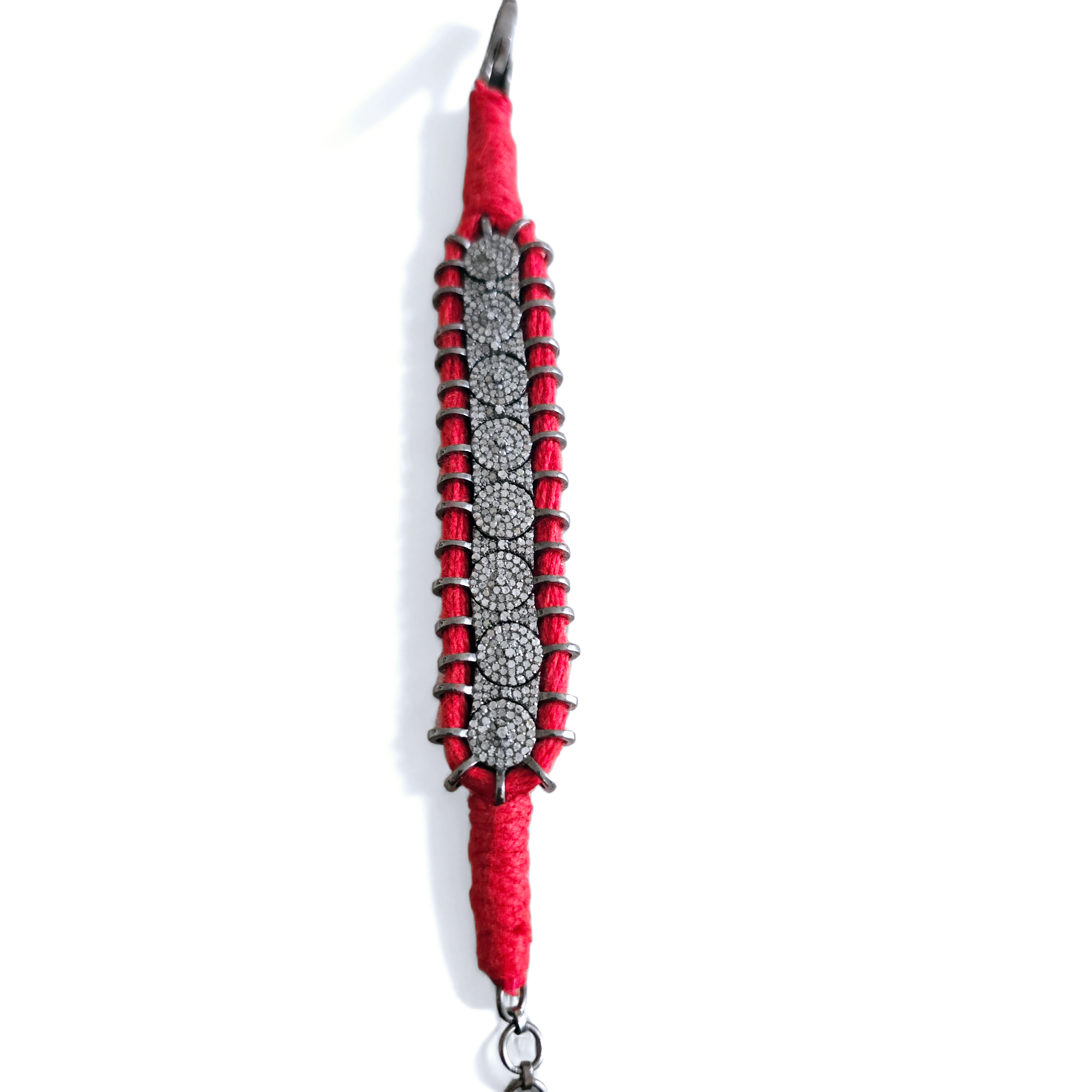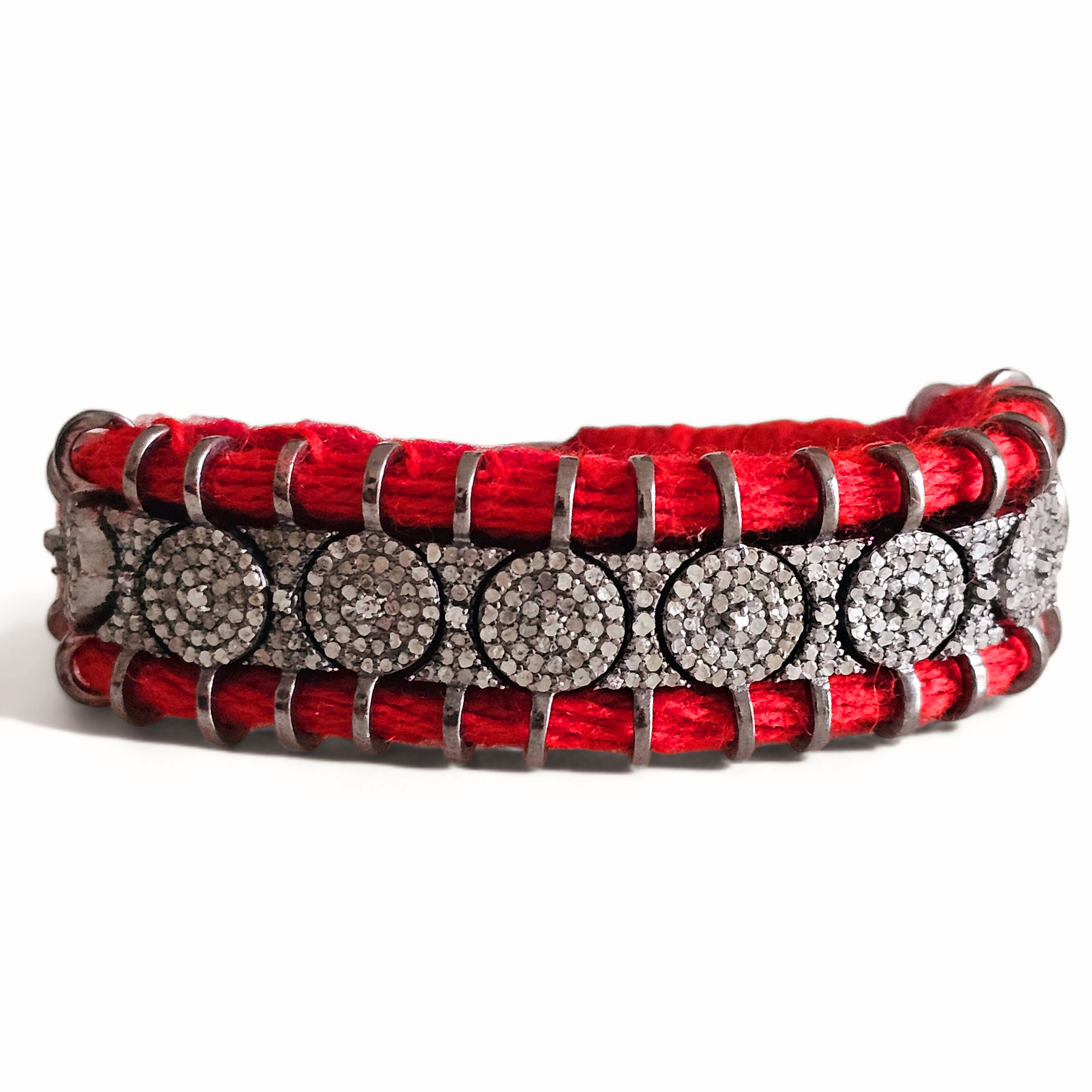 FIDJI est un bracelet en fil de coton corail, avec une structure en argent 925, formant plusieurs cercles tous complètements pavés de véritables diamants. Toute la structure est entièrement sertie de nombreux diamants. Ce qui procure à ce bracelet ethnique une tournure hautement chic et brillante d’élégance.