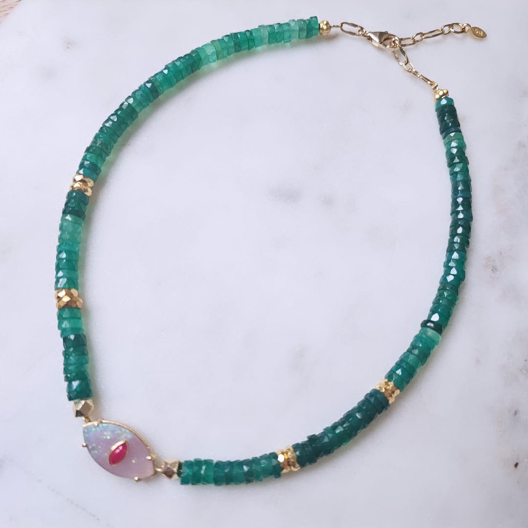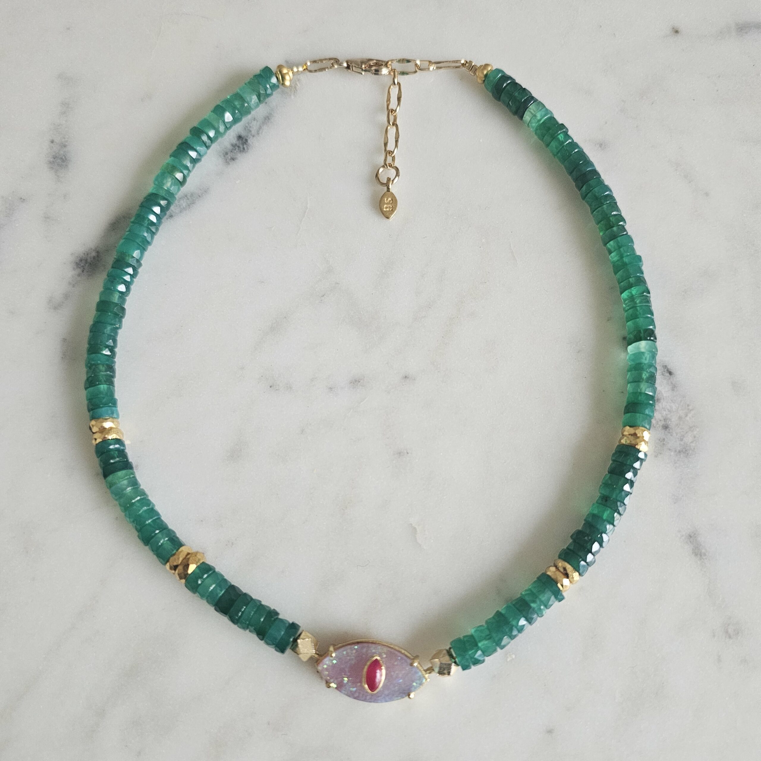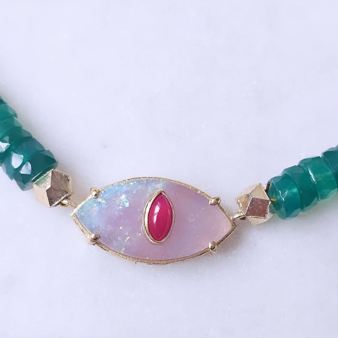 Comme son nom l’indique, cette version pierres de notre Ainara est entièrement en pierres d’onyx vert avec des nuances différentes, pyrite et plaquée or. Le Ainara au centre est en opale d’arlequin rosée.