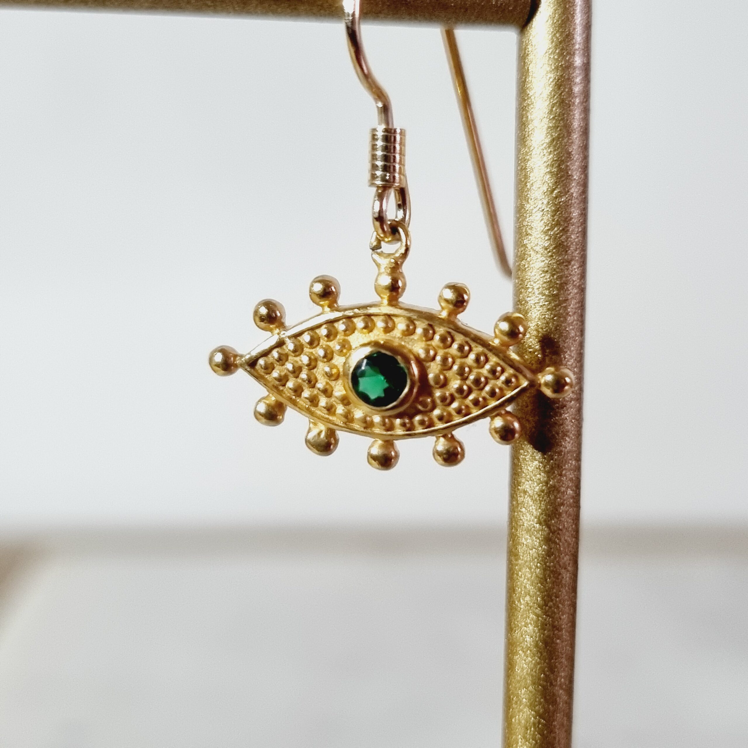 Mona mono boucle est en amazonite avec au centre un petit oeil plaqué or. La tige est en vermeil plaquée or.
