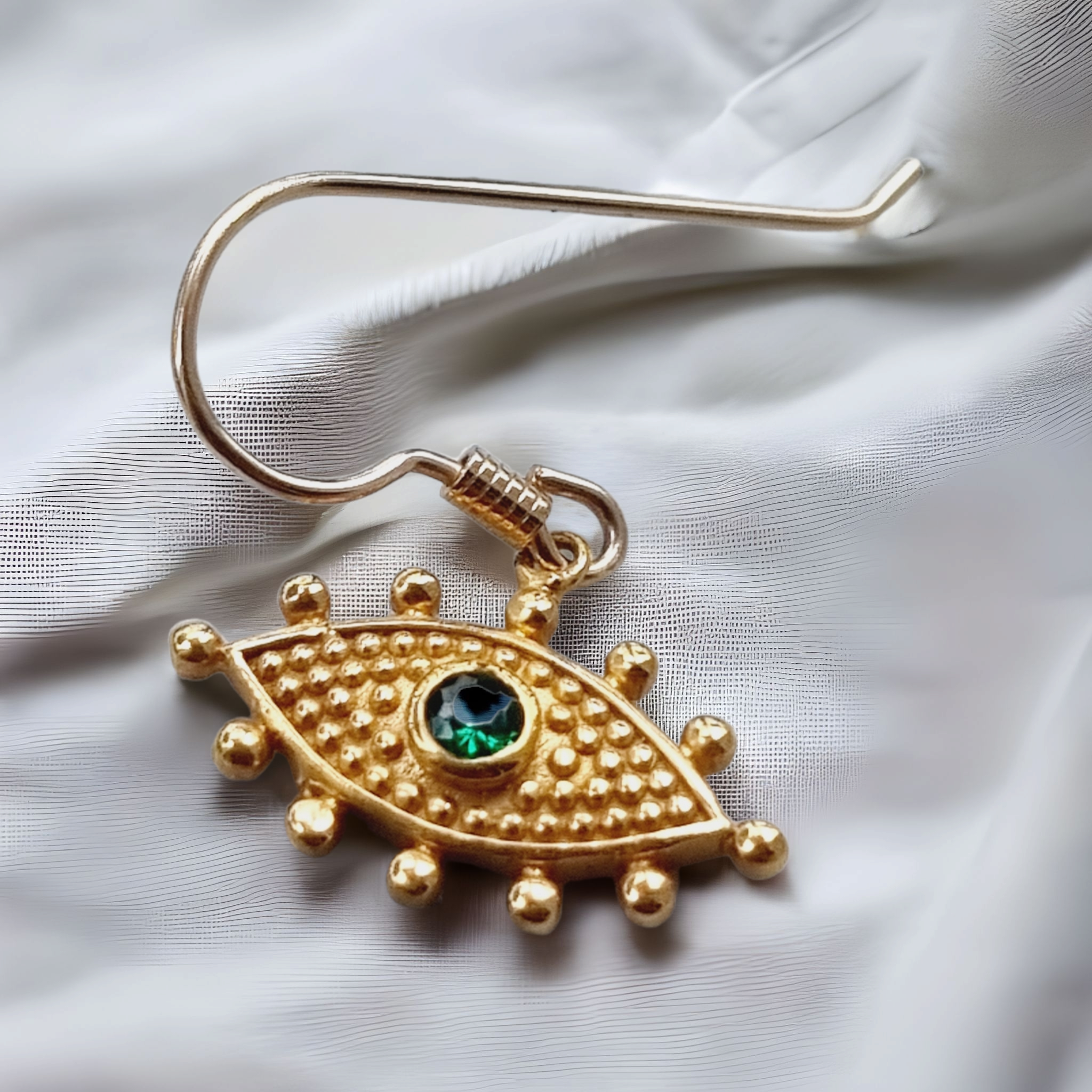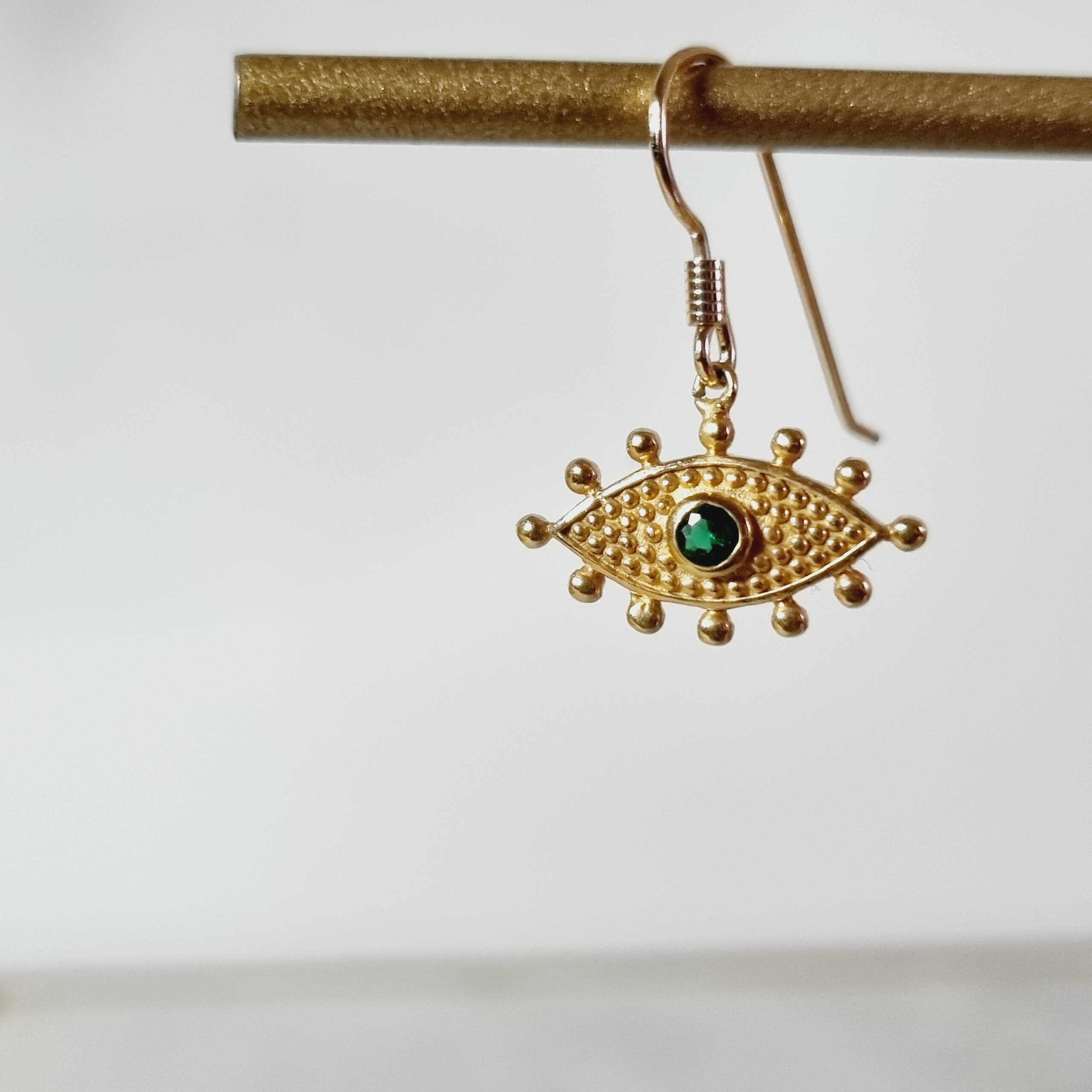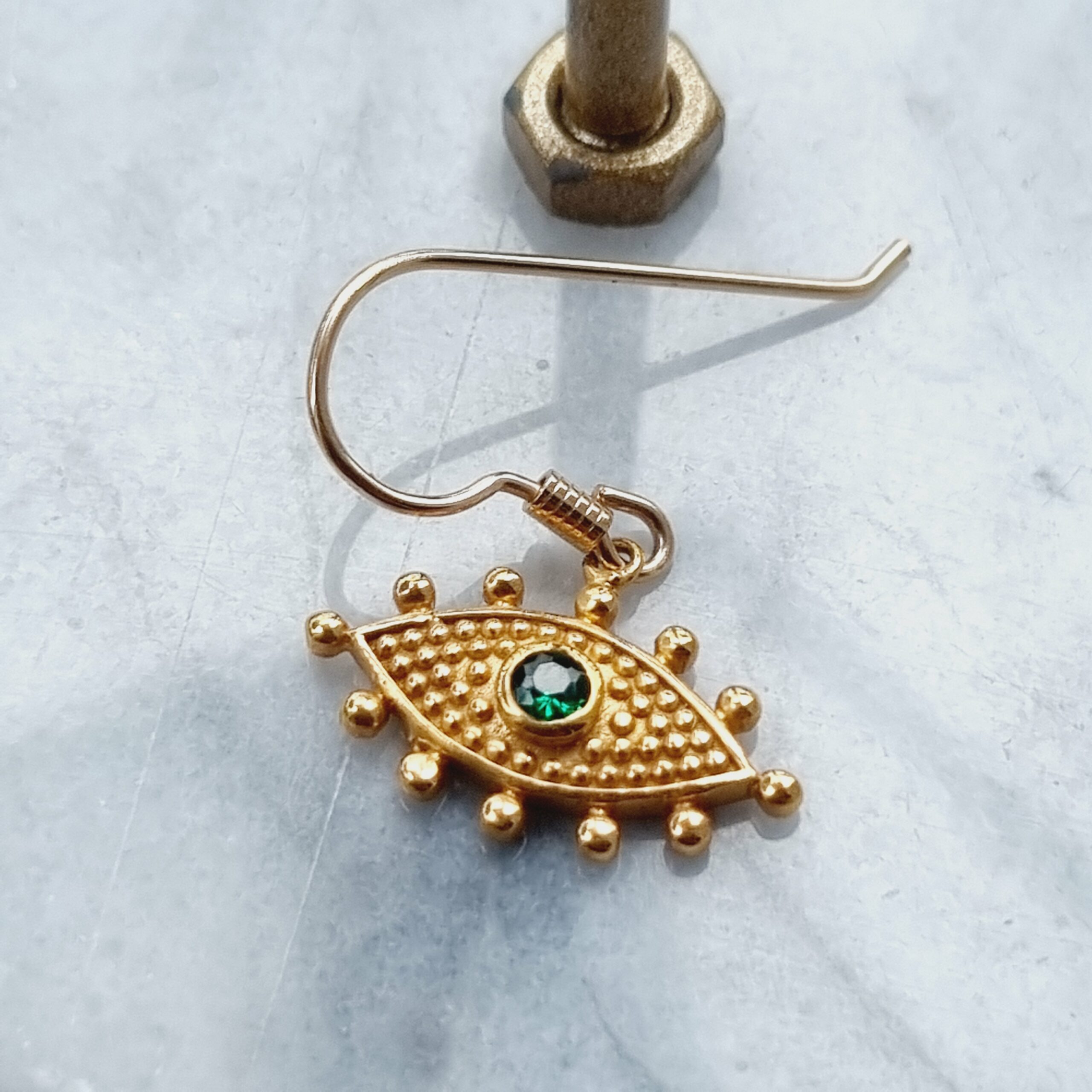IRIS est une mono boucle avec un petit oeil en argent plaqué or avec au centre un petit zircon vert.