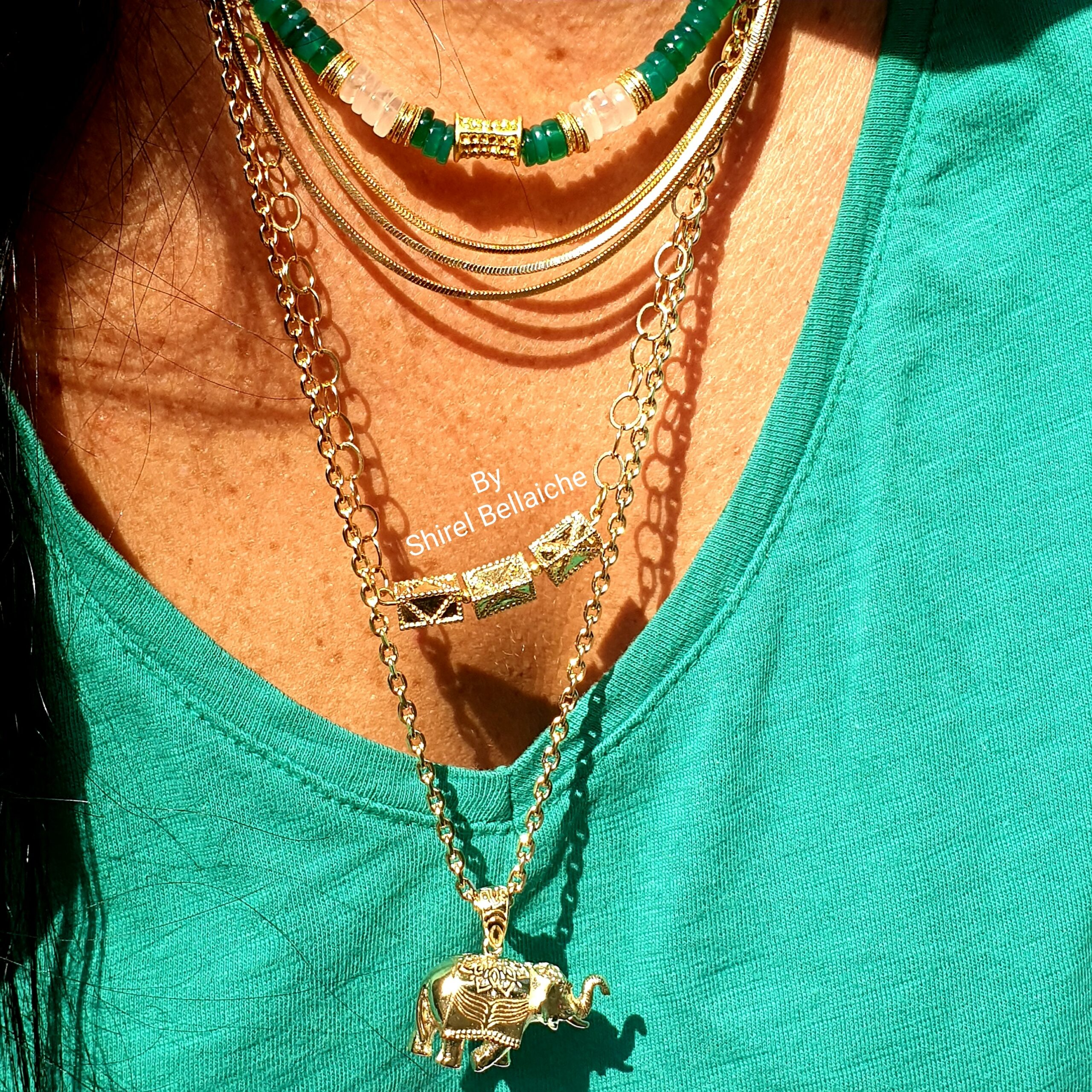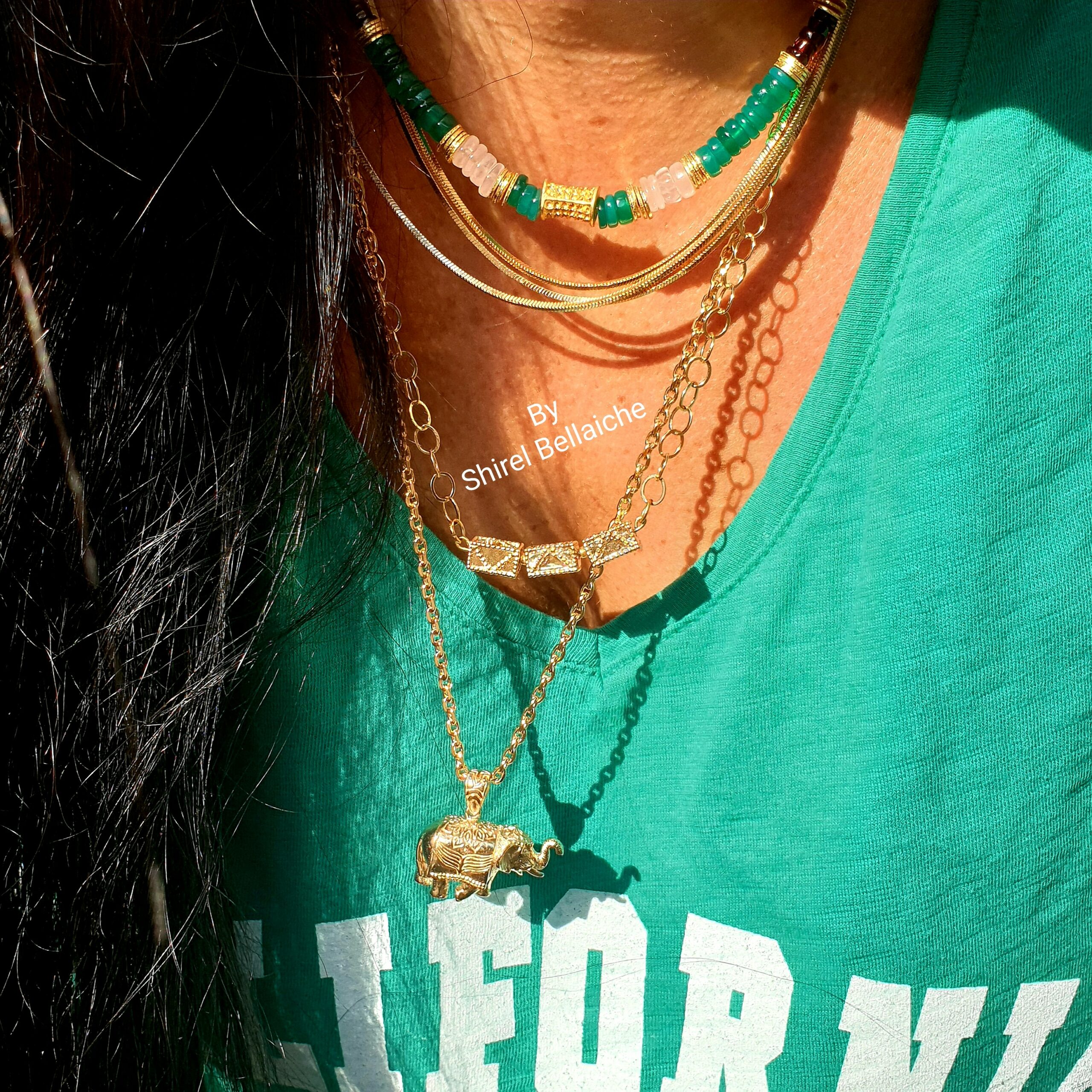 Sautoir 7 : pendentif dentrine opal pierre onyx verte serti de pierres onyx noire avec une chaine plaquée or de 50 cm