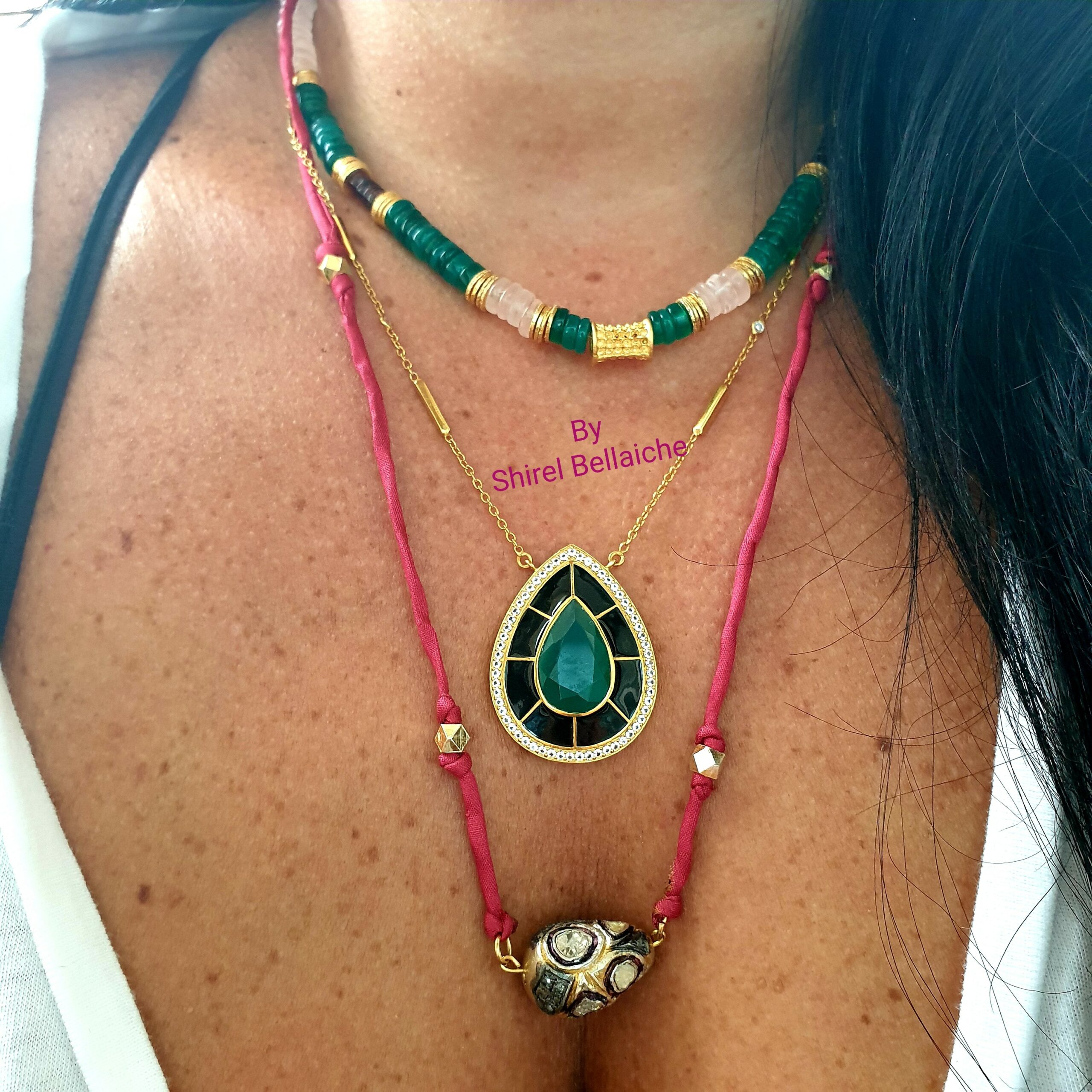 Sautoir 7 : pendentif dentrine opal pierre onyx verte serti de pierres onyx noire avec une chaine plaquée or de 50 cm