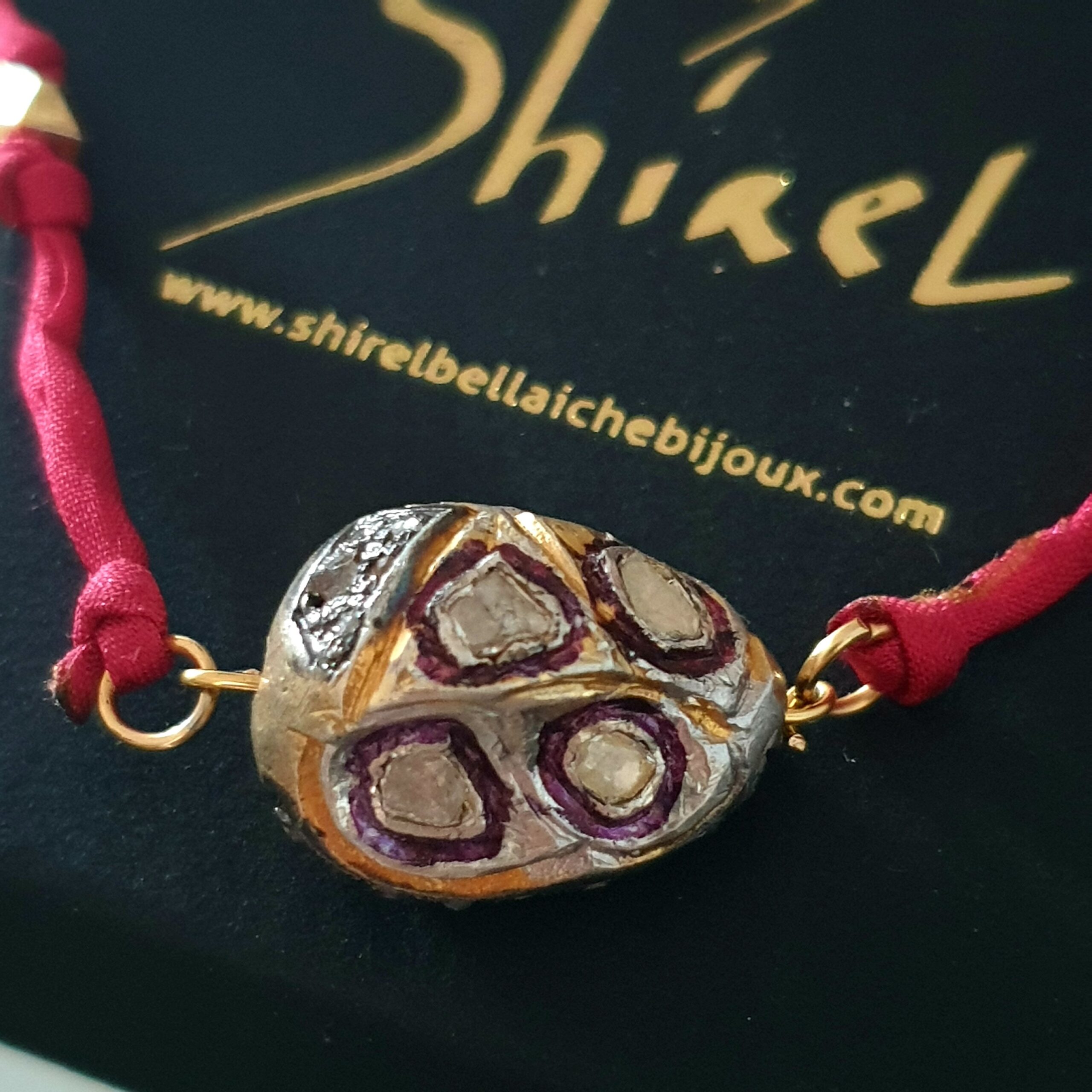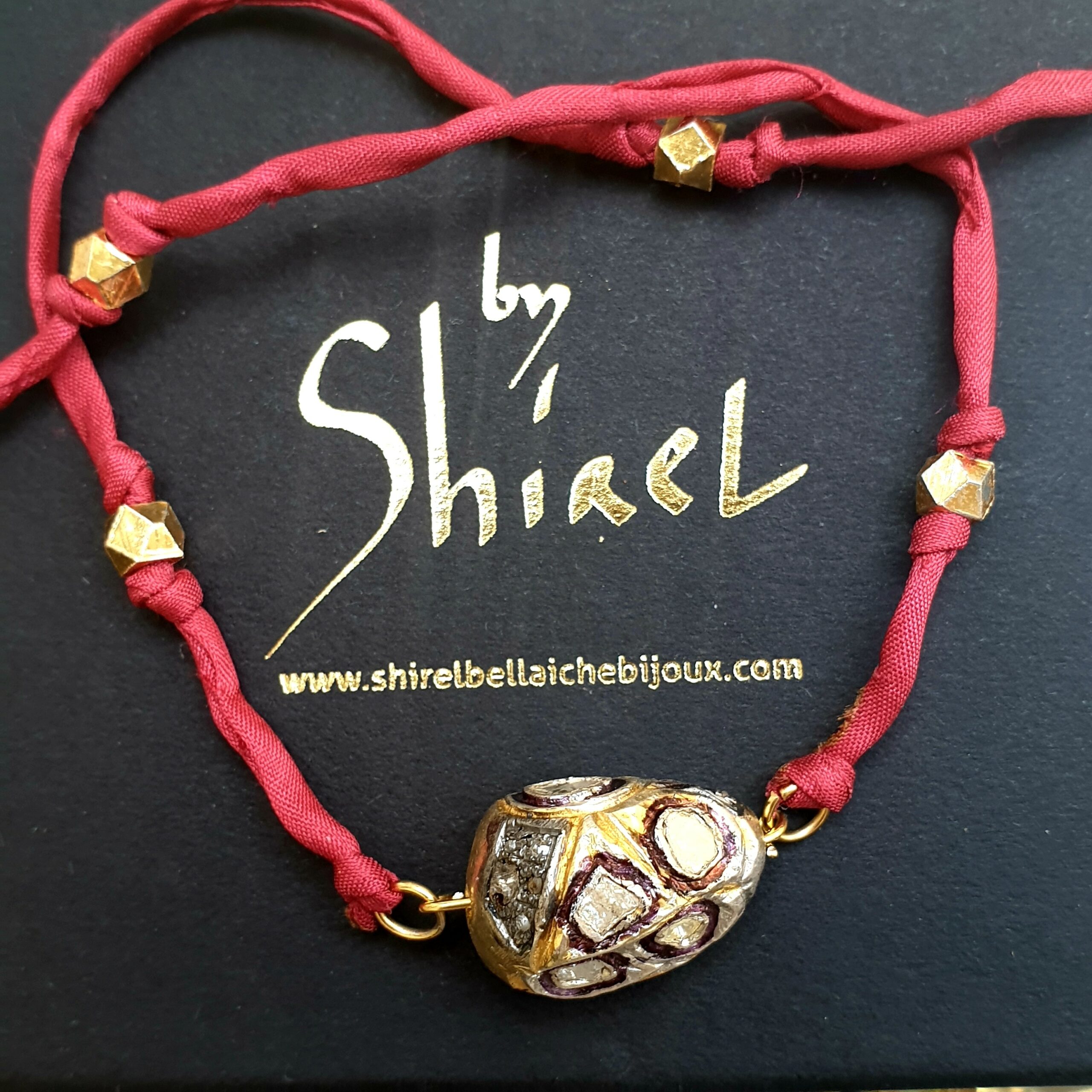 JOY est un collier composé d un cordon en soie orné de perles plaquées or et d un pendentif en vermeil entièrement pavé de polki diamond.