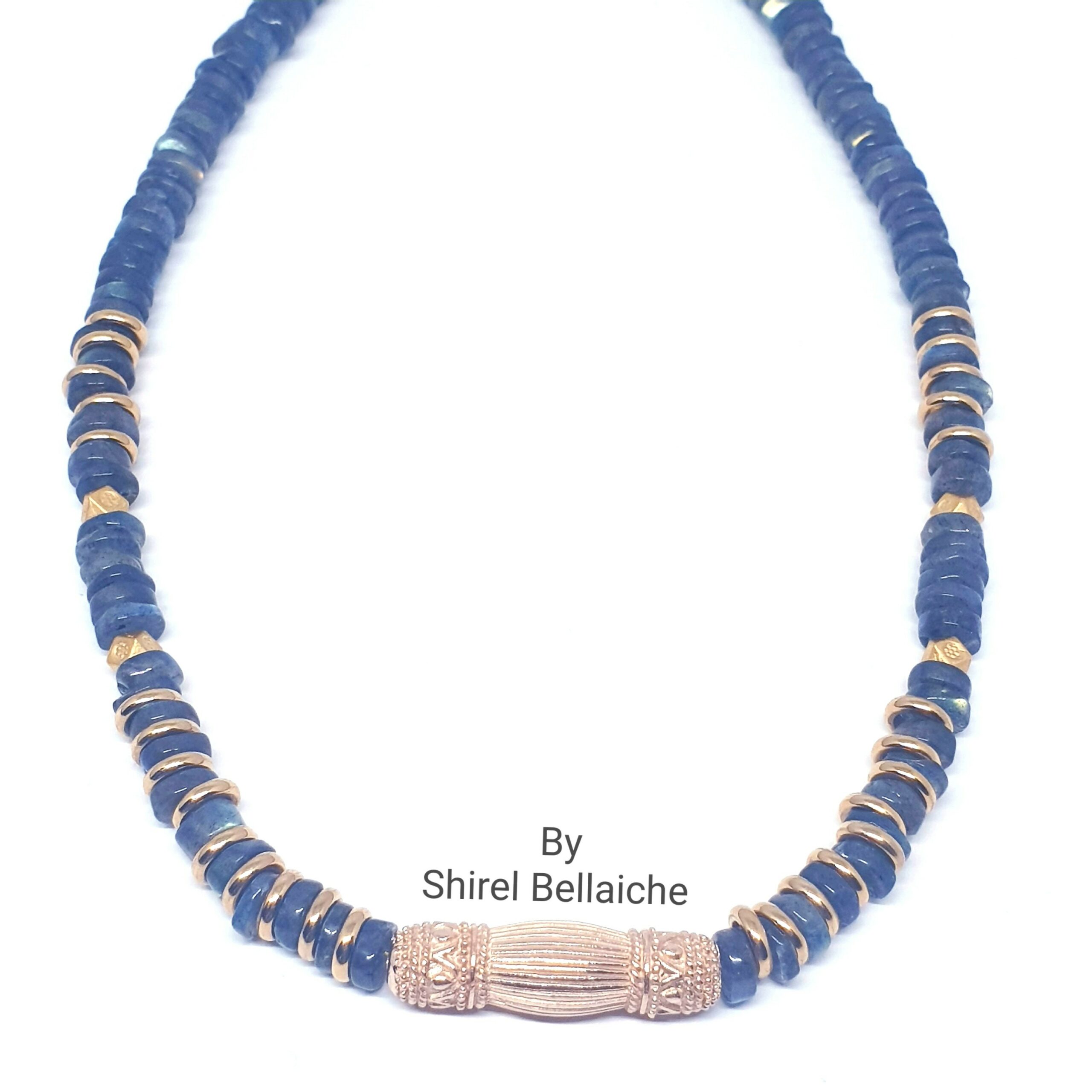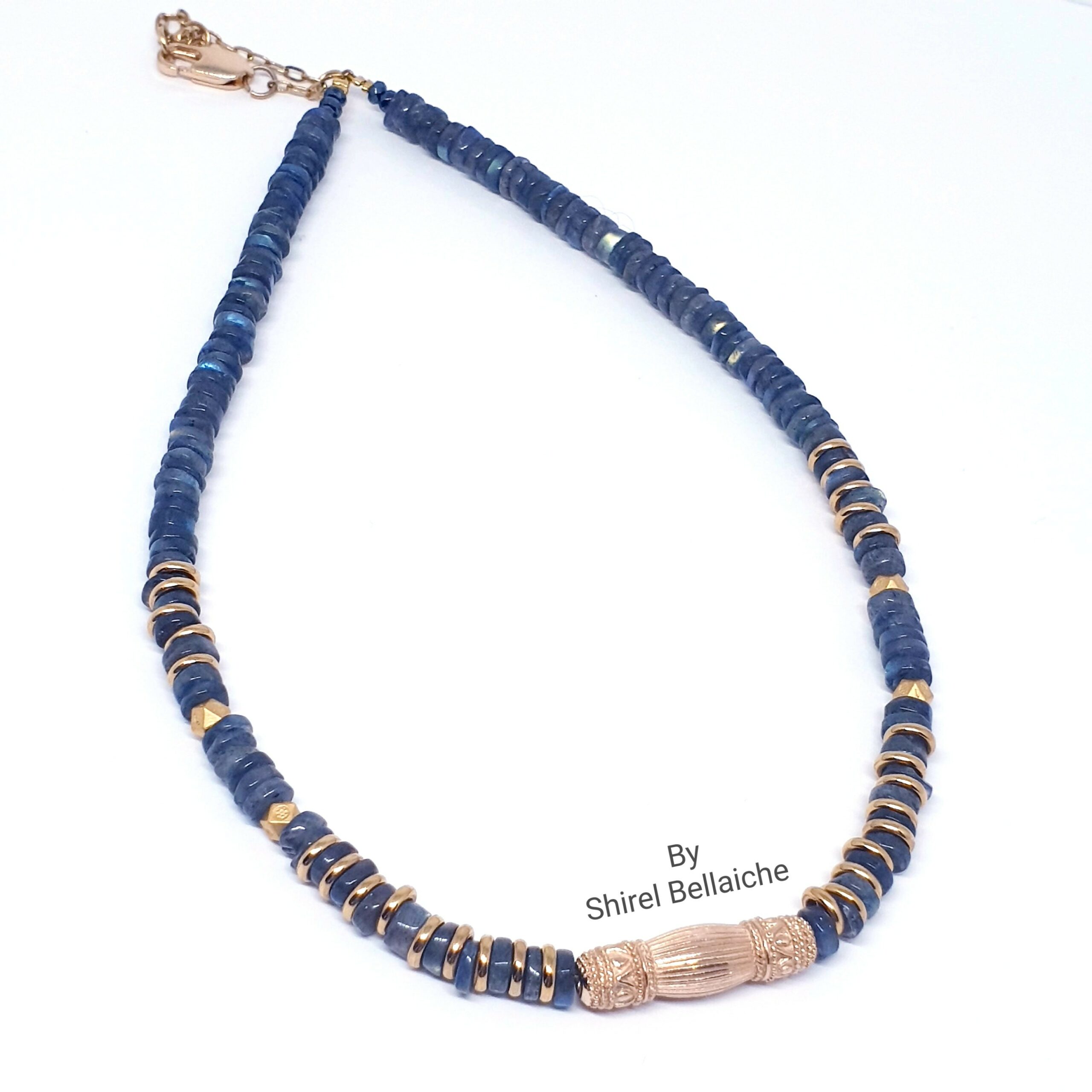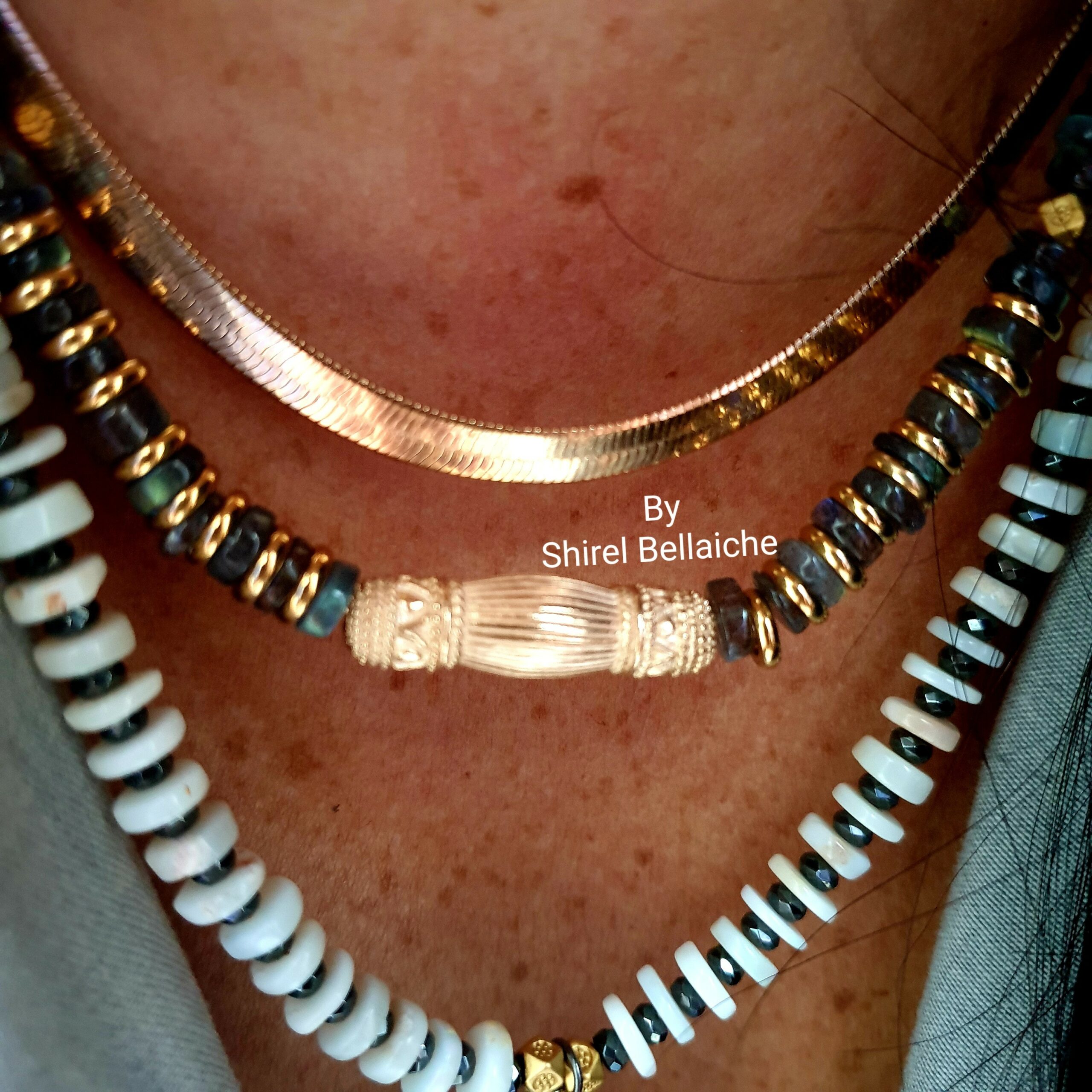 LIVIA est un collier tout en labradorite et perles plaquées or, avec au centre une perle tube plaquée or 3 microns.